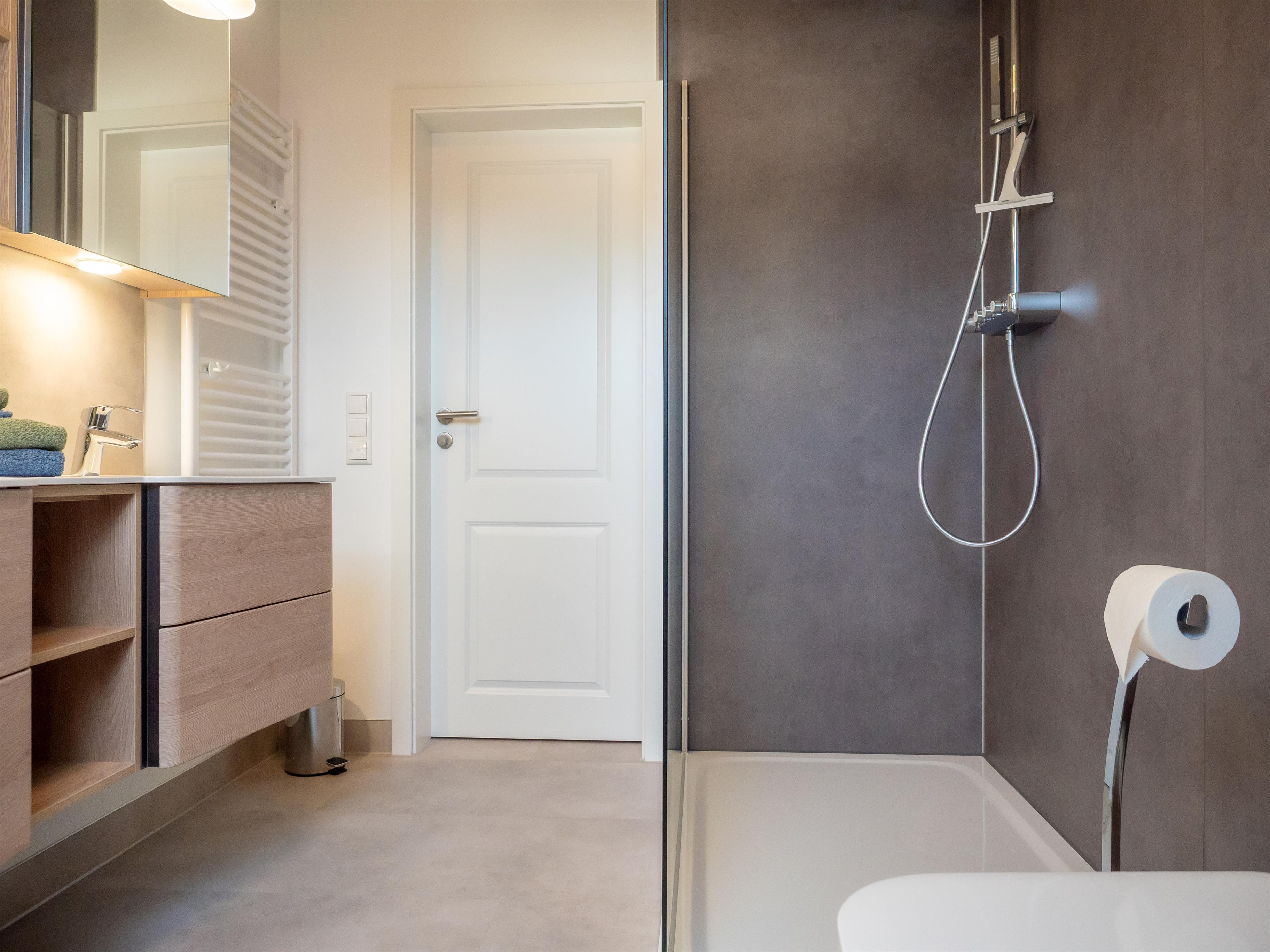 Das Badezimmer verfügt über eine Dusche und einen Haartrockner.