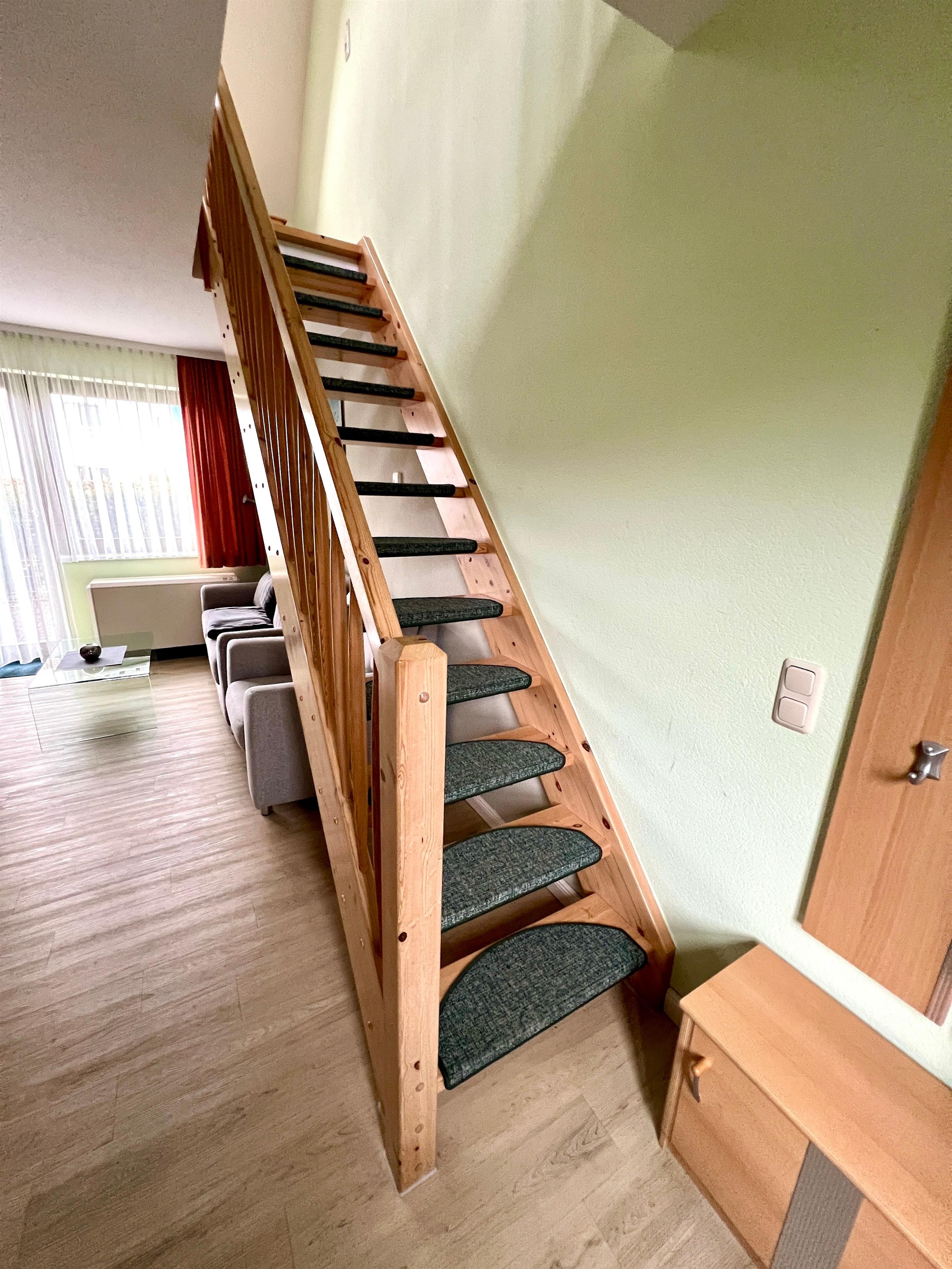 WC mit Duschkabine ist auch unten. Über eine ausreichend breite Treppe geht es in den Schlafbereich. Ein großzügiges gemütliches Doppelbett und ein bei Bedarf aufklappbares Einzelbett warten hier auf Sie.