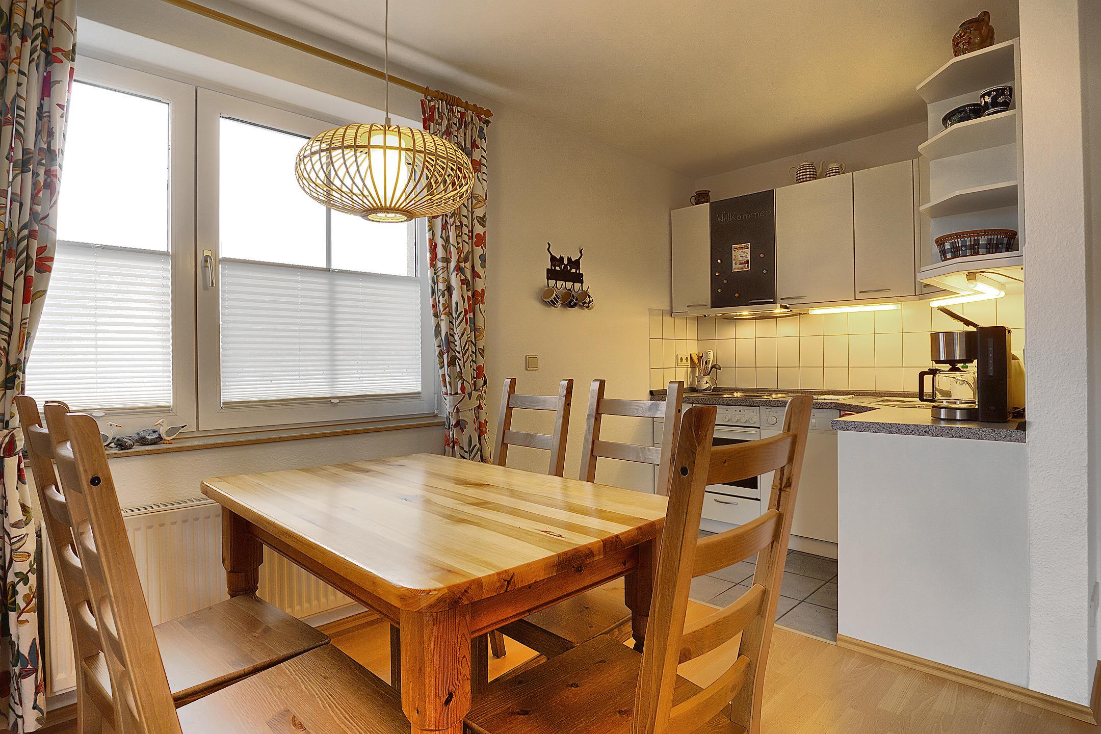 Die Küche ist mit Kochfeld, Backofen, Abzugshaube, Geschirrspüler, Kühl-Gefrierkombination, Kaffeemaschine und Wasserkocher ausgestattet.