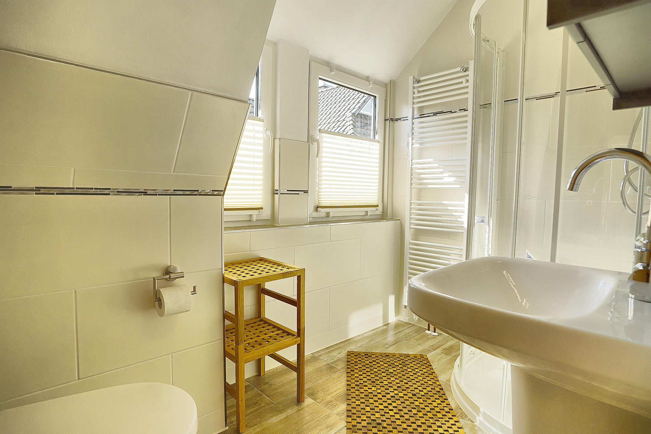 gemütliche Ferienwohnung im Obergeschoss mit einer steilen Innentreppe, einem Wohnzimmer mit kleiner Küchenzeile und einem Schlafzimmer sowie Dusche/WC für 2 Personen, Balkon nach Osten mit Elektrogrill und Balkonmöbeln