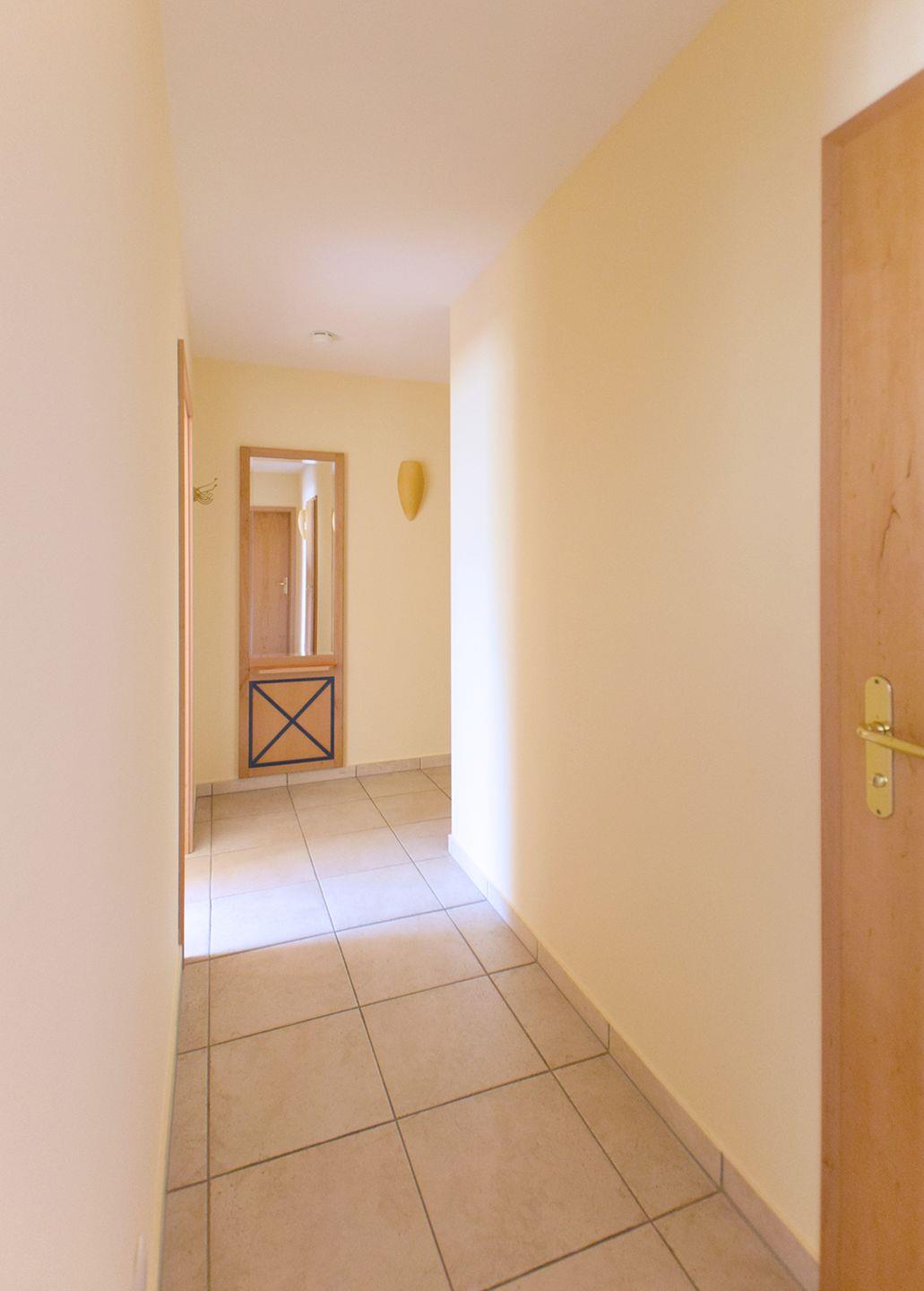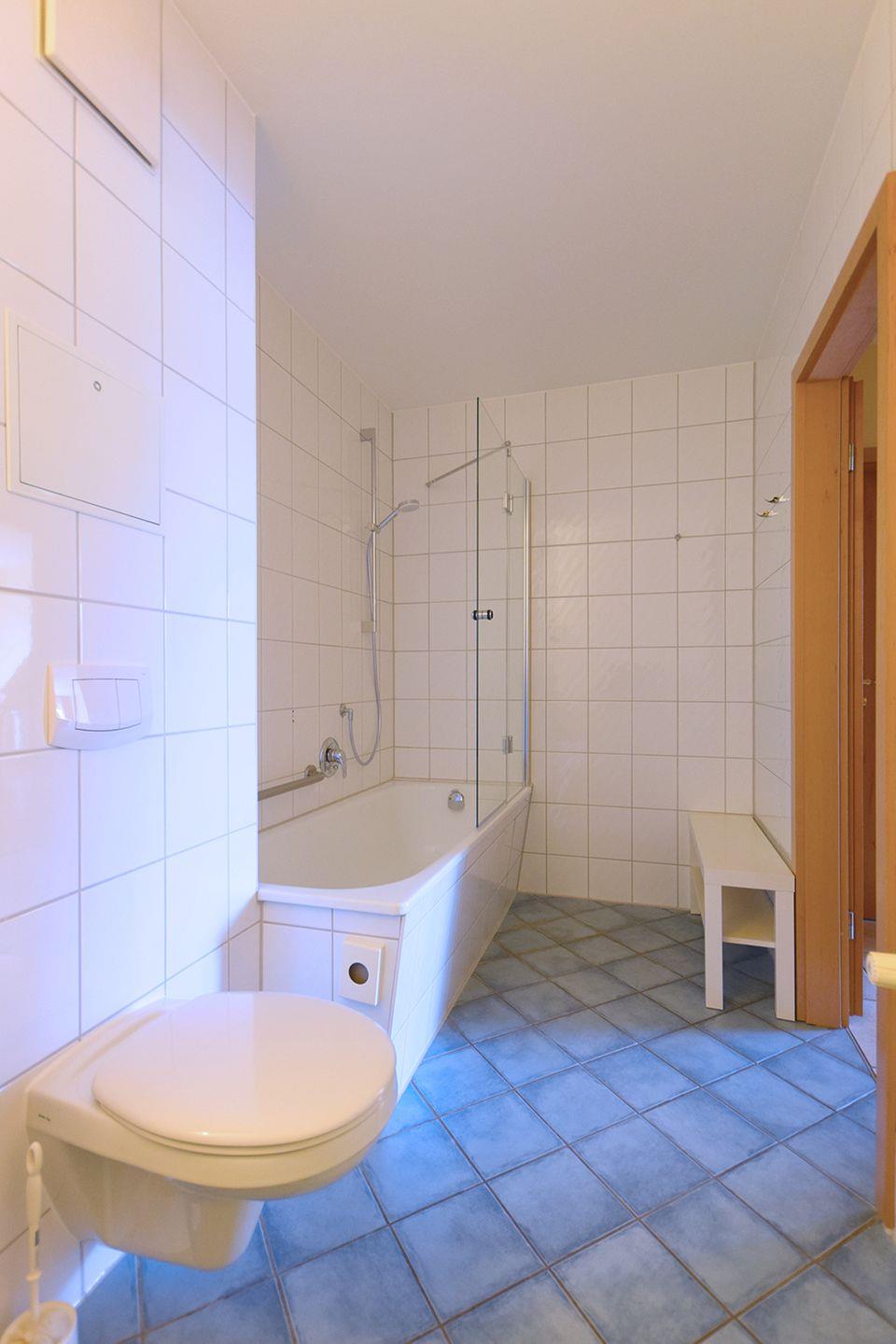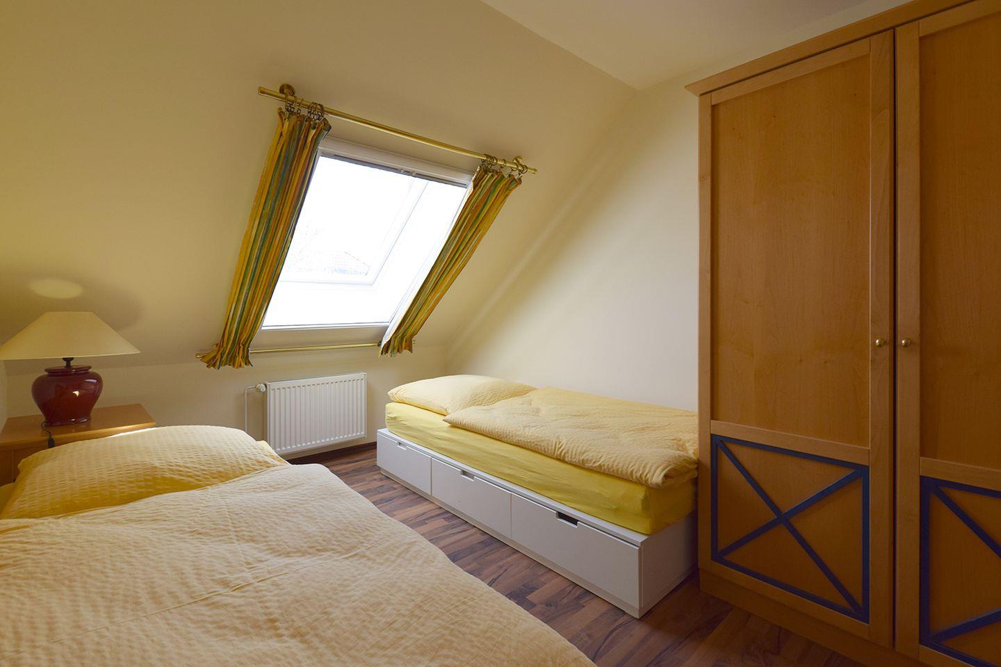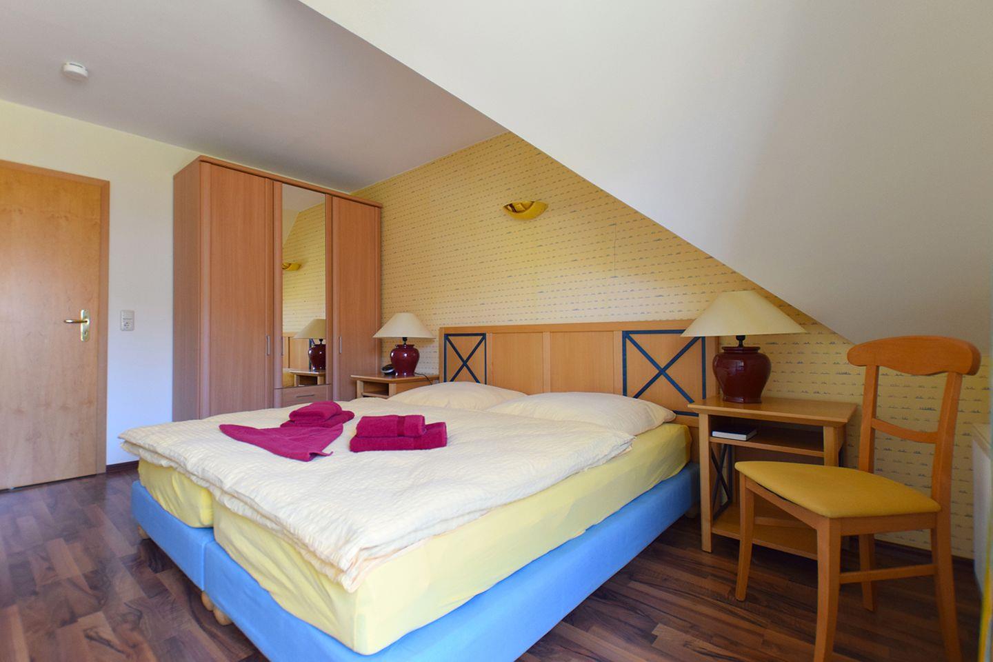 Die Wohnung bietet zwei Schlafzimmer: Das erste Schlafzimmer ist mit einem Doppelbett (200 x 200 cm) ausgestattet, das zweite Schlafzimmer mit zwei Einzelbetten (90 x 200 cm). Ein Badezimmer mit Badewanne und WC rundet das Angebot ab.