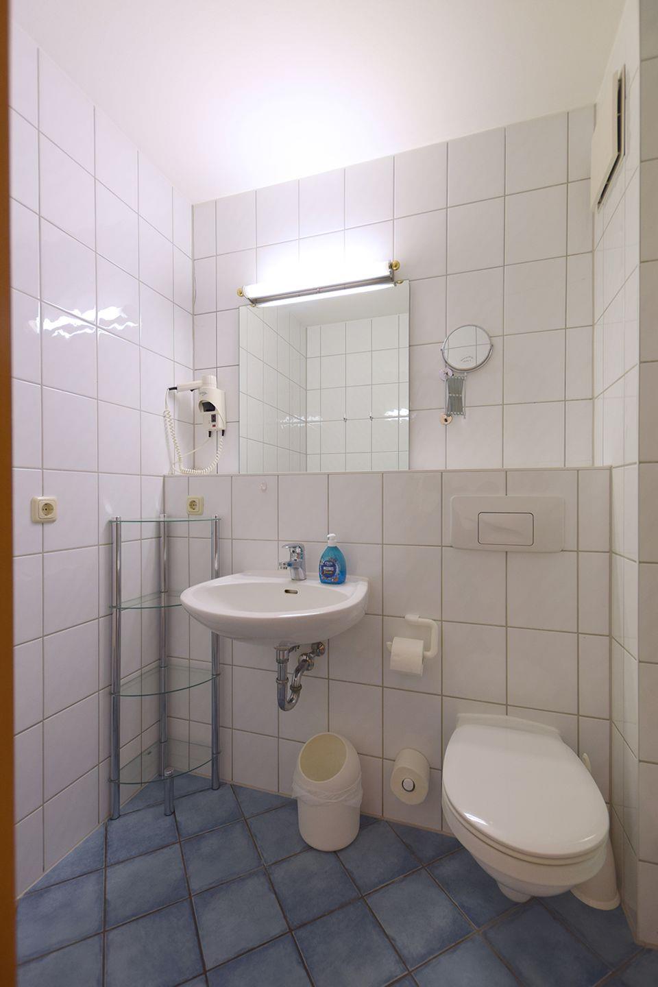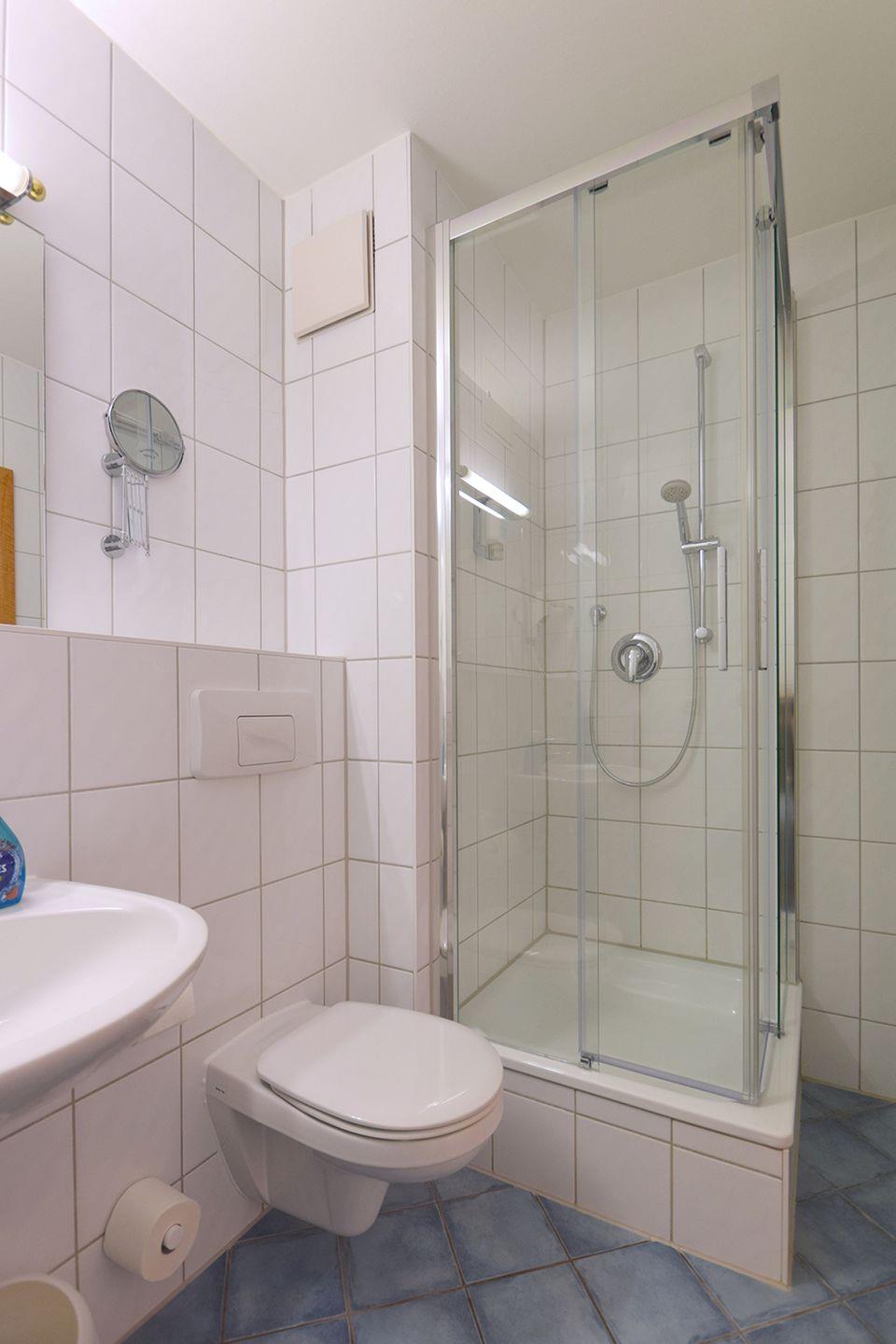Das Badezimmer ist mit einer Dusche, einem WC und einem Waschbecken ausgestattet.