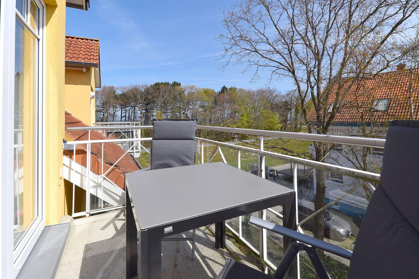 Der Balkon, der nach Osten ausgerichtet ist, lädt mit Gartenmöbeln zum Verweilen ein.