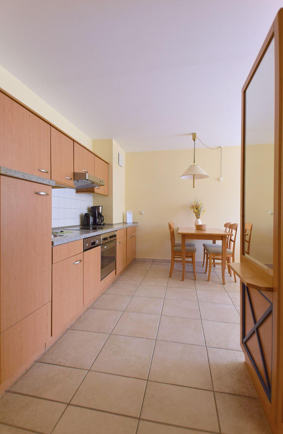 Diese gemütliche Ferienwohnung für bis zu 2 Personen befindet sich im 2. Obergeschoss eines modernen Hauses und bietet eine Wohnfläche von ca. 48 m². Ein Fahrstuhl ermöglicht den bequemen Zugang zur Wohnung. Der Wohnbereich ist mit einer komfortablen Sitzgarnitur, SAT-TV und einem Radio ausgestattet. Der Essbereich bietet Platz für 4 Personen. Die integrierte Küchenzeile enthält alle wichtigen Geräte wie einen Kühlschrank mit Gefrierfach, ein Cerankochfeld, einen Backofen, Geschirrspüler, Kaffeemaschine, Toaster und Wasserkocher – ideal für die Zubereitung kleiner Mahlzeiten.