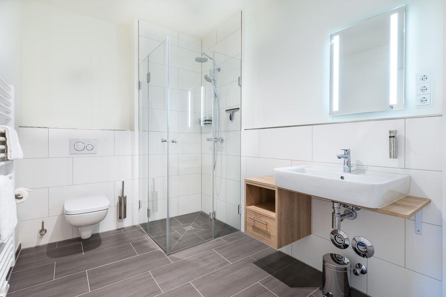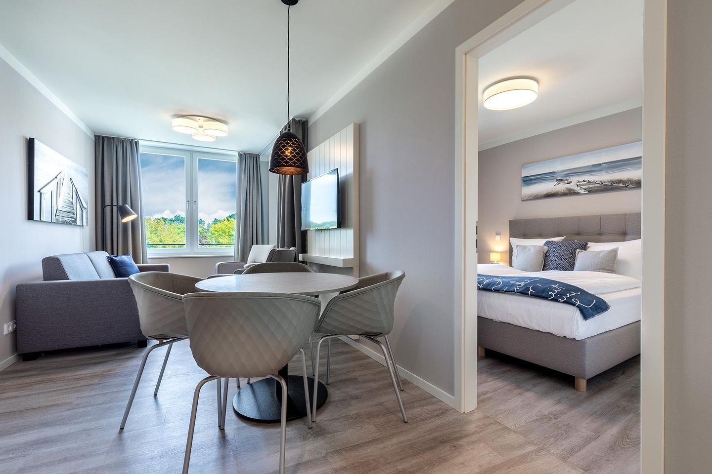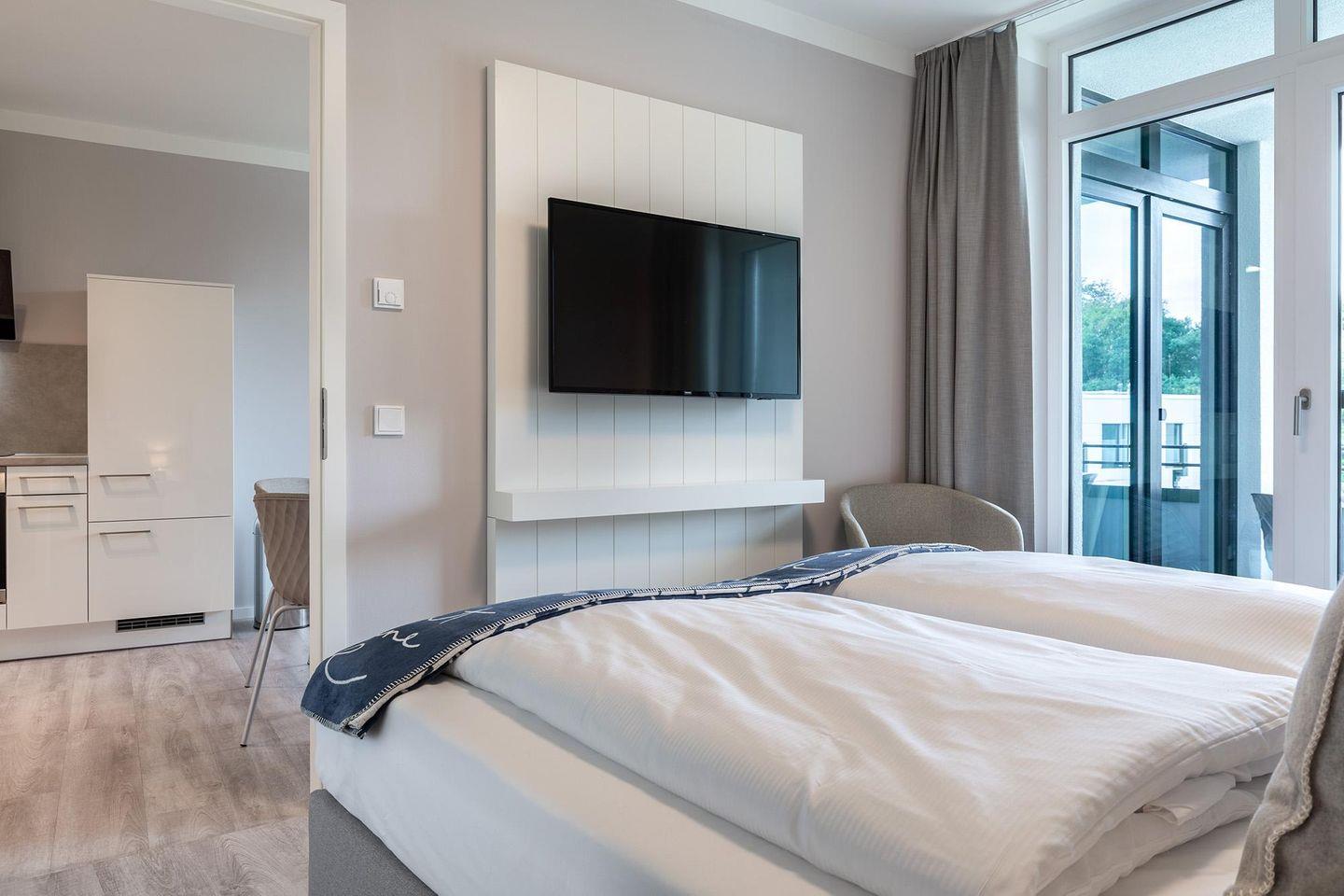 Das helle und moderne Nichtraucher-Apartment verfügt über Fußbodenheizung, sonnenschutzverglaste, bodentiefe Fenster, kostenfreies WLAN und eine voll ausgestattete offene Küche mit Geschirrspüler, Gefrier- und Kühlschrankkombination, Kaffeemaschine, Toaster, Wasserkocher, Eierkocher, Mikrowelle, Herd mit Glaskeramikkochfeld und Backofen sowie über einen behaglichen Wohn-Essbereich. Im Wohnbereich befindet sich eine Doppelschlafcouch (1,40 x 2,00 m) und ein SMART-TV (43 Zoll). Im separaten Schlafzimmer genießt ihr hohen Komfort durch ein modernes Boxspringbett (1,80 x 2,00 m) und einen zweiten SMART-TV (43 Zoll). Im stilvollen Badezimmer stehen euch eine ebenerdige Dusche, WC, Waschtisch mit Föhn, Handtuchheizkörper und Fußbodenheizung zur Verfügung. Entspannte, sonnige Stunden verbringt ihr auf der überdachten und mit Gartenmöbeln ausgestatteten Loggia. Die Loggia ist sowohl vom Wohnbereich als auch vom Schlafzimmer aus zugänglich.