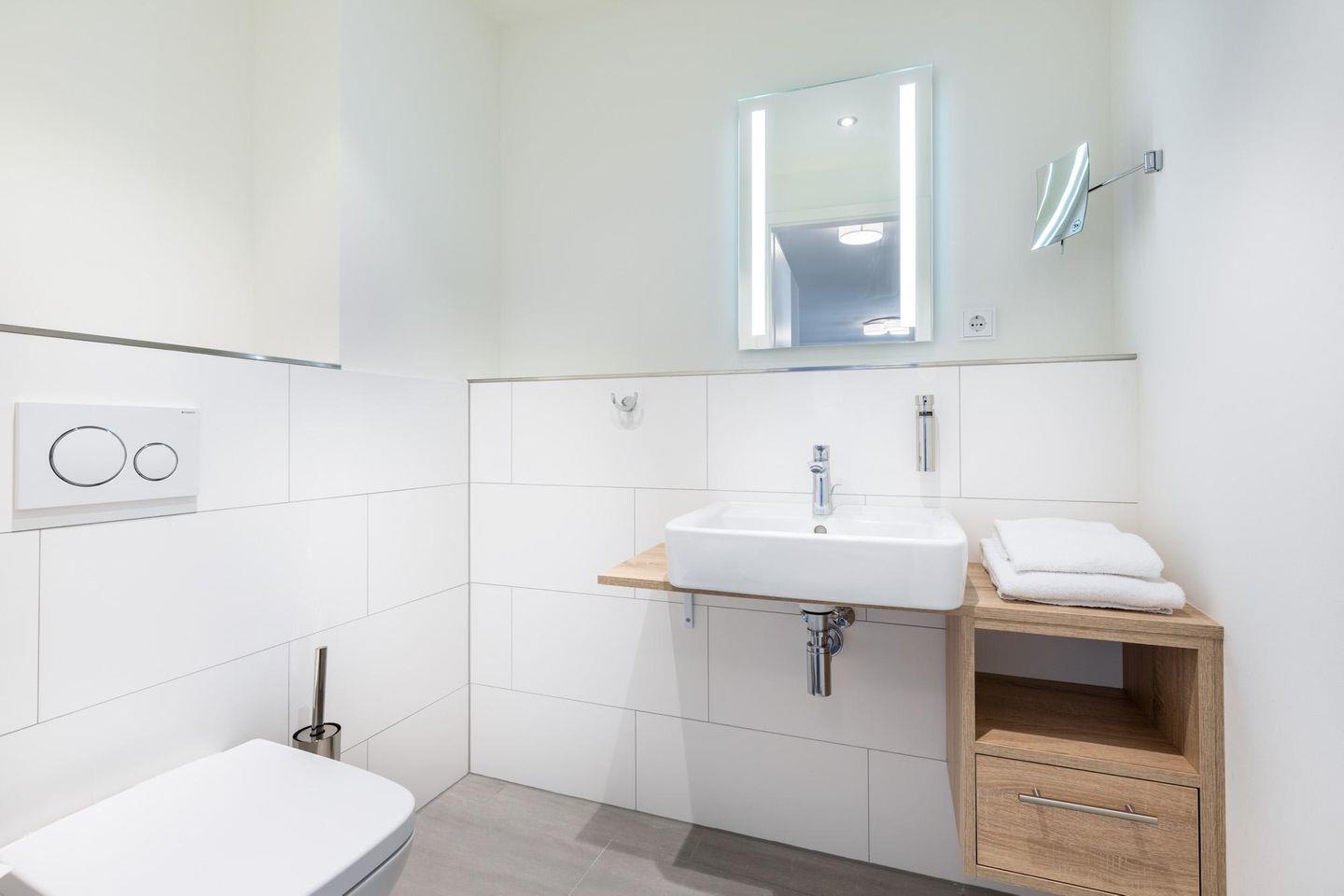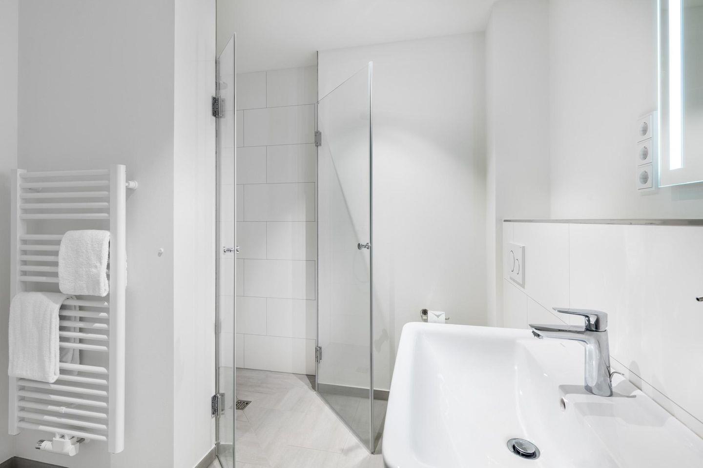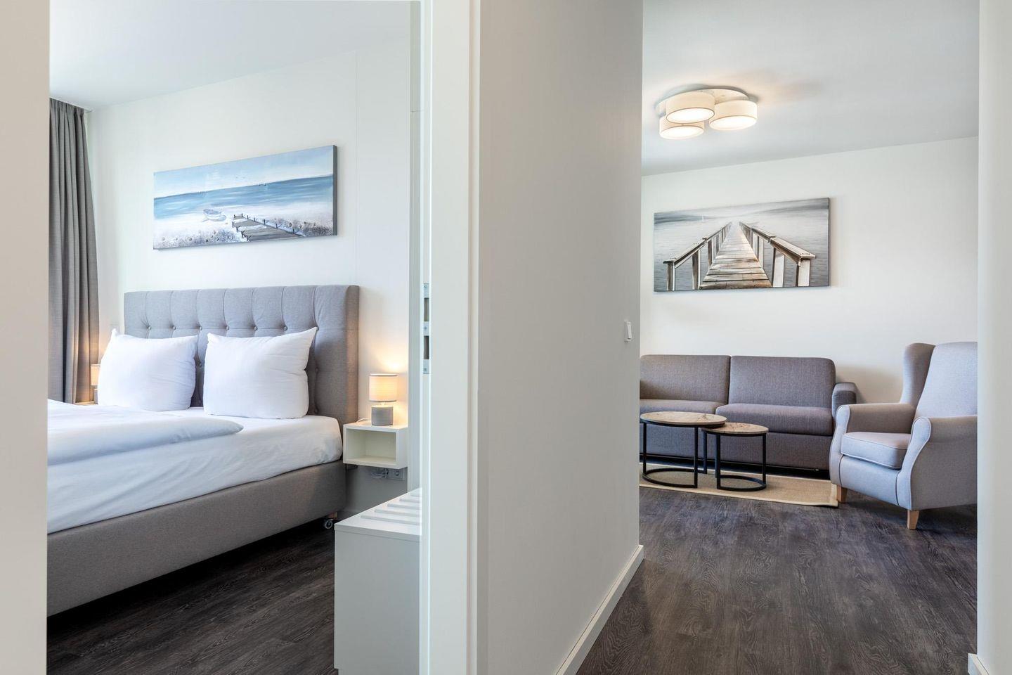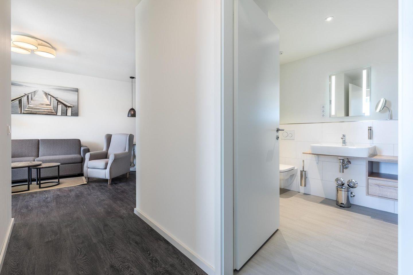 Das helle und moderne Nichtraucher-Apartment verfügt über Fußbodenheizung, sonnenschutzverglaste, teilweise bodentiefe Fenster, kostenfreies WLAN und eine voll ausgestattete offene Küche mit Geschirrspüler, Gefrier- und Kühlschrankkombination, Kaffeemaschine, Eierkocher, Toaster, Wasserkocher, Mikrowelle, Herd mit Glaskeramikkochfeld und Backofen sowie über einen behaglichen Wohn-Essbereich. Im Wohnbereich befindet sich eine Doppelschlafcouch (1,40 x 2,00 m) und ein SMART-TV (43 Zoll). Die zwei separaten, nebeneinander gelegenen Schlafzimmer bieten einen hohen Schlafkomfort durch moderne Boxspringbetten (1,80 x 2,00 m) und sind ebenfalls mit SMART-TV (43 Zoll) ausgestattet. Im stilvollen Badezimmer stehen euch eine ebenerdige Dusche und eine Badewanne, WC und Waschtisch mit Föhn, Kosmetikspiegel, Handtuchheizkörper und Fußbodenheizung zur Verfügung. Das Apartment verfügt über ein zweites WC.