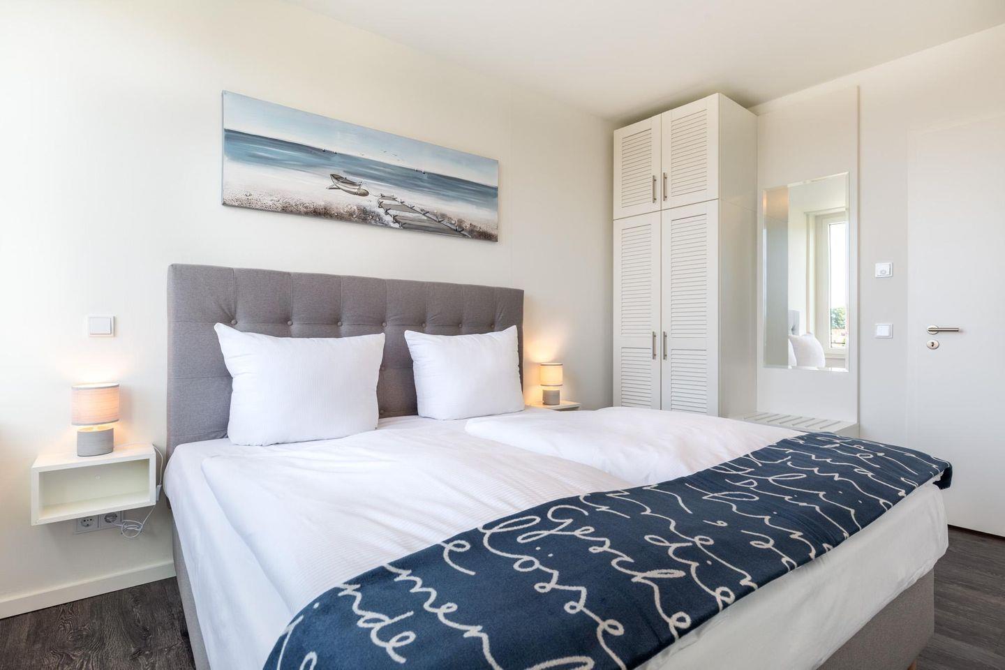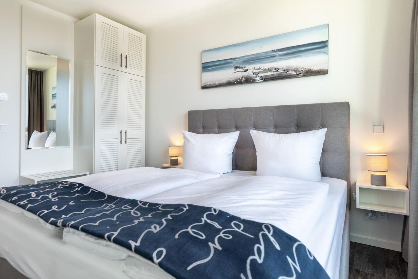 Das 66 m² große 3-Zimmer Apartment ist für bis zu 5 Personen geeignet. Besonders hervorzuheben ist die überdachte Loggia in sonniger, südwestlicher Lage; hier könnt ihr den ganzen Tag das wohltuende Meeresklima und zahlreiche Sonnenstunden bis in den Abend hinein genießen. Überdies verfügt das moderne Apartment über ein zweites, separates WC sowie ein Badezimmer mit Dusche und Badewanne.