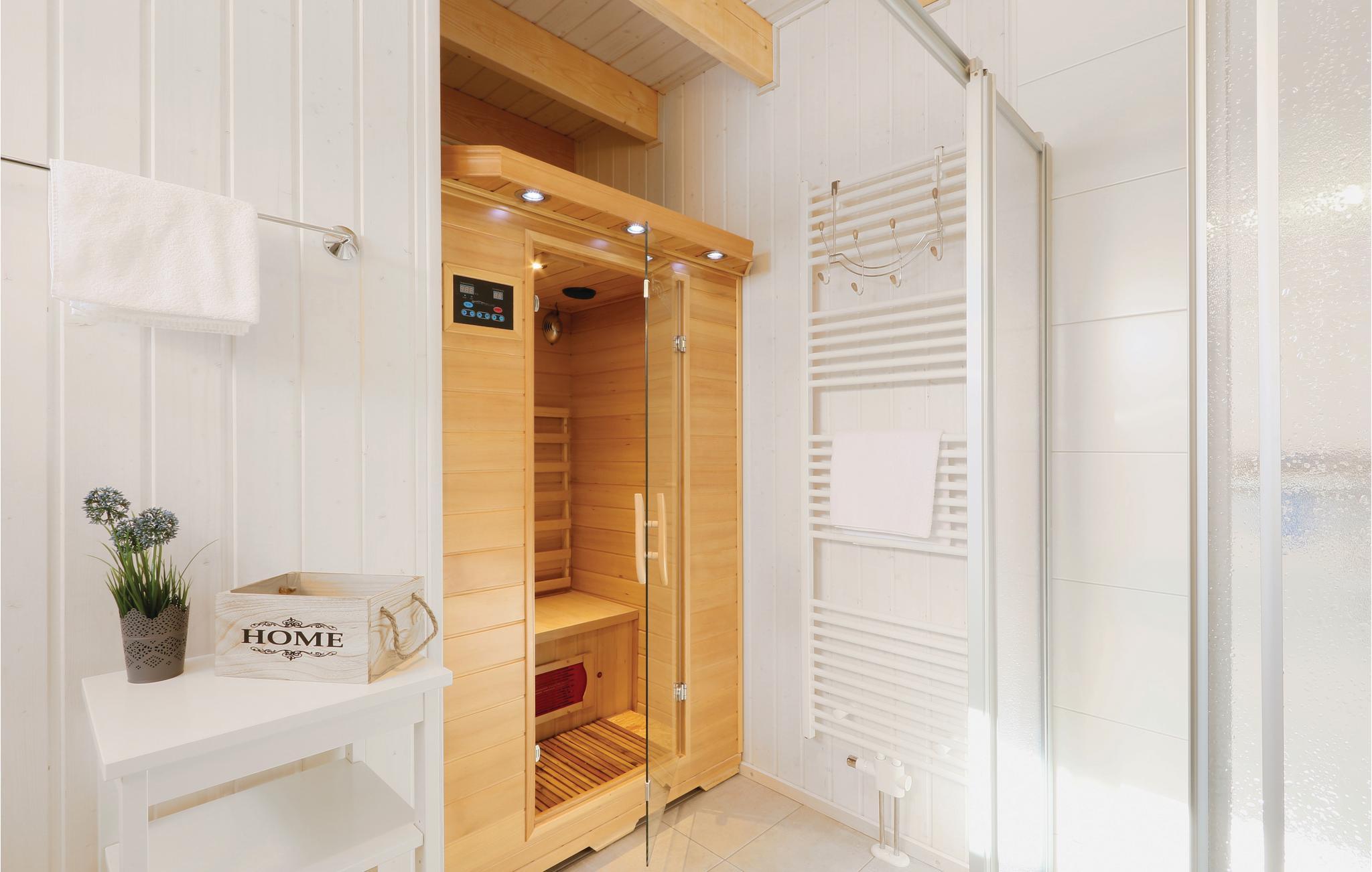 På overetagen er der to soveværelse med to enkeltsenge og en dobbeltseng samt to badeværelser. Her kan I også læne jer tilbage og nyde varmen i den infrarøde varmekabine.