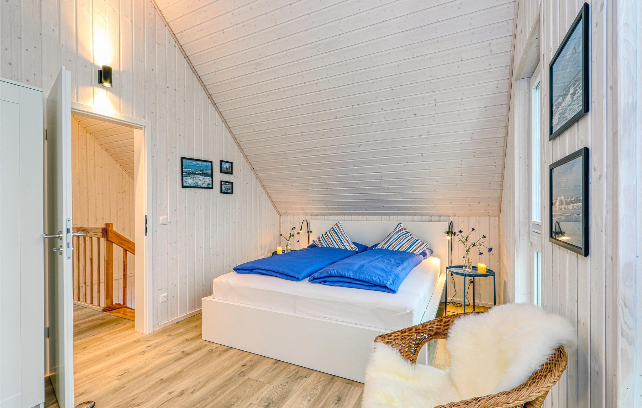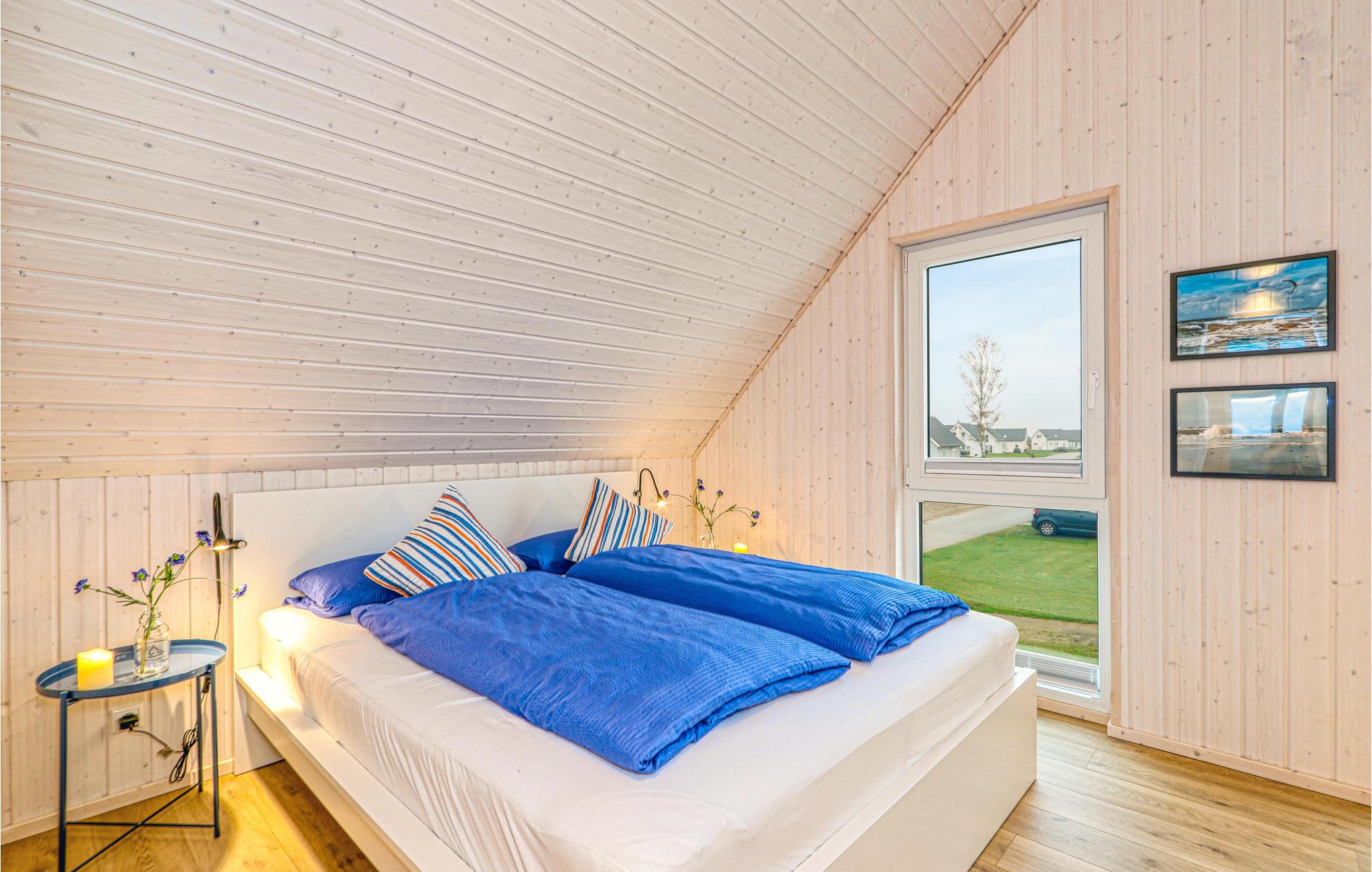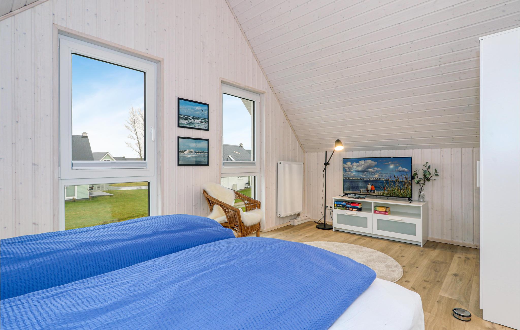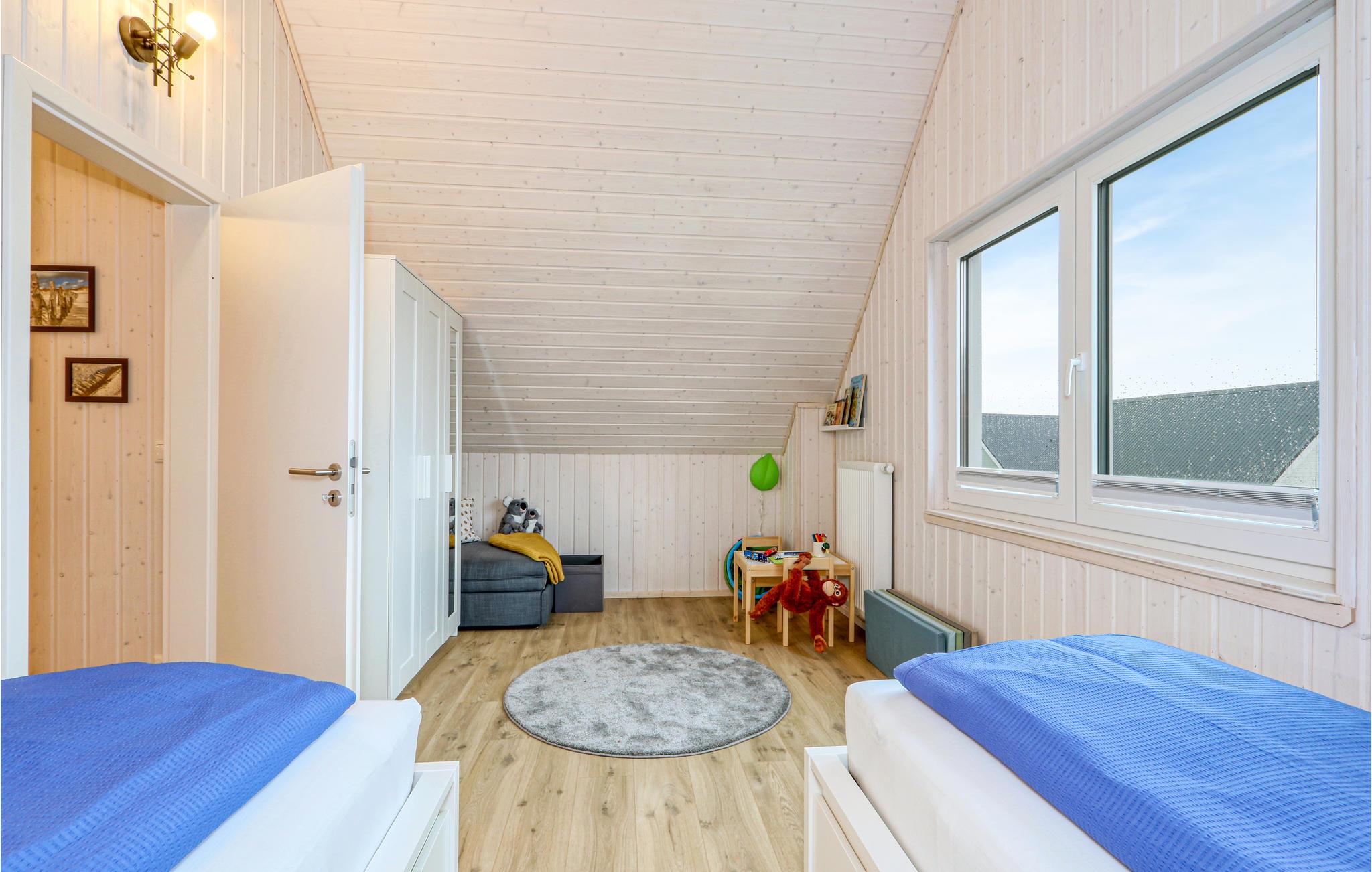 Værelserne fordeler sig på to etager. Feriehusets private sauna ligger i badeværelset i stueetagen og er et godt sted at slappe af efter en lang dag ved vandet. Herefter kan I finde jer til rette i stuen, mens ilden buldrer i brændeovnen. To Smart-TV samt en DAB kassetteradio er også til rådighed. Et af soveværelserne har en dobbeltseng, det andet soveværelse har to enkeltsenge og en udtræksseng med lamelramme og madras. Der er også et lille legeområde for børn, hvor de små vil have det rigtig sjovt.