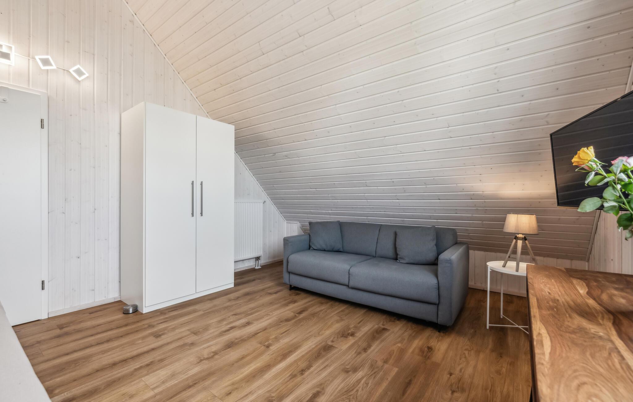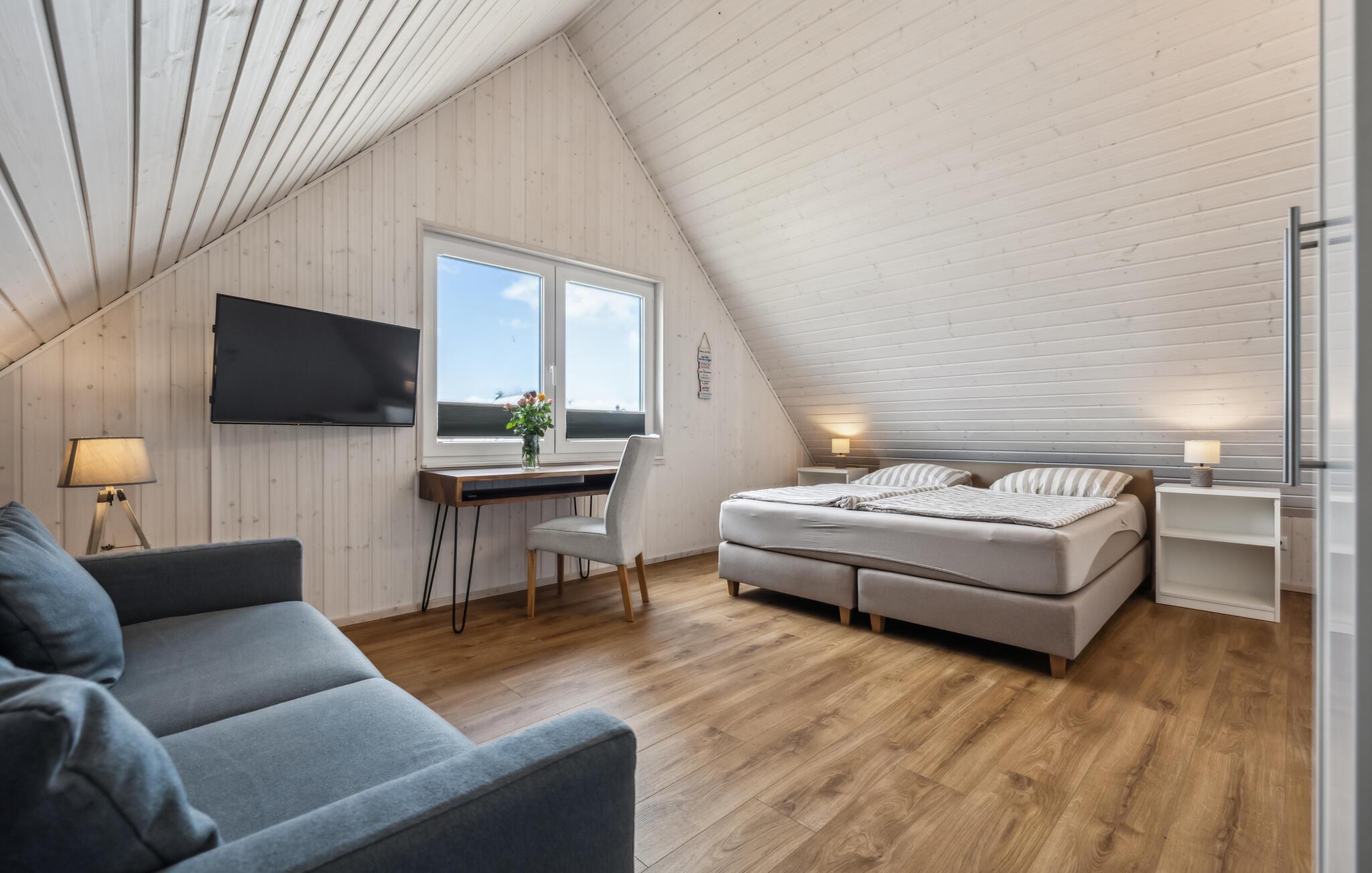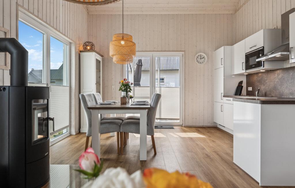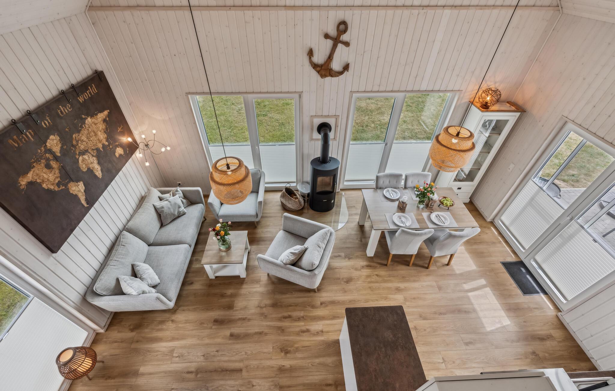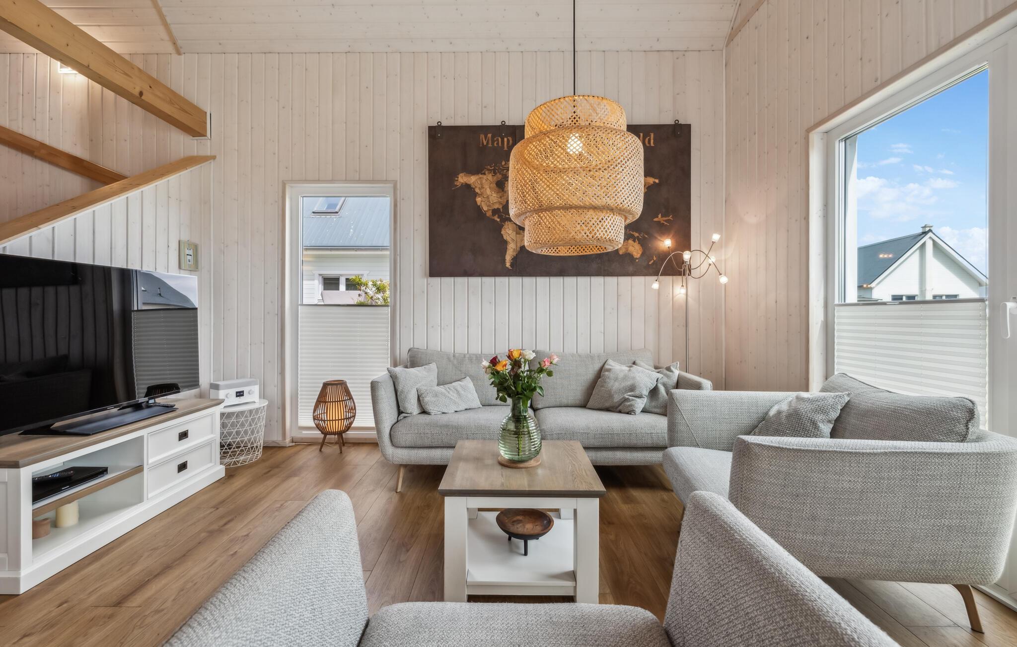 Der er dejligt rummeligt og store panoramavinduer, hvilket både lukker lyset ind og sørger for en dejlig udsigt til omgivelserne. Inventaret er lyst og moderne, så her kommer I garanteret til at føle jer godt tilpas.