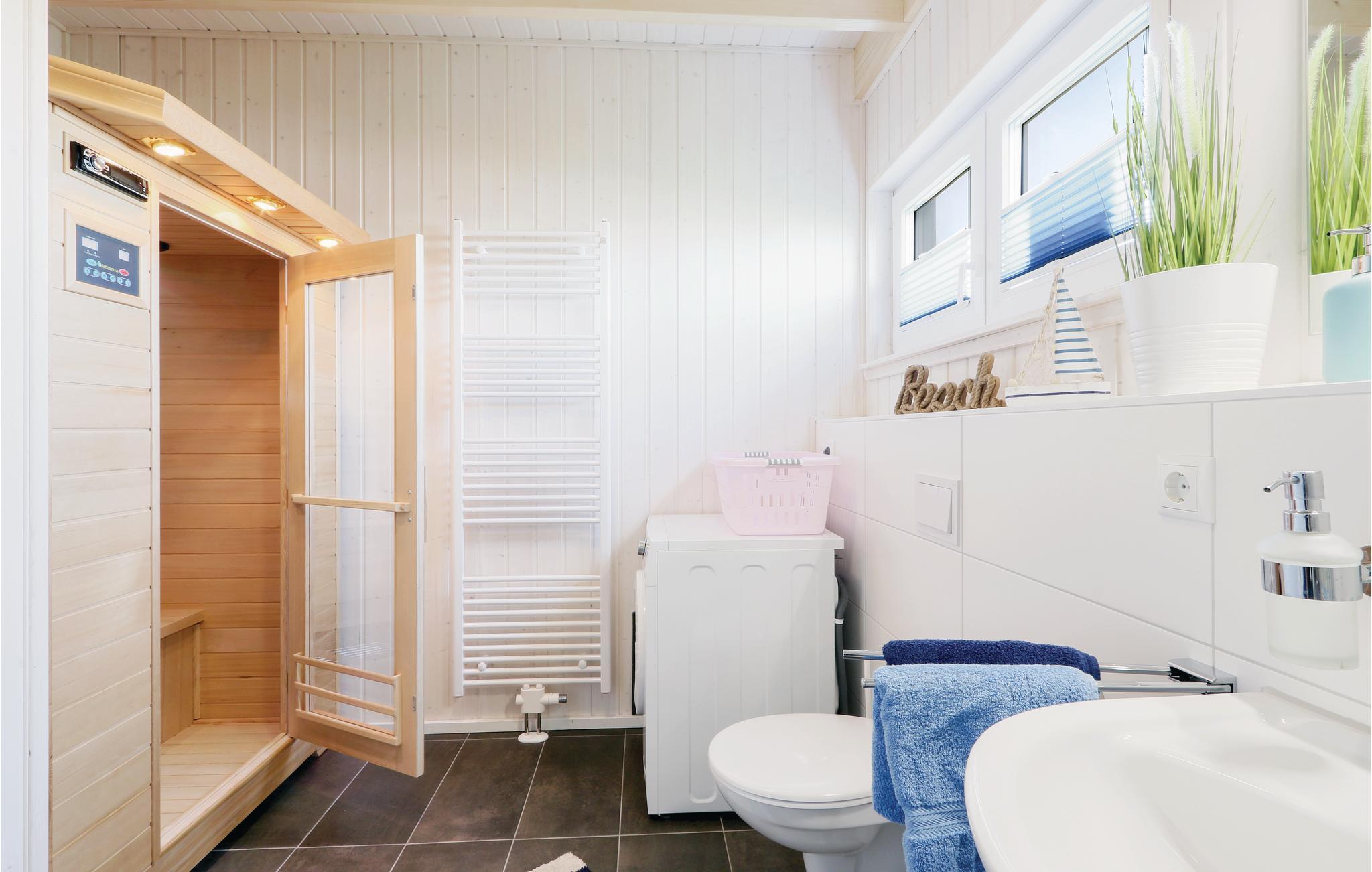 I har jeres helt personlige lille wellnessområde i badeværelset. Her er en infrarød varmekabine og en whirlpool, som I kan hoppe I efter en lang gå- eller løbetur på stranden.