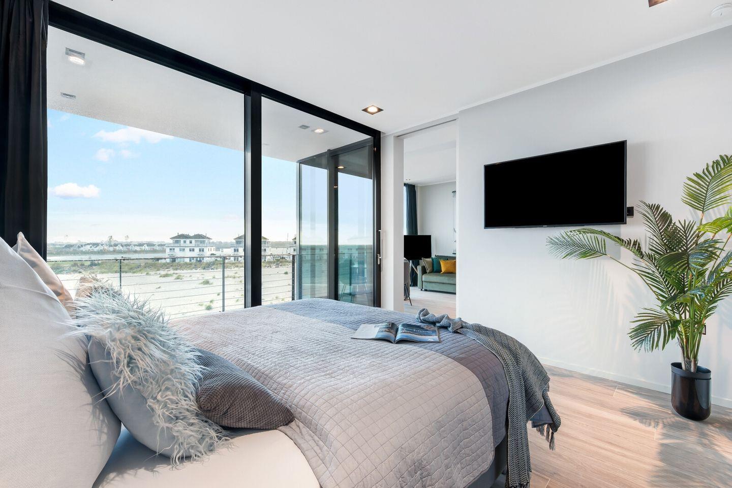 Im Schlafzimmer gibt es ein bequemes Doppelboxspringbett, einen Kleiderschrank und einen Smart-TV. Dazu gehört ein großer Sonnenbalkon mit Traumaussicht. Auch hier sorgen Panoramafenster für einen wunderbaren Meerblick. Genießen Sie erholsame Nächte und frische Meeresbrise.