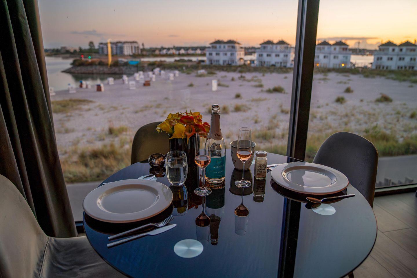 Der offene Wohn-Essbereich hat eine voll ausgestattete Küche. Große Panoramafenster bieten spektakulären Blick auf den Strand der Olpenitz Badebucht, das Hafenbecken und die weite Ostsee. Die Wohnung verbindet Eleganz und Komfort, das offene Raumkonzept ist perfekt für gemeinsame Stunden.