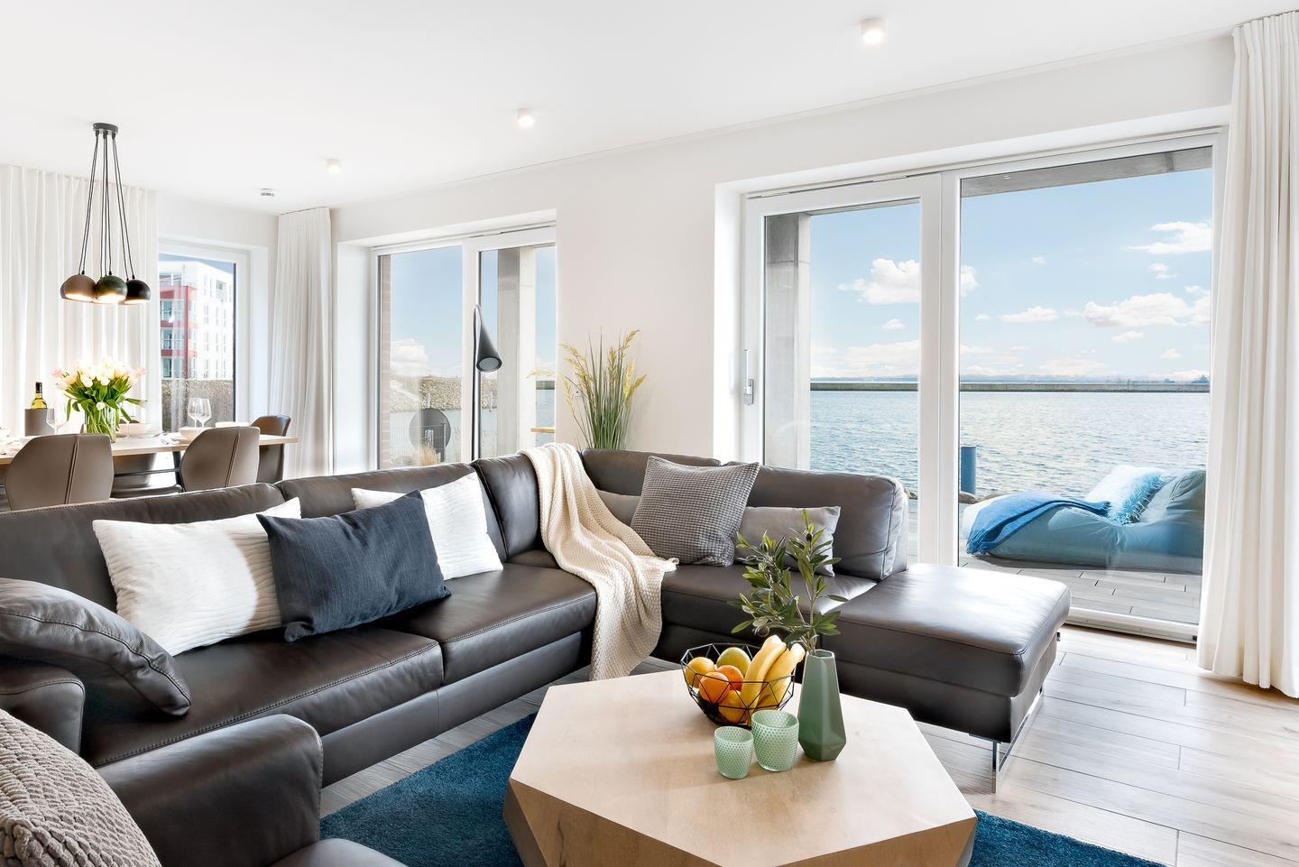 Hier trifft ein spektakulärer Wasserblick auf eine durchdachte Raumaufteilung. Die Wohnung zeichnet sich durch bodentiefe Fenster aus, die alle Räume mit natürlichem Licht fluten und einen freien Blick auf das Ostseeresort Olpenitz und die Ostsee ermöglichen. Die Terrasse im Erdgeschoss und ein großzügiger Balkon im Obergeschoss laden dazu ein, die Seele baumeln zu lassen und das maritime Flair des Ostseeresort Olpenitz in vollen Zügen zu genießen. Die finnische Sauna lädt zum Entspannen ein.