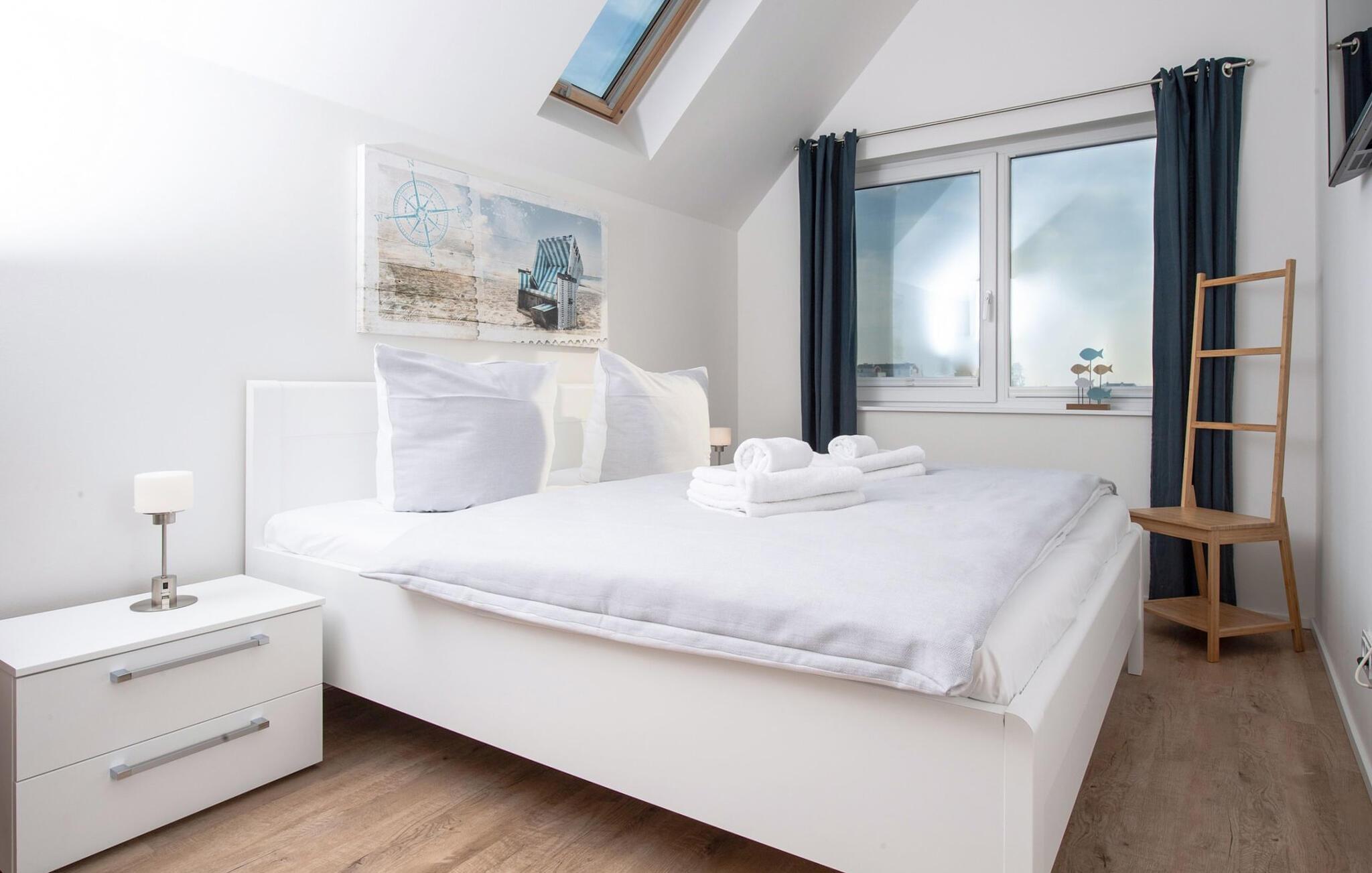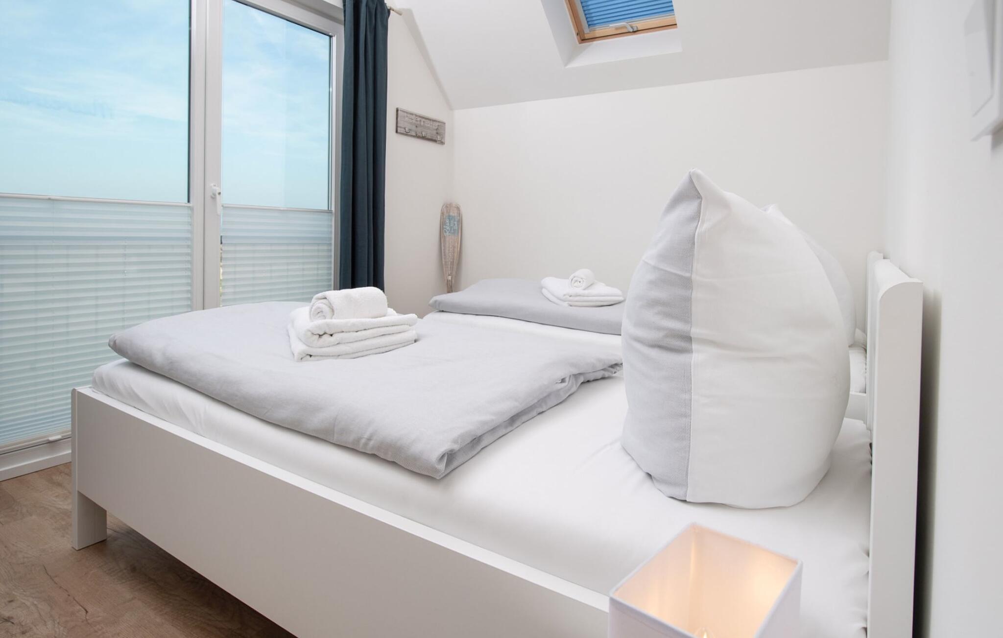Ferieboligens afslapningsområde er på anden etage. Det store soveværelse har en fantastisk udsigt over havnen fra den hyggelige dobbeltseng. Fald i søvn under stjernerne, et ovenlys giver jer ikke kun mulighed for at se stjernehimlen, men også de drømmeagtige skyformationer, der er så karakteristiske for norden. Det andet soveværelse har to enkeltsenge, der kan skubbes sammen med udsigt over flodmundingen. I stuen er der en komfortabel sovesofa med en rigtig springmadras til to personer.