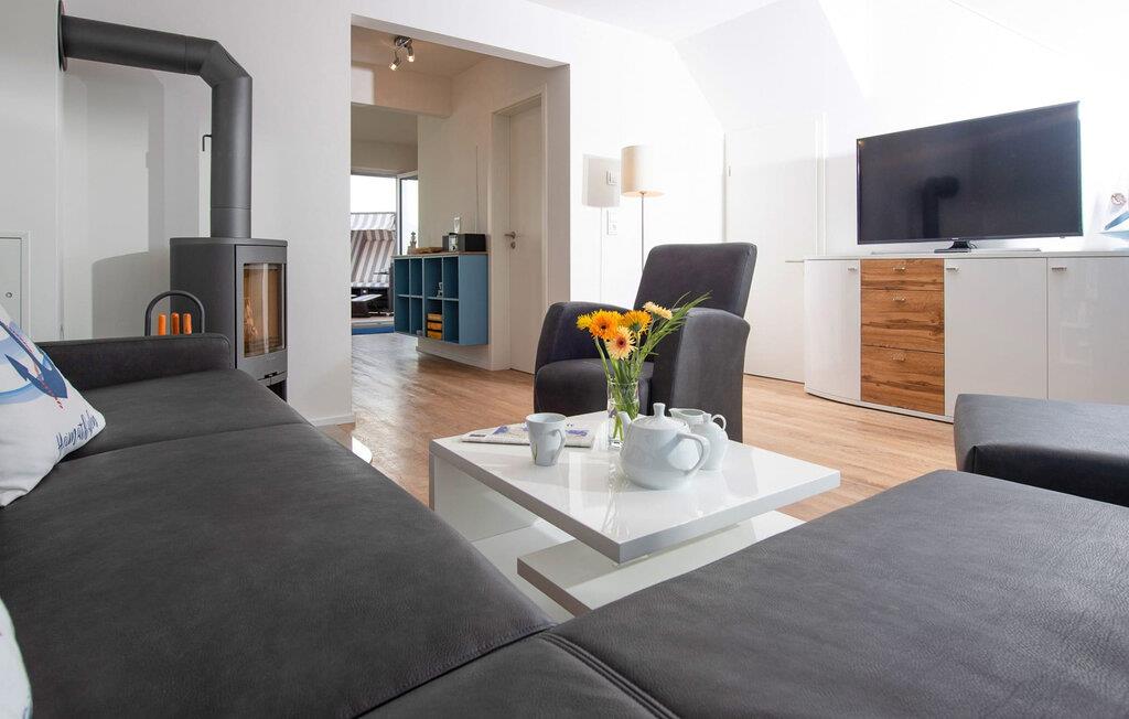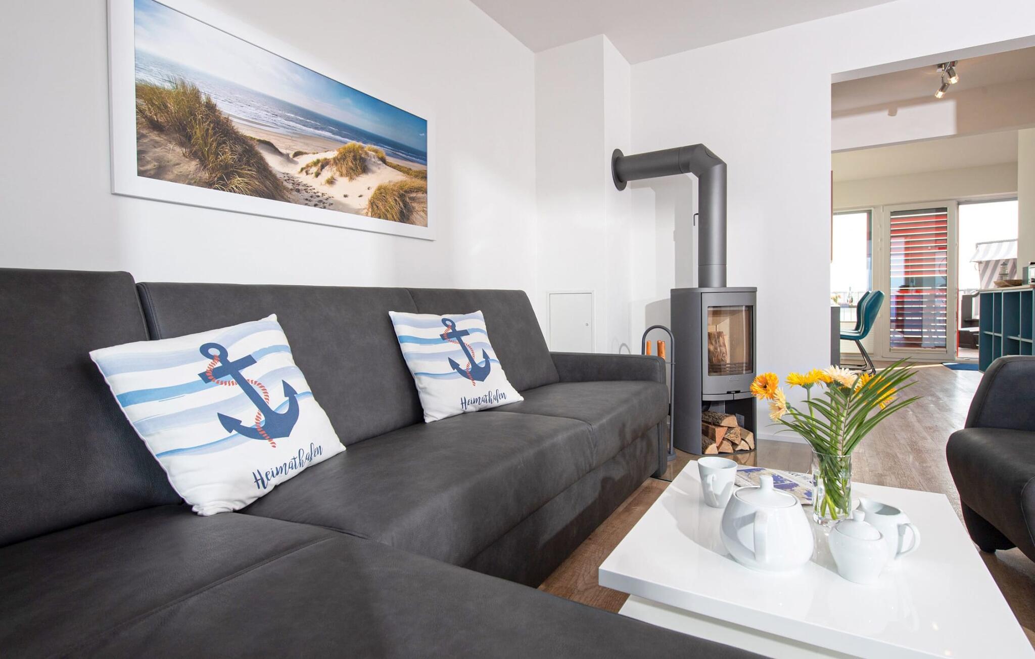 Der bliver hyggeligt i stuen, hvor en hyggelig siddegruppe indbyder til at nyde en aften ved pejsen på dårlige vejrdage. Smart-tv'et tilbyder også indendørs underholdning. Gulvvarmen i hele ejendommen sikrer også hyggelig komfort.