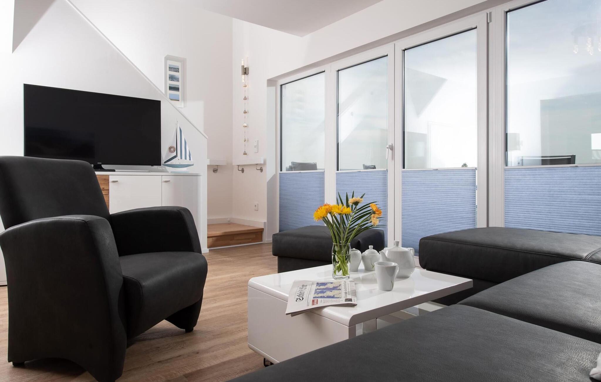 Sommerhusets opholds- og spisestue er oversvømmet af lys og har gulv til loft panoramavinduesfronter mod den tilstødende tagterrasse på den ene side og altanen på den anden side. En fantastisk udsigt åbner op på terrassen ved siden af ??spisepladsen med udsigt over sejler- og sportsbådshavnen i OstseeResort Olpenitz. Uanset om det er en romantisk middag i levende lys, en hyggelig grillfest eller afslapning i en strandstol, er havnebiografen og en fantastisk solrig udsigt garanteret.
