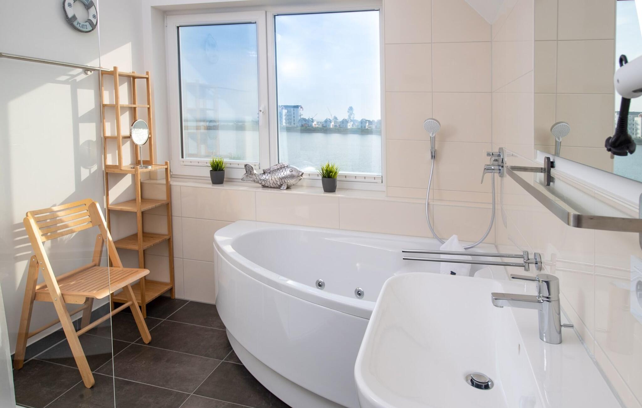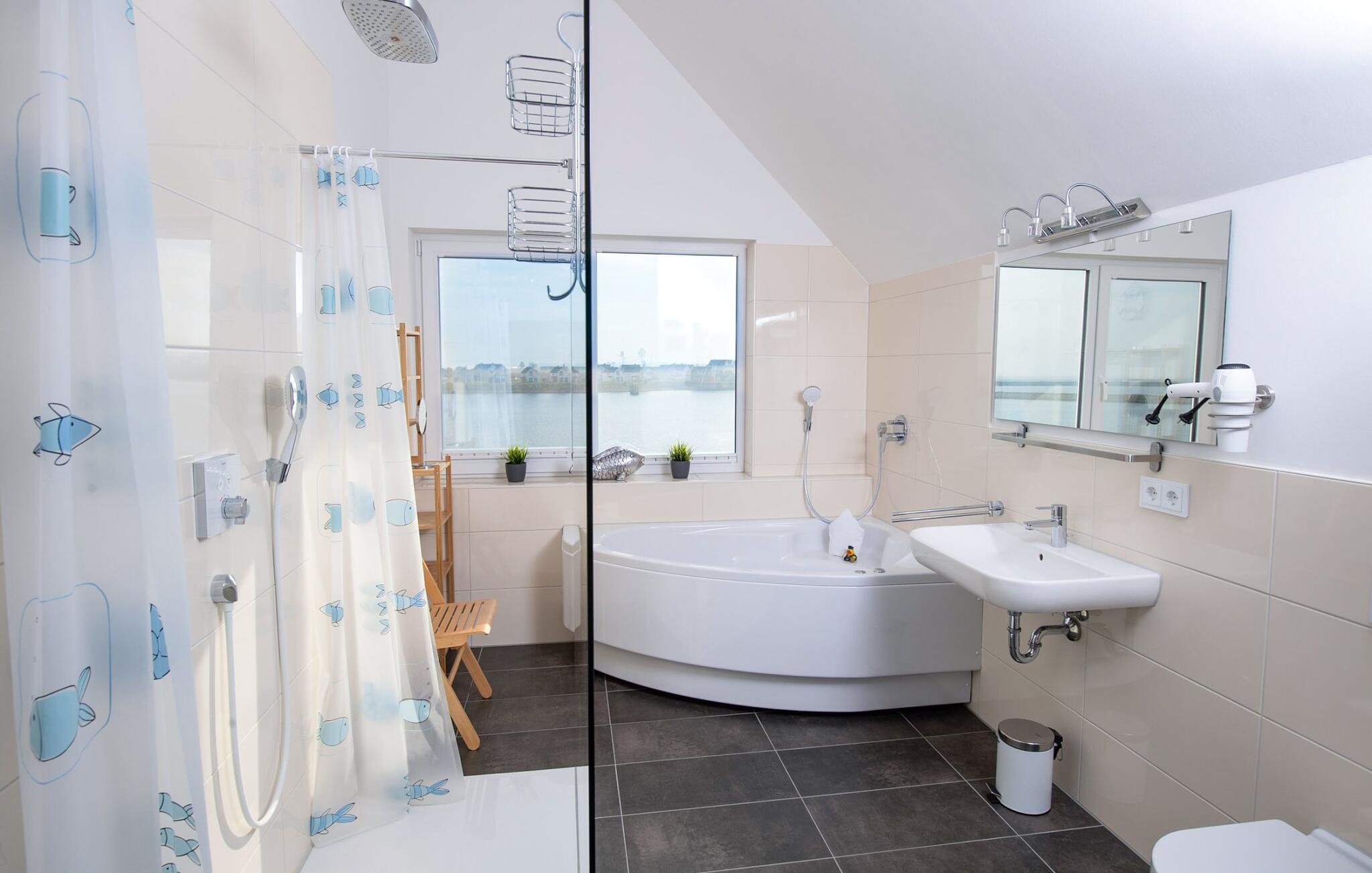 Et privat wellnessområde med sauna og boblebad inviterer til afslapning: en infrarød saunavarmekabine med hi-fi lydsystem og LED farvelysterapi samt et stort afslapningsboblebad med havudsigt (Østersøen/Schlei) er til rådighed at slappe af i efter en gåtur på stranden. I kan også nyde en vidunderlig udsigt over havnen fra brusekabinen.