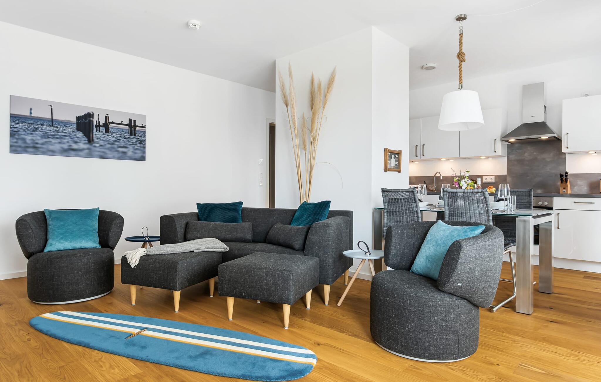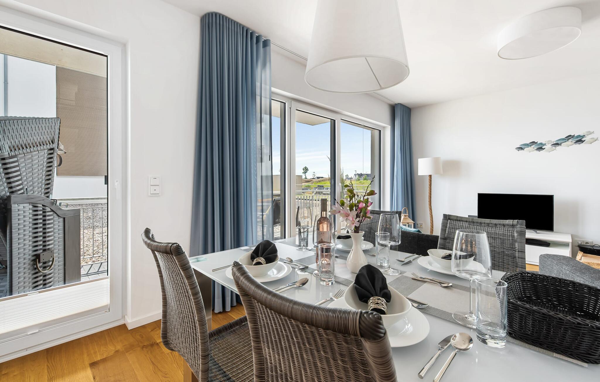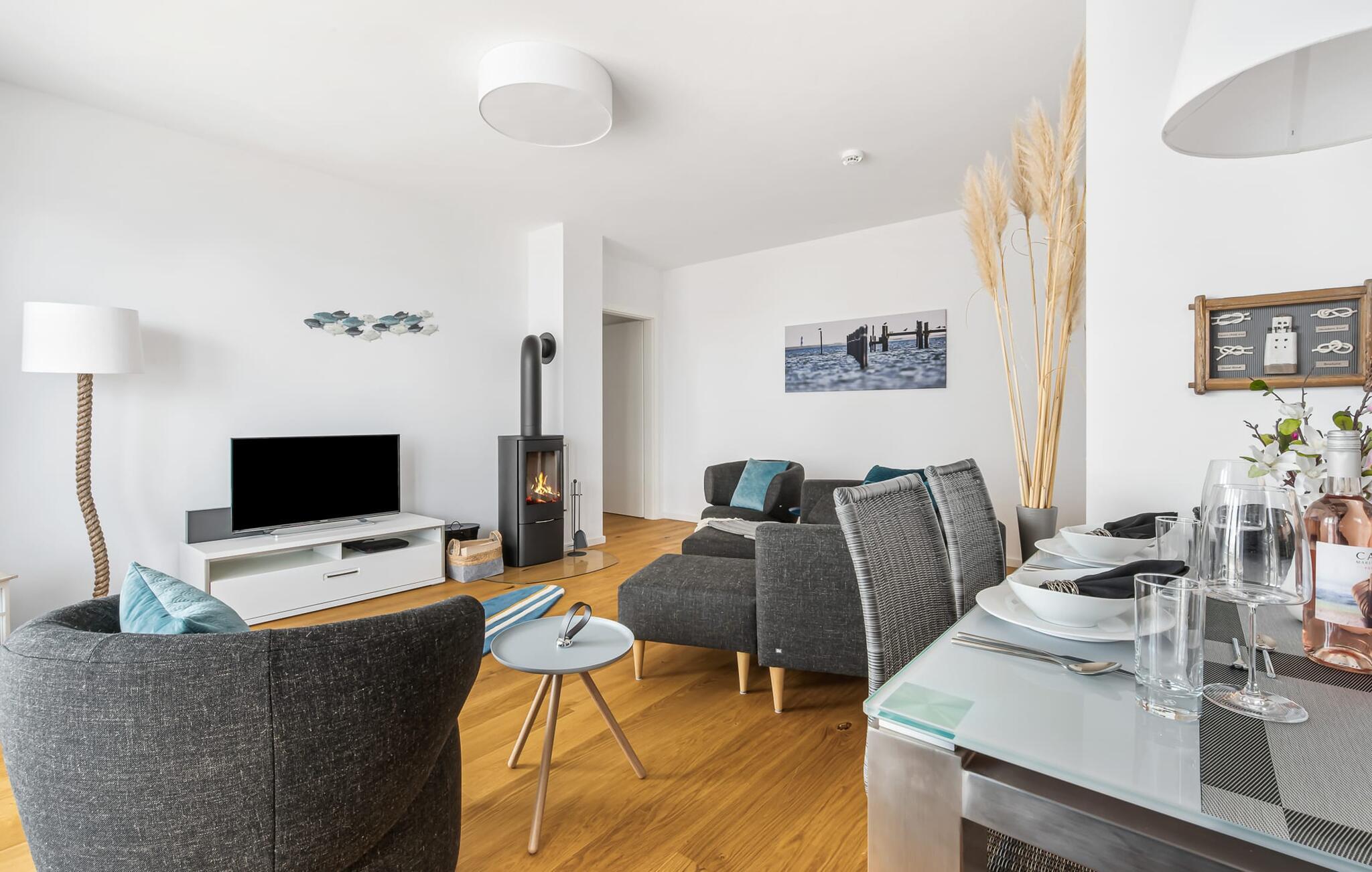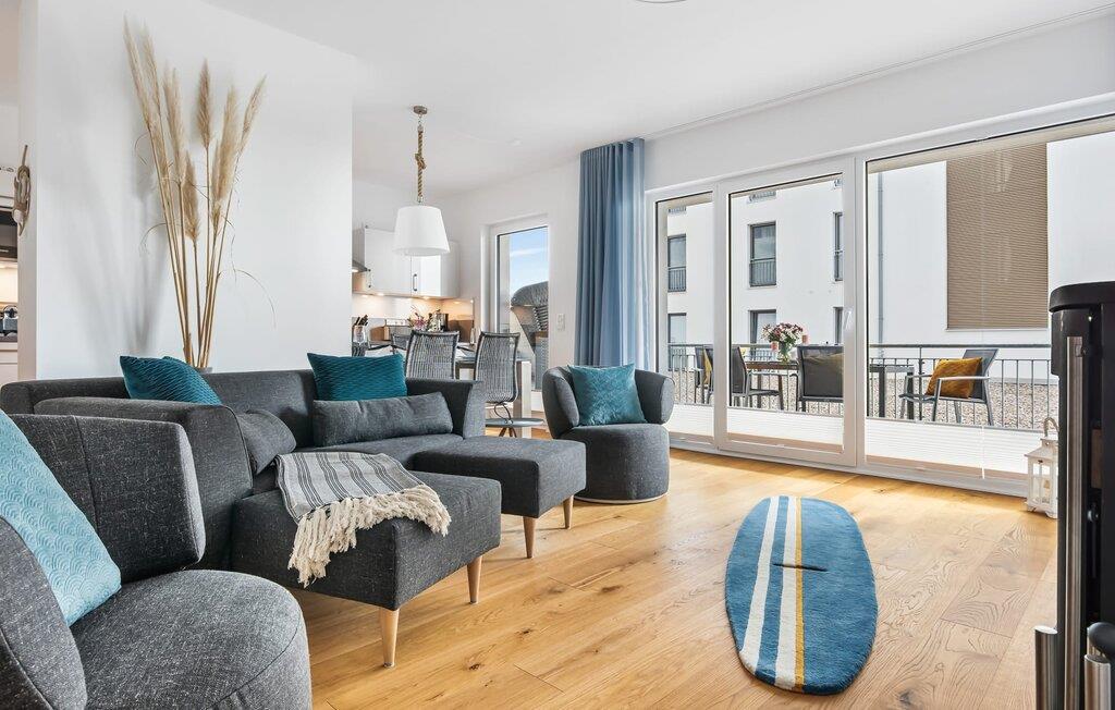 OSTSEETRÄUMCHEN imponerer på den ene side med sin drømmeagtige og rolige beliggenhed, og på den anden side med sin sofistikerede og maritime stemning, som handler om komfort. Med sin gulv-til-loft vinduesfront og den store tilstødende altan er den åbne stue/alrum lejlighedens hjerte. At komme ind her og straks føle sig hjemme er én ting. At se ud over havet fra vinduet eller balkonen og slappe af er ren afslapning og afslapning! Hverdagen bliver mere og mere fjern.