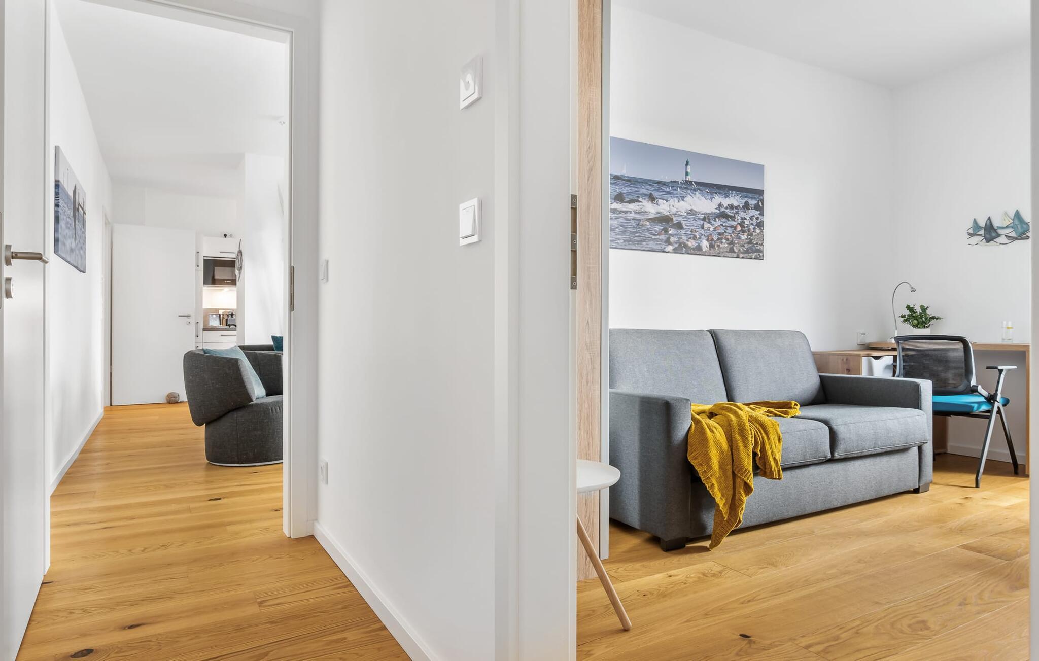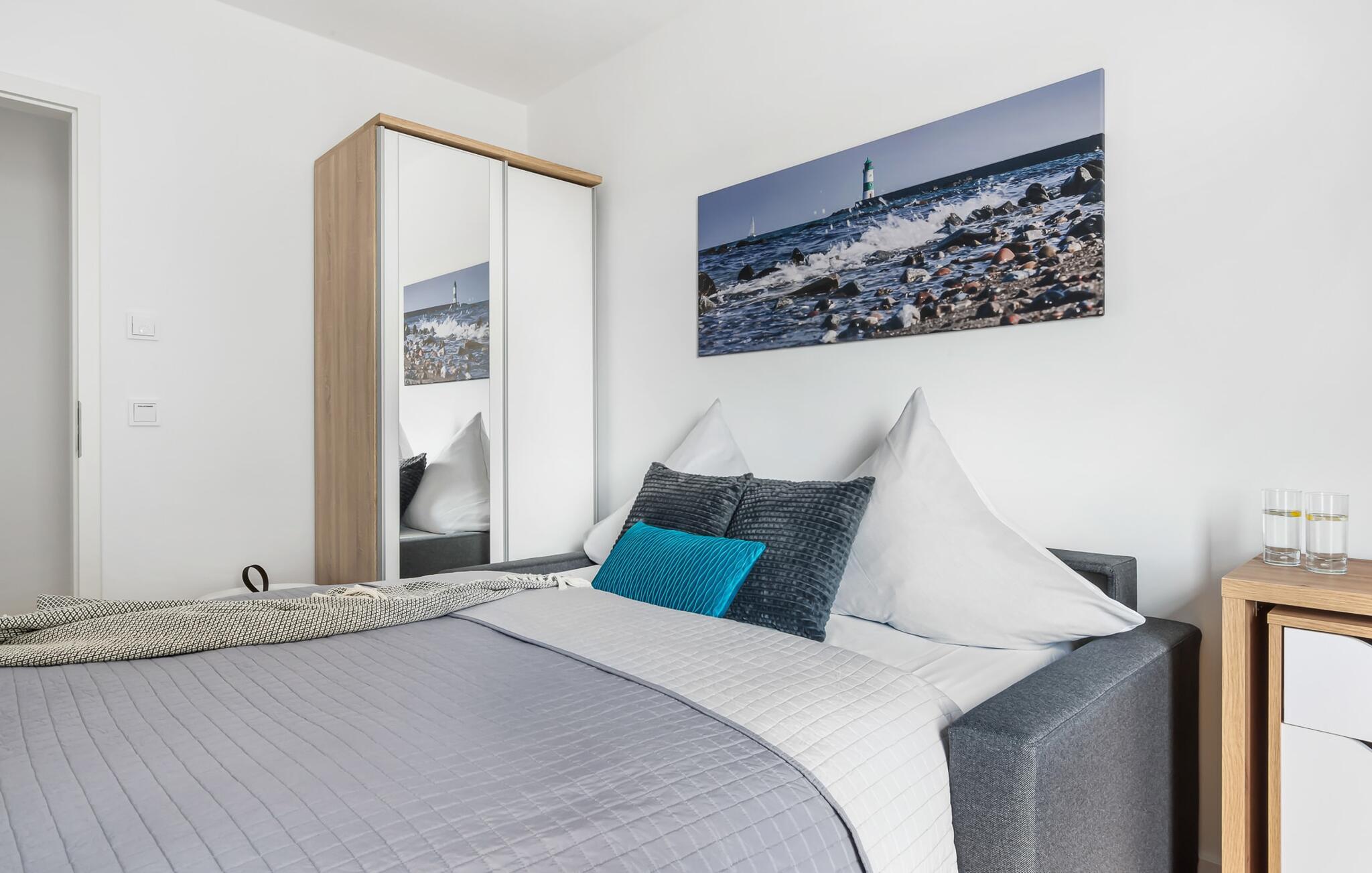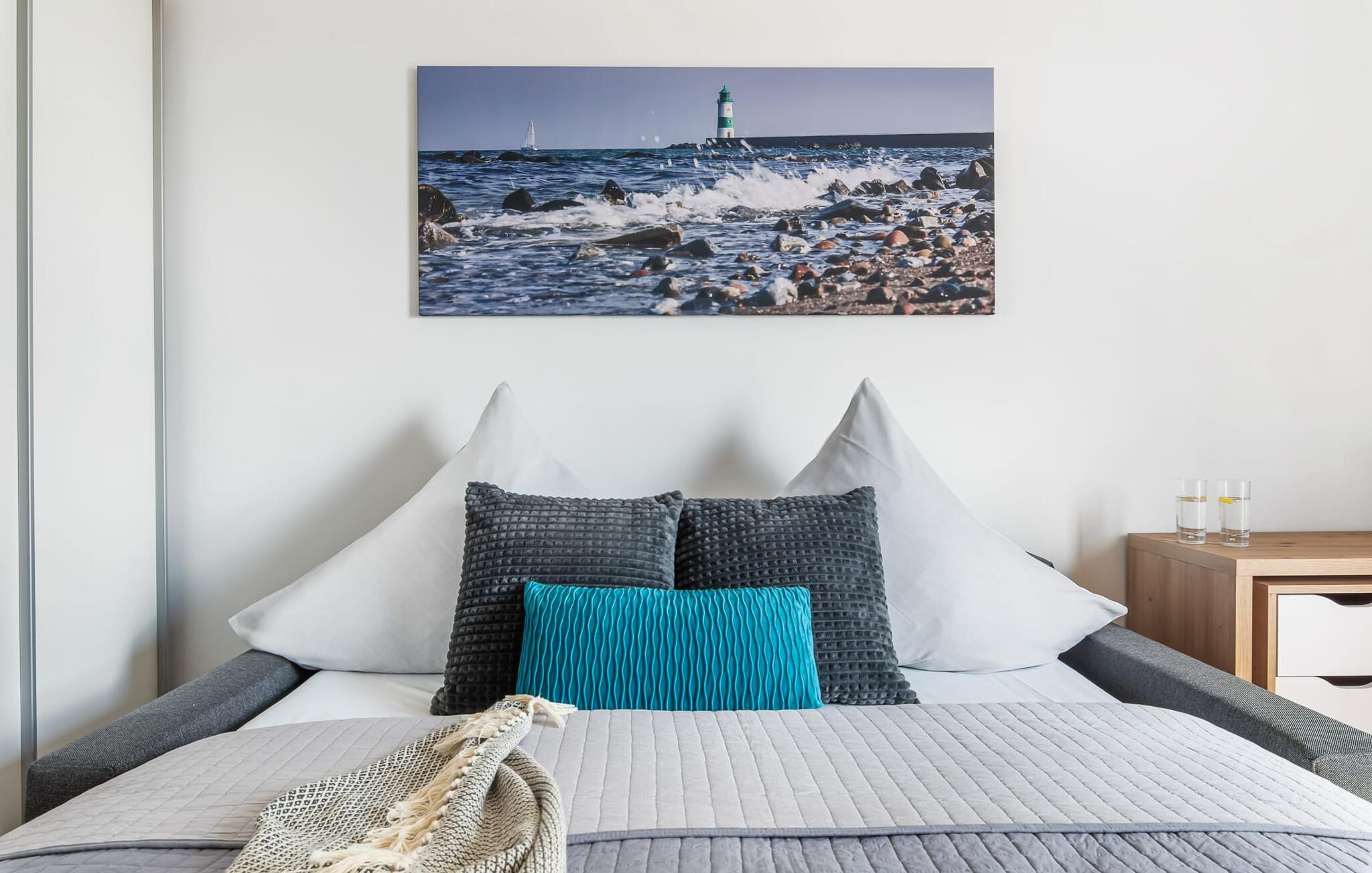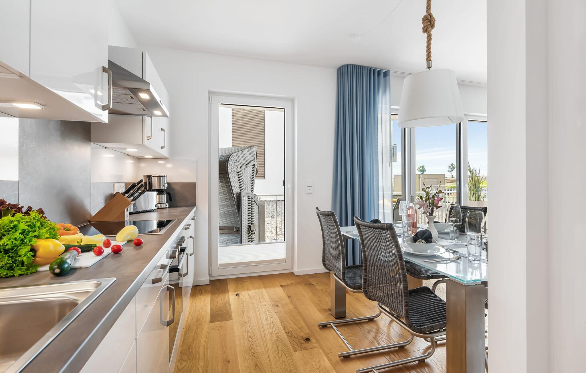 OSTSEETRÄUMCHEN imponerer på den ene side med sin drømmeagtige og rolige beliggenhed, og på den anden side med sin sofistikerede og maritime stemning, som handler om komfort. Med sin gulv-til-loft vinduesfront og den store tilstødende altan er den åbne stue/alrum lejlighedens hjerte. At komme ind her og straks føle sig hjemme er én ting. At se ud over havet fra vinduet eller balkonen og slappe af er ren afslapning og afslapning! Hverdagen bliver mere og mere fjern.