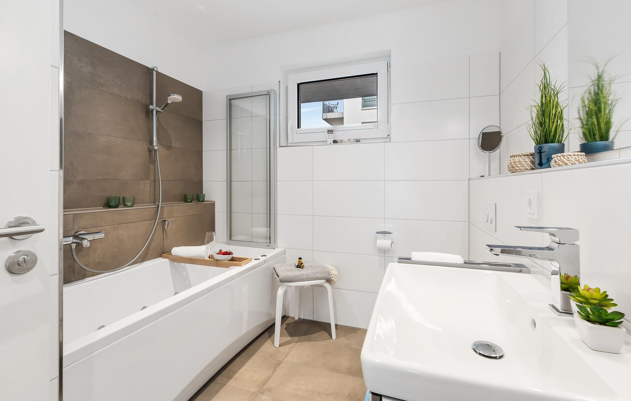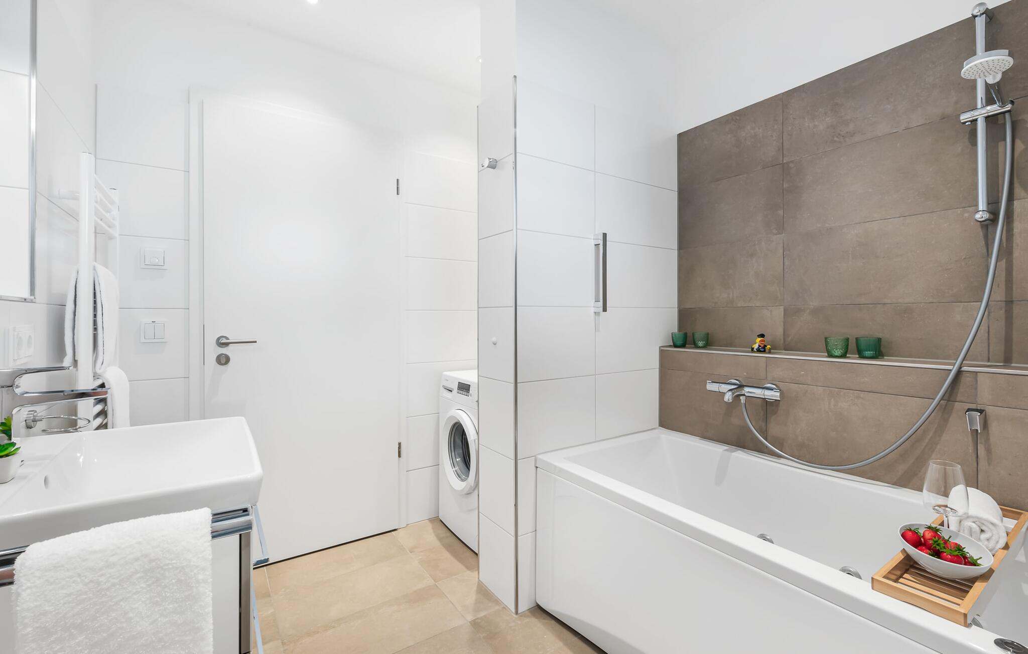 Det lyse og komfortable dagslysbadeværelse lader intet tilbage at ønske og garanterer en vellykket start på en ny feriedag. Eller du kan afslutte dagen med at slappe af i det store spabad.
