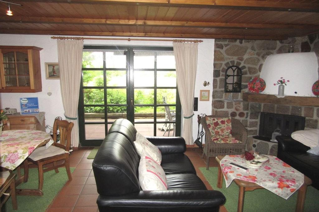 Stueetage: (stue / spisestue(, Fjernsyn, spisebord, pejs), soveværelse(, , dobbeltseng), Børneværelse(køjeseng)) , , badeværelse(, toilet, bruser, håndvask), guest toilet(toilet, håndvask), carport, vaskemaskine, varme, parkering, tørreskab