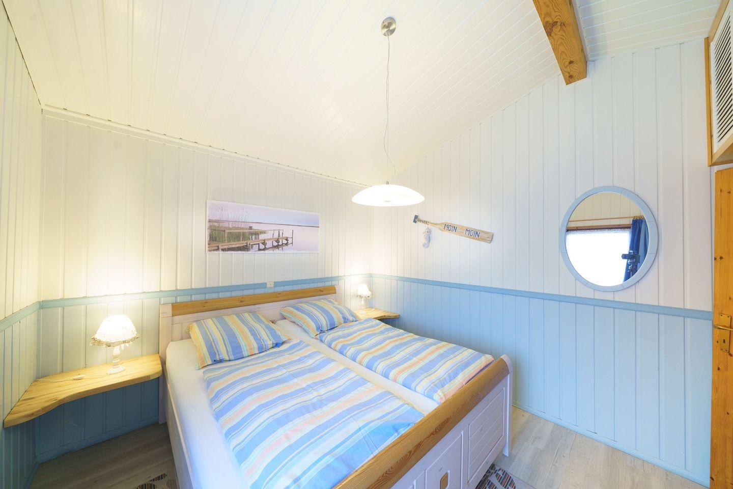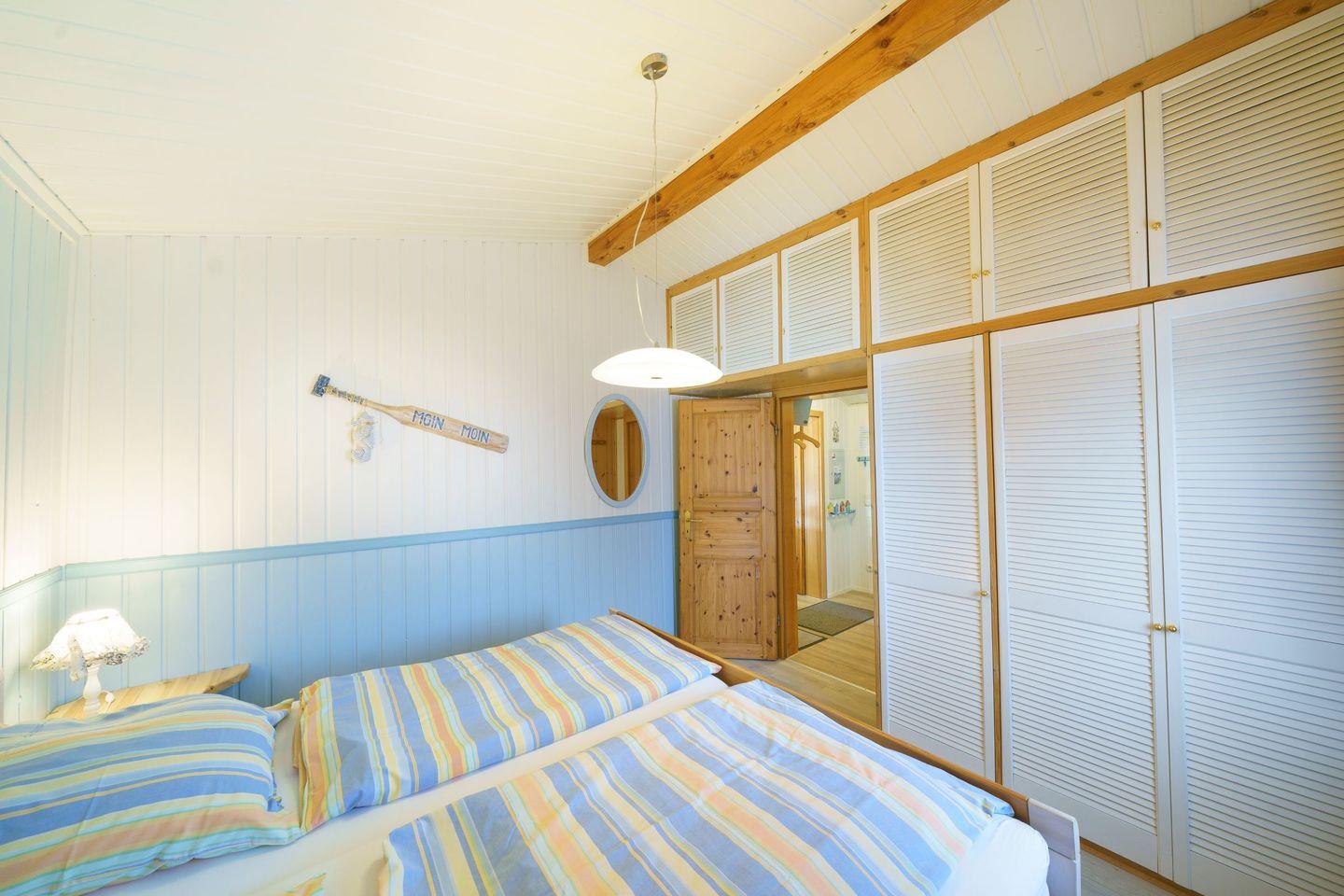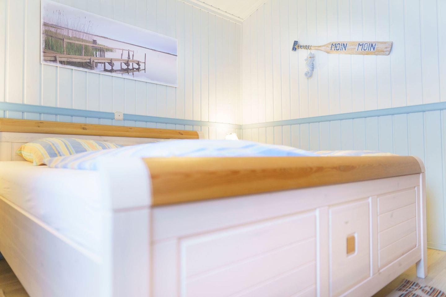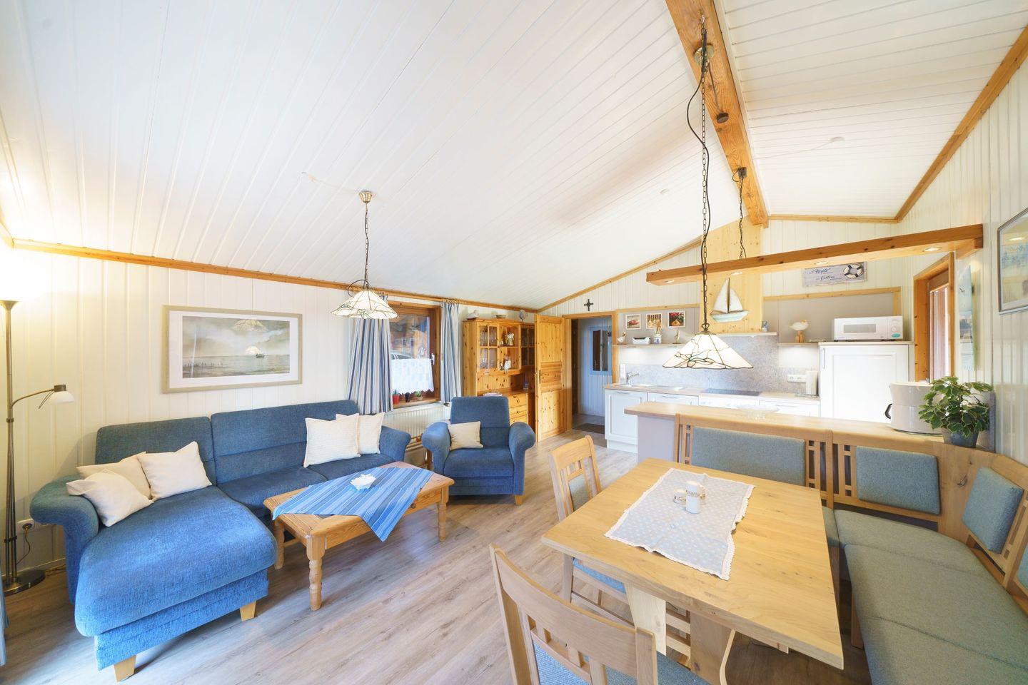 Ferienhaus Strandkorb ist ein komfortables, helles Holzhaus mit überdachter Terrasse. In dem wunderschönen Garten haben Sie eine große Liegewiese mit viel Platz zum Spielen, Sonnen und Faulenzen. Für die Kinder sind ein Sandkasten und eine Schaukel vorhanden. Das Haus liegt im Ferienpark „Achtern Diek“ ca. fünf Gehminuten von den Badeseen sowie vom Grünstrand und den Freizeitanlagen entfernt. Im Erdgeschoss befindet sich das geschmackvoll eingerichtete Wohnzimmer mit offener Essecke und Einbauküche. Das Wohnzimmer verfügt über einen Farb-TV mit Sat-Anlage, einen DVD-Player und einem Radio. Das Kinderzimmer ist mit einem Etagenbett sowie einem Einzel stehenden Bett ausgestattet und bietet Platz für drei Kinder oder Erwachsene. Im Flur befindet sich das Duschbad und nebendran das gemütliche Schlafzimmer mit dem Doppelbett.