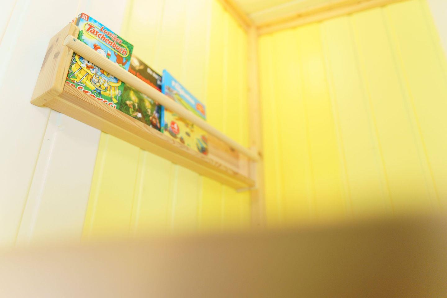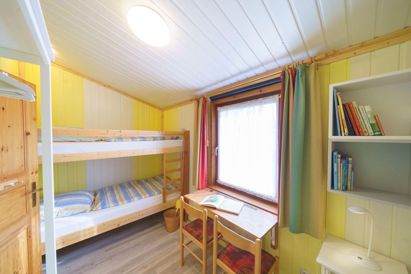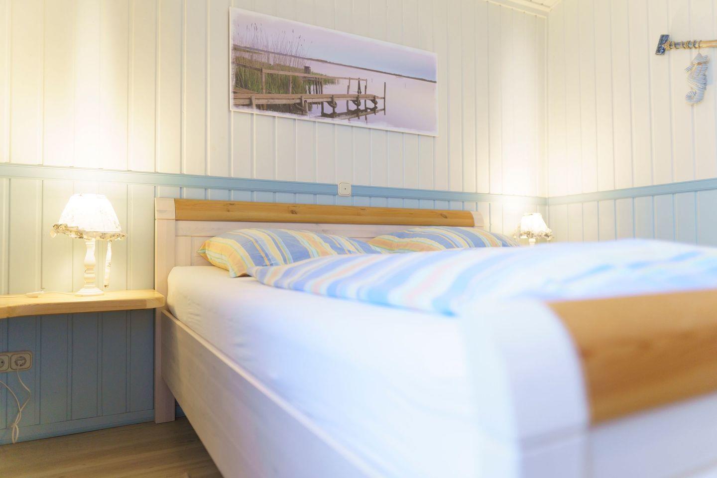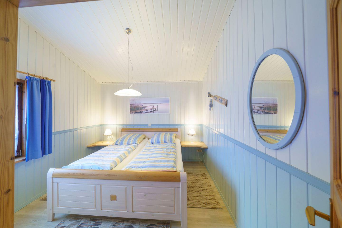 Ferienhaus Strandkorb ist ein komfortables, helles Holzhaus mit überdachter Terrasse. In dem wunderschönen Garten haben Sie eine große Liegewiese mit viel Platz zum Spielen, Sonnen und Faulenzen. Für die Kinder sind ein Sandkasten und eine Schaukel vorhanden. Das Haus liegt im Ferienpark „Achtern Diek“ ca. fünf Gehminuten von den Badeseen sowie vom Grünstrand und den Freizeitanlagen entfernt. Im Erdgeschoss befindet sich das geschmackvoll eingerichtete Wohnzimmer mit offener Essecke und Einbauküche. Das Wohnzimmer verfügt über einen Farb-TV mit Sat-Anlage, einen DVD-Player und einem Radio. Das Kinderzimmer ist mit einem Etagenbett sowie einem Einzel stehenden Bett ausgestattet und bietet Platz für drei Kinder oder Erwachsene. Im Flur befindet sich das Duschbad und nebendran das gemütliche Schlafzimmer mit dem Doppelbett.