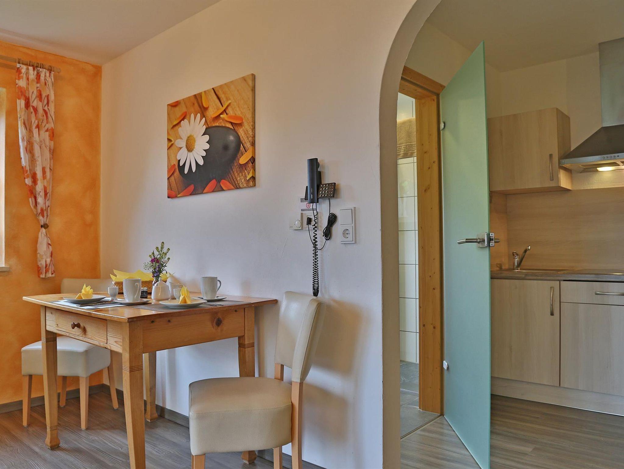 Die 4-Sterne-Ferienwohnung (Nichtraucher) befindet sich im Erdgeschoss und bietet auf 50 Quadratmetern Platz für 2 Erwachsene und 1-2 Kind(er). Sie verfügt über einen Südbalkon mit Balkonmöbeln. Küche mit Geschirrspülmaschine, Cerankochfeld, Umluftofen mit Grill und Mikrowelle. Das Schlafzimmer ist mit Massivholzmöbeln, erhöhtem Doppelbett und einem Kleiderschrank ausgestattet. Der zweite kleine Schlafbereich verfügt über ein Einzelbett. Das Wohnzimmer ist mit neuen Polstermöbeln (Schlafsofa), einem Massivholzschrank und einem Essbereich eingerichtet. HD-TV (Kabel Digital), DVD, Radio. Neuwertiges barrierefreies Badezimmer/WC mit Handtuchwärmer, Haartrockner und kostenlosen Pflegeprodukten. Freie Nutzung von WLAN, Telefonie ins Deutsche Festnetz, Bettwäsche und Handtücher. Garagennutzung auf Anfrage für 5,-€ pro Tag. Saunahandtücher für 7,-€ pro Stück erhältlich.