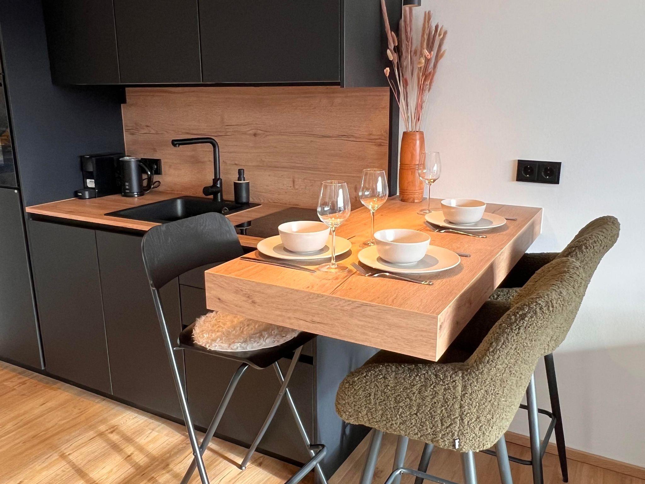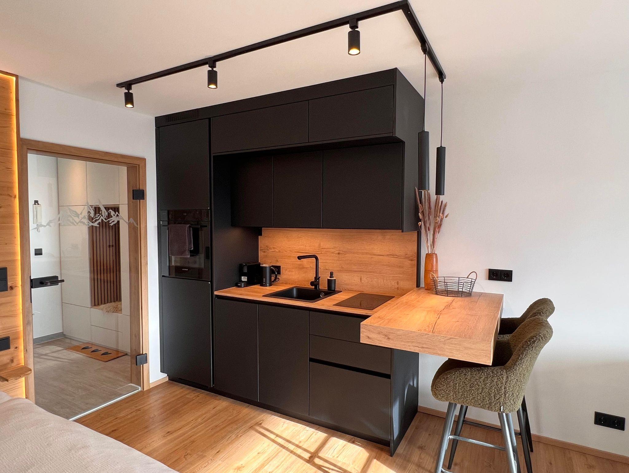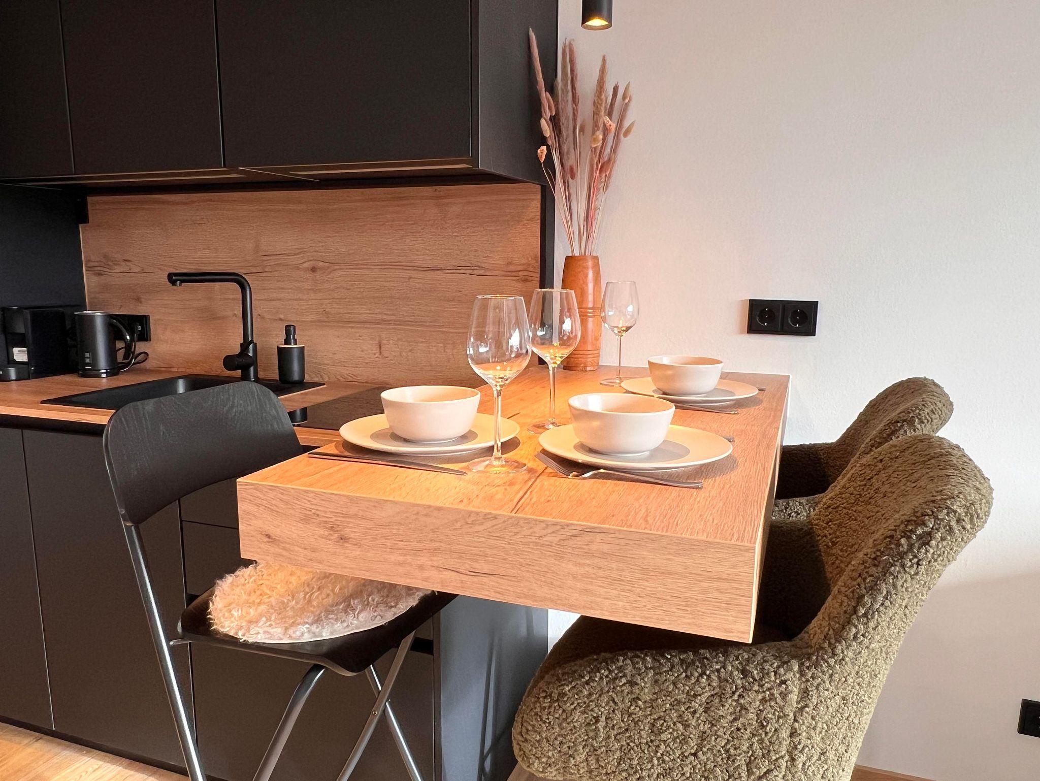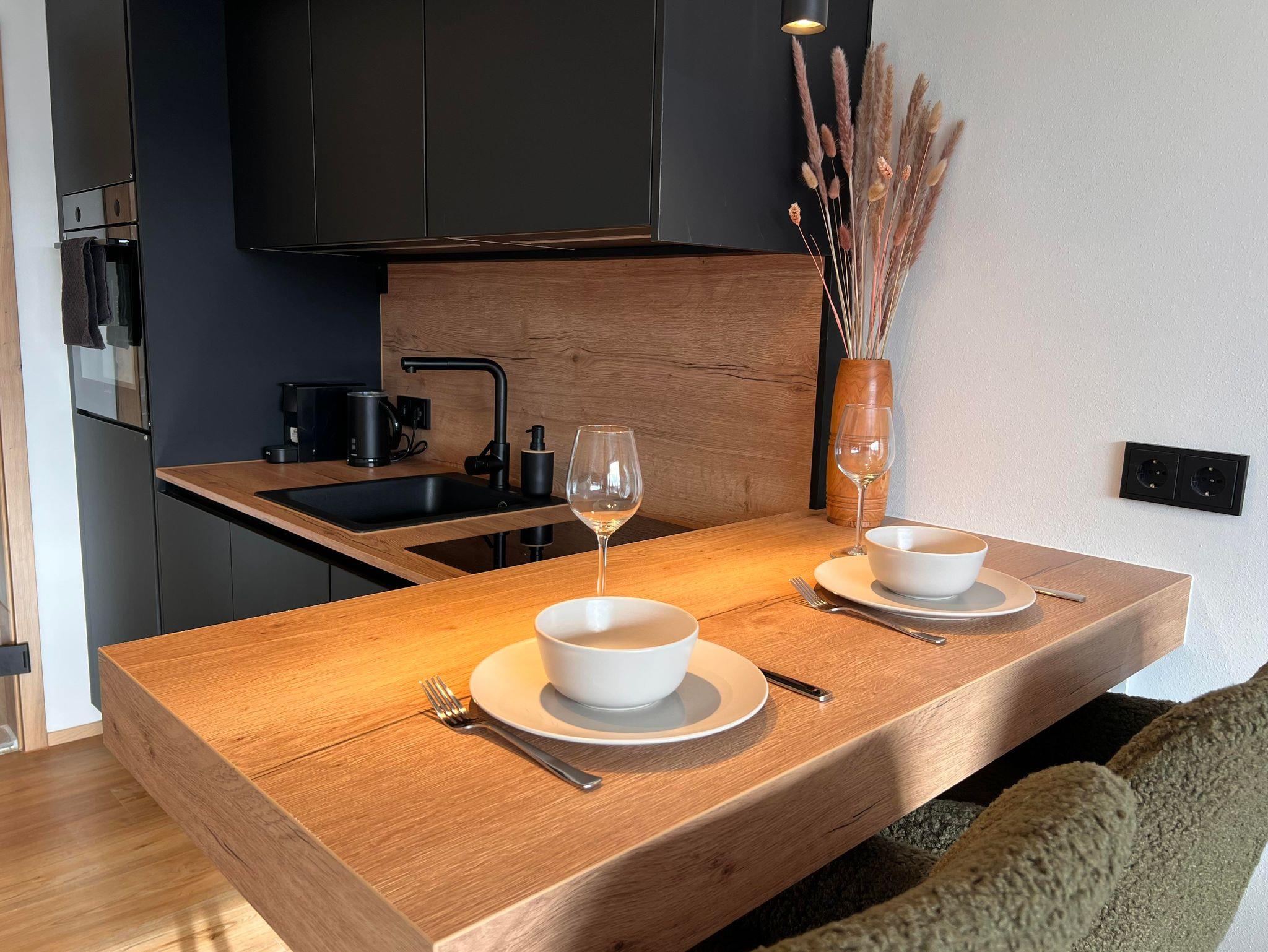 Die neue, voll ausgestattete Küche lässt keine Wünsche offen: Herd, Backofen, Kühlschrank mit Gefrierfach, Kaffeemaschine, Wasserkocher, Toaster sowie sämtliches Geschirr und Kochutensilien sind vorhanden – perfekt für Selbstversorger.
