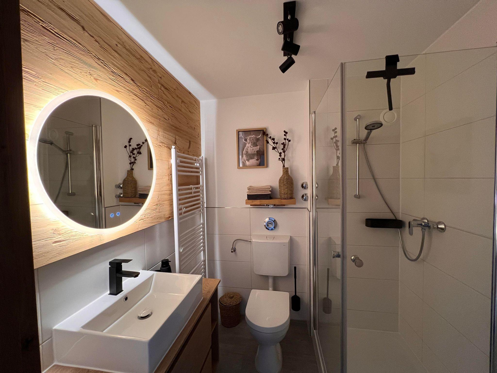 Das moderne, neurenovierte Badezimmer begeistert mit einer großen Dusche, hochwertigen Armaturen und einem gemütlichen Design.