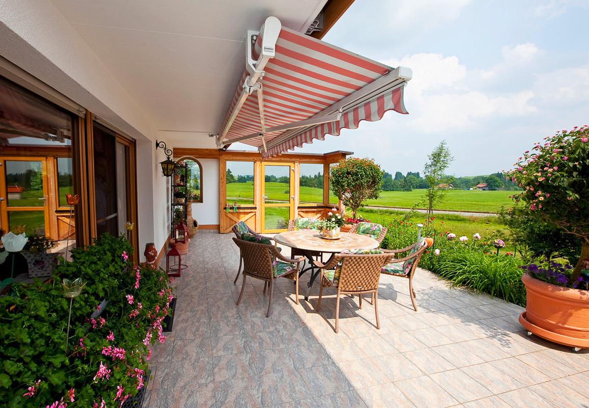 großzügige sonnige Süd-Terrasse mit Markise und schönem Blick ins Grüne und in die Berge, Sitzgruppe für 6 Personen + 1 Liegestuhl