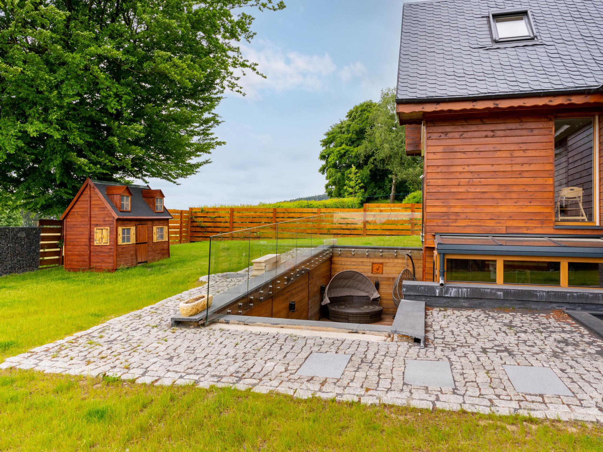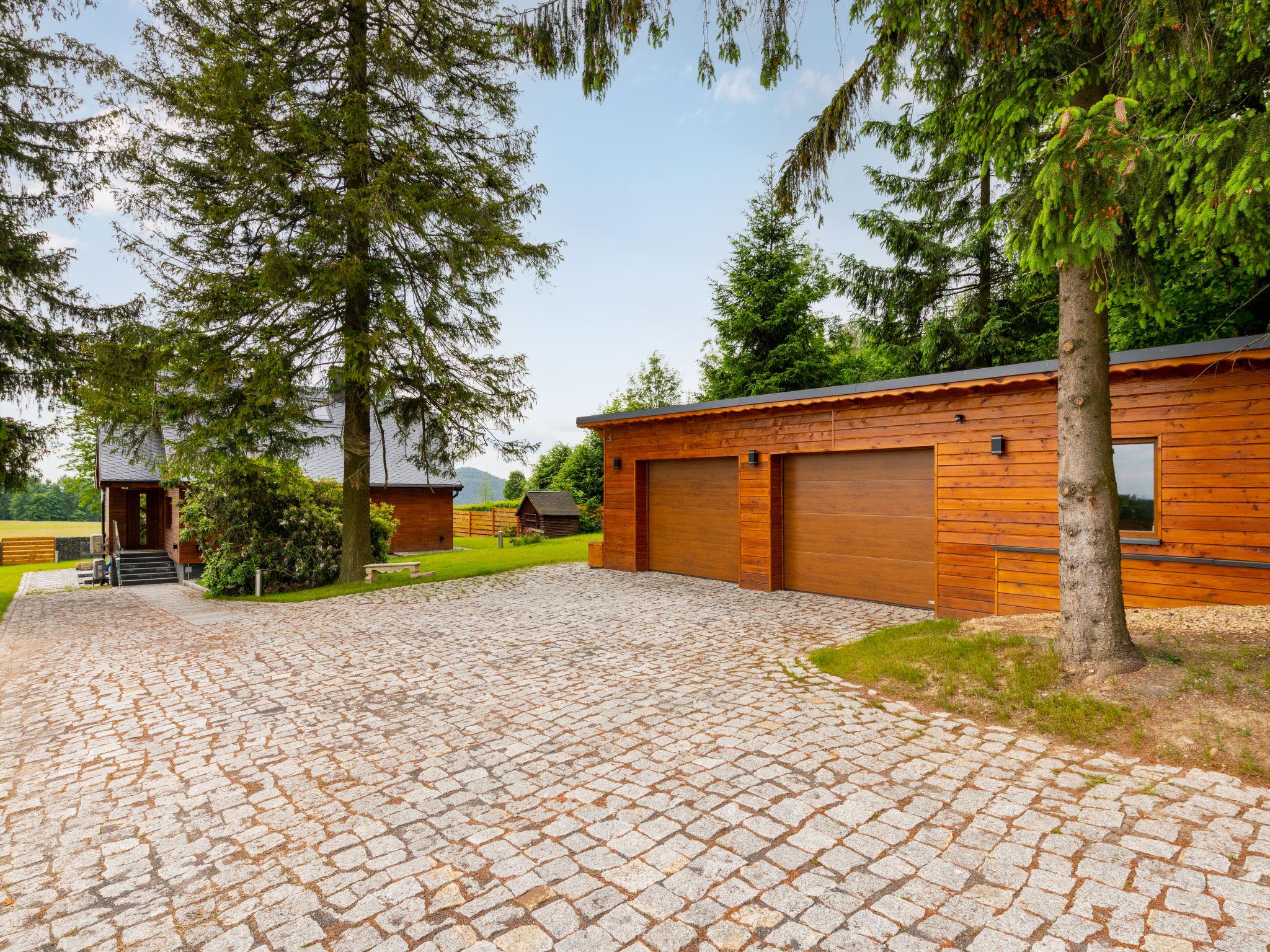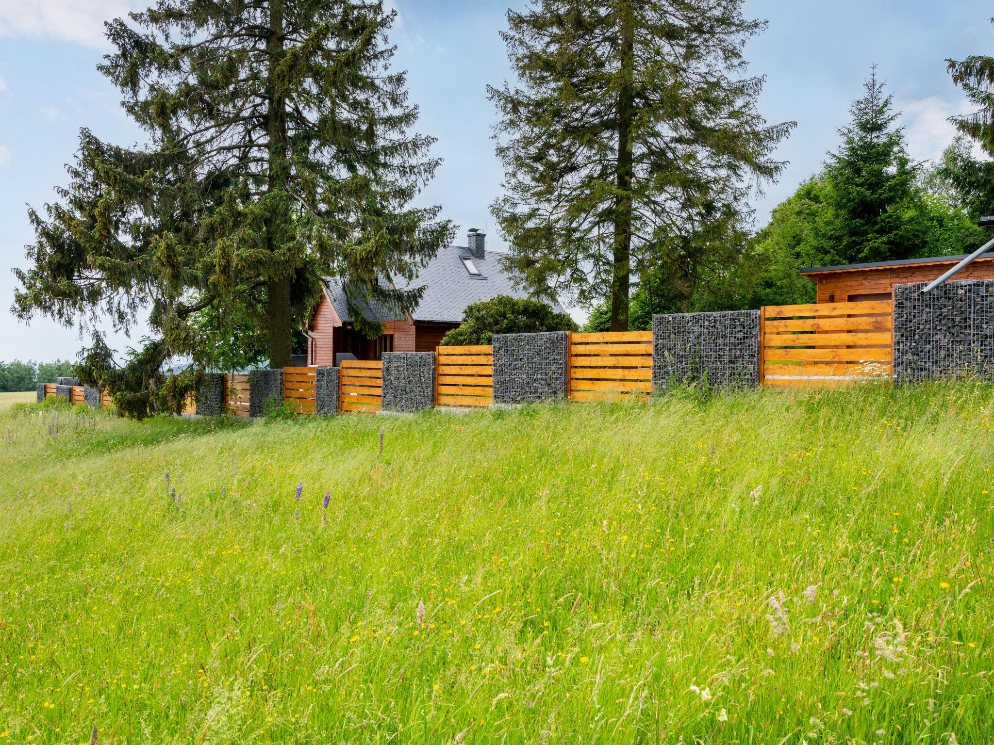 Very beautiful, comfortable timber house "Jeschkenpanorama", renovated in 2021, surrounded by trees, meadows and fields. On the outskirts, 1 km from the centre of Lückendorf, in a quiet, sunny position, 150 m from the edge of the forest, in the countryside. Private: property 1'000 m2 (fenced), large, well-kept garden with lawn and wildlife garden. Barbecue, children's playground. In the house: air conditioning, burglar alarm system. Room cleaning weekly (extra). Bread roll service on request. Parking (for 2 cars) at the house, single garage. Grocery 3 km, supermarket 5 km, restaurant 20 m, bakery 100 m, café 3 km, bicycle rental 12 km, bus stop "Lückendorf Hochwaldblick" 200 m, railway station "Zittau Bahnhof" 11 km, outdoor swimming pool 5 km, bathing lake 6 km. Nearby attractions: Berg Oybin 3 km, Basilika Jablonné v Podještedí 3 km. Well-known ski regions can easily be reached: Hain 3 km. Well-known lakes can easily be reached: Olbersdorfer See 5 km.