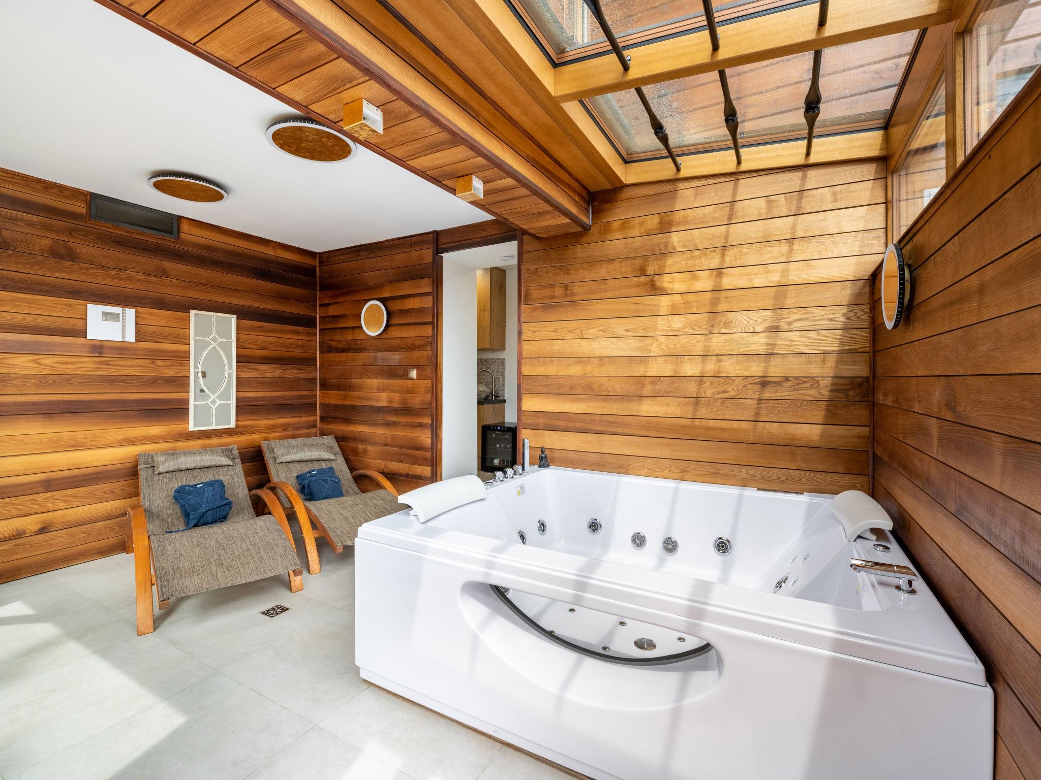 5-room house 130 m2 on 3 levels. Antique and tasteful furnishings: living/dining room with cable TV and international TV channels (flat screen), radio and electric shutters. Open kitchen (oven, dishwasher, 4 ceramic glass hob hotplates, kettle, microwave, freezer, electric coffee machine, steamer) with dining table. Sep. WC. On the lower ground floor: shower, hydro massage bath, Sauna. Upper floor: with sloping ceilings, 1 room with panoramic window with 1 double bed, cable TV and international TV channels (flat screen), radio and electric shutters. 1 room with 2 beds (80 cm, length 180 cm), cable TV, international TV channels, flat screen and electric shutters. Bath/shower/bidet/WC. Forced-air heating. Parquet floors. Large terrace 15 m2, patio. Terrace furniture, deck chairs (2). Panoramic view of the countryside. Facilities: washing machine, safe, iron, children's high chair, baby cot, hair dryer. Internet (WiFi, free). Please note: non-smoking house. Maximum 2 pets/ dogs allowed. Smoke alarm. Extras: fully automatic coffee machine, Pay TV (Magenta, Netflix), wine refrigerator (billing based on consumption on site).