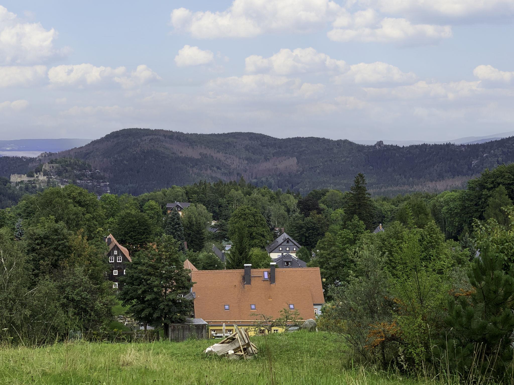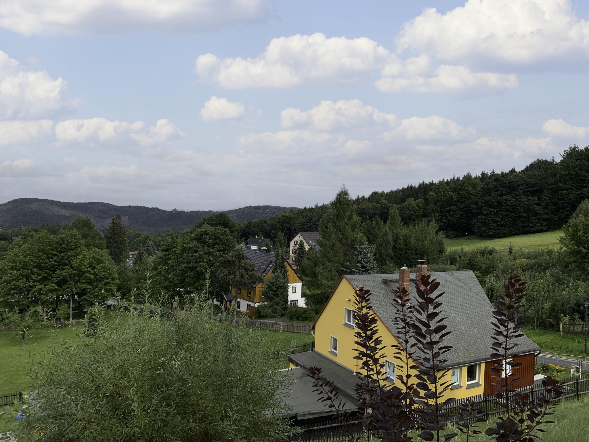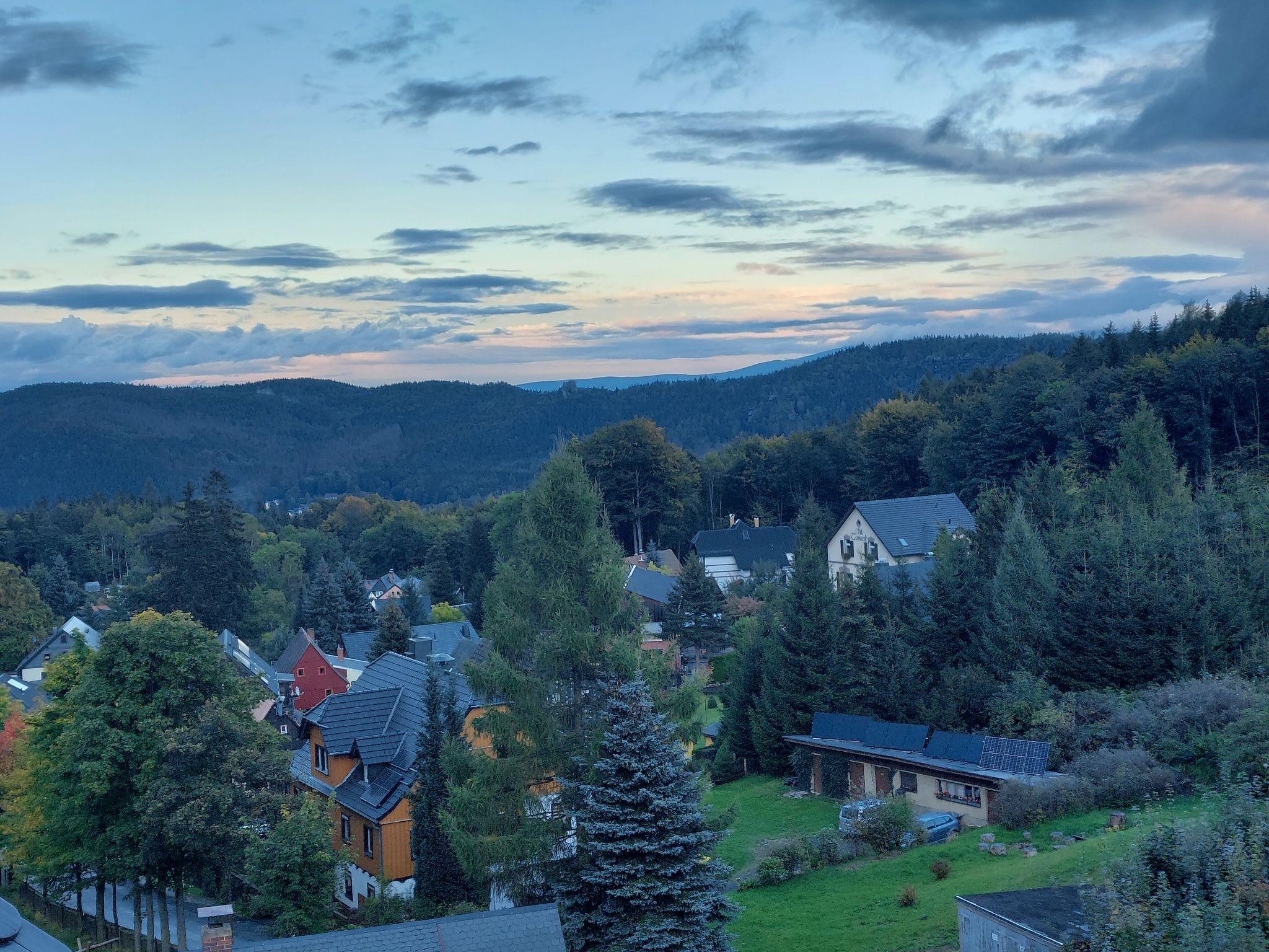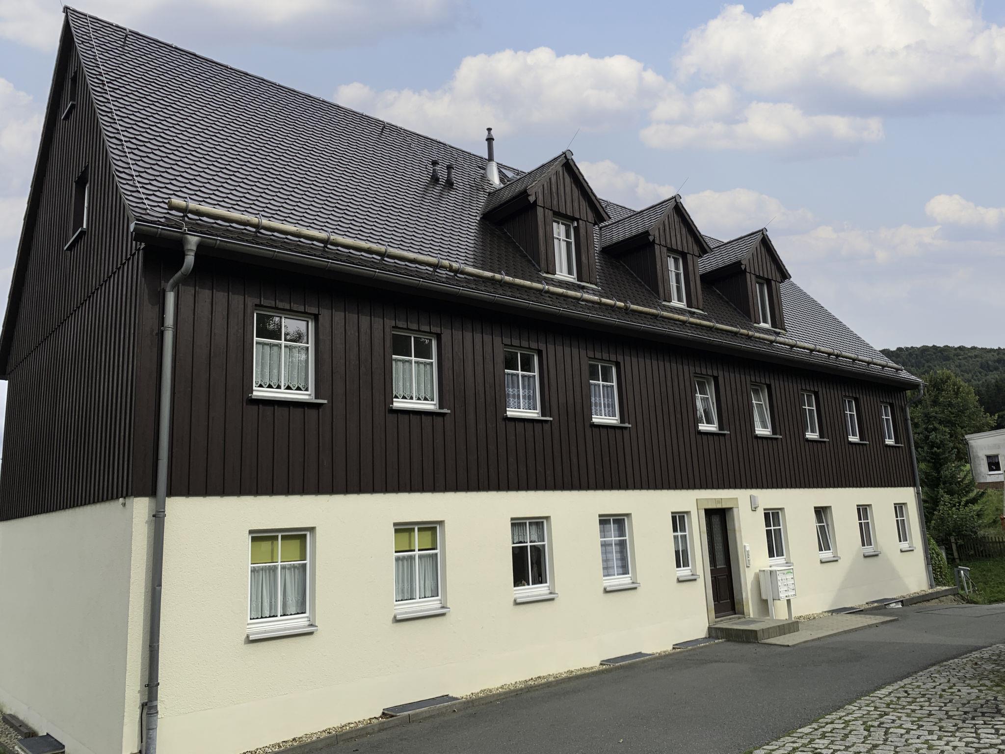 Apartment house "Räuberhauptmann Karasek", 3 storeys. In the district of Hain 3 km from the centre of Oybin, 10 km from the centre of Großschönau, 11 km from the centre of Zittau, on a slope, in the residential district. Parking at the house. Supermarket 5 km, restaurant 20 m, café 300 m, bus stop "Oybin,Ortsteil Hain" 300 m, railway station "Zittau Bahnhof" 12 km, outdoor swimming pool 5 km. Ski lift 500 m.