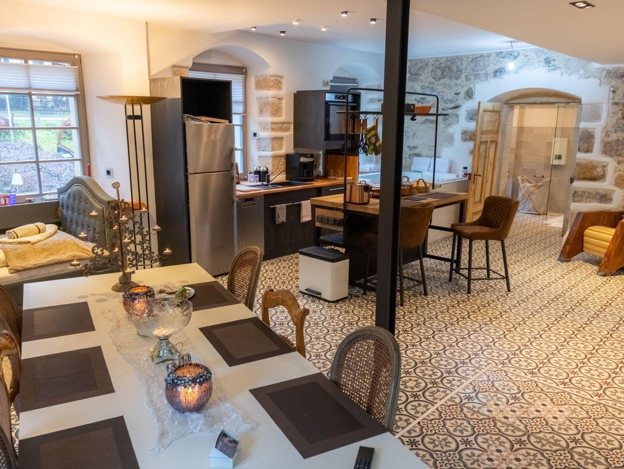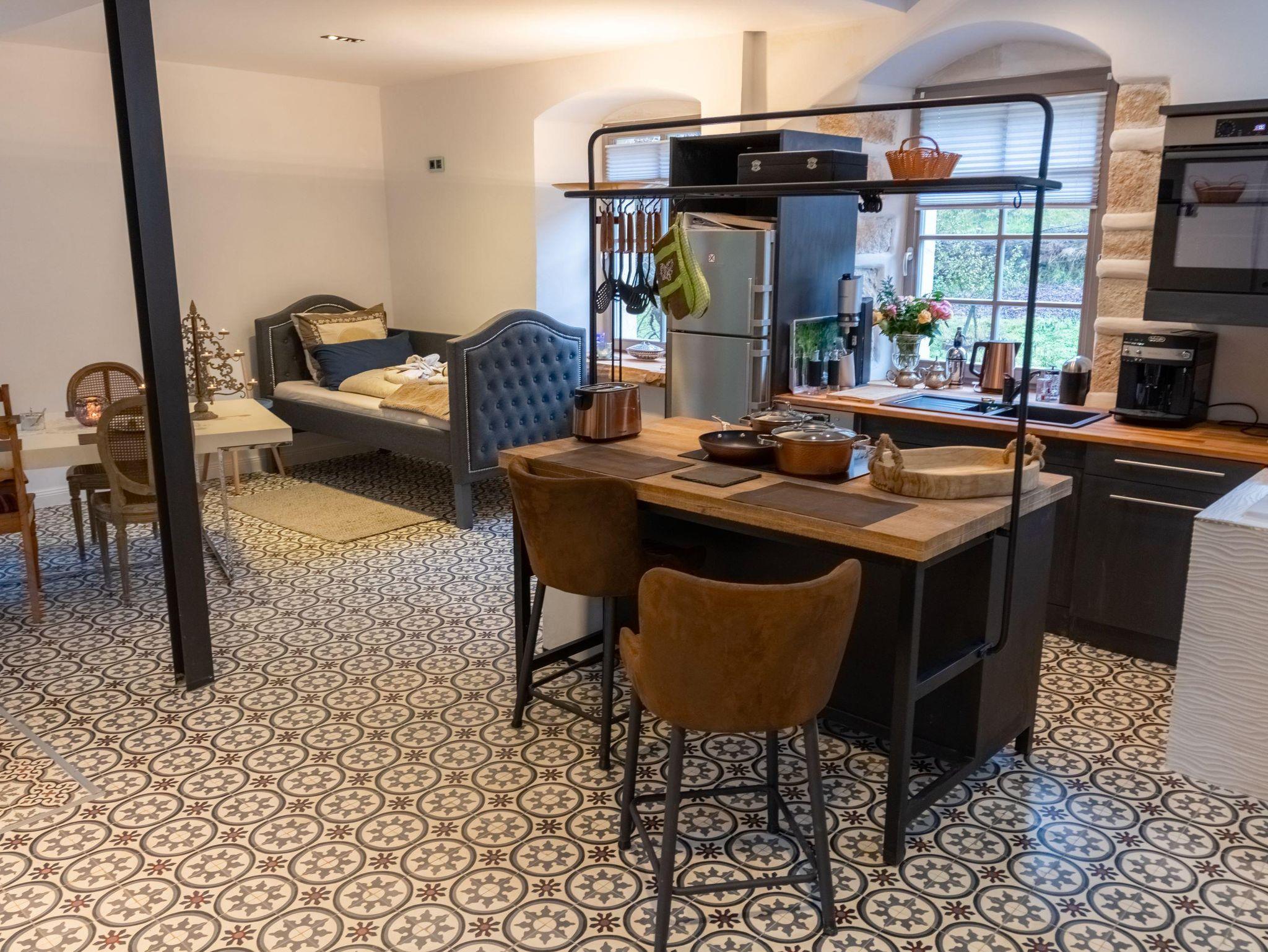 • voll eingerichtete offene Küche mit Mikrowelle, Backofen, Ceranfeld, Toaster, Wasserkocher, Mixer, Kaffeemaschine und Kaffeevollautomat, Soda-Stream, Kühlschrank, Tee und Kaffee von Julius Meinel, Weinkühlschrank
