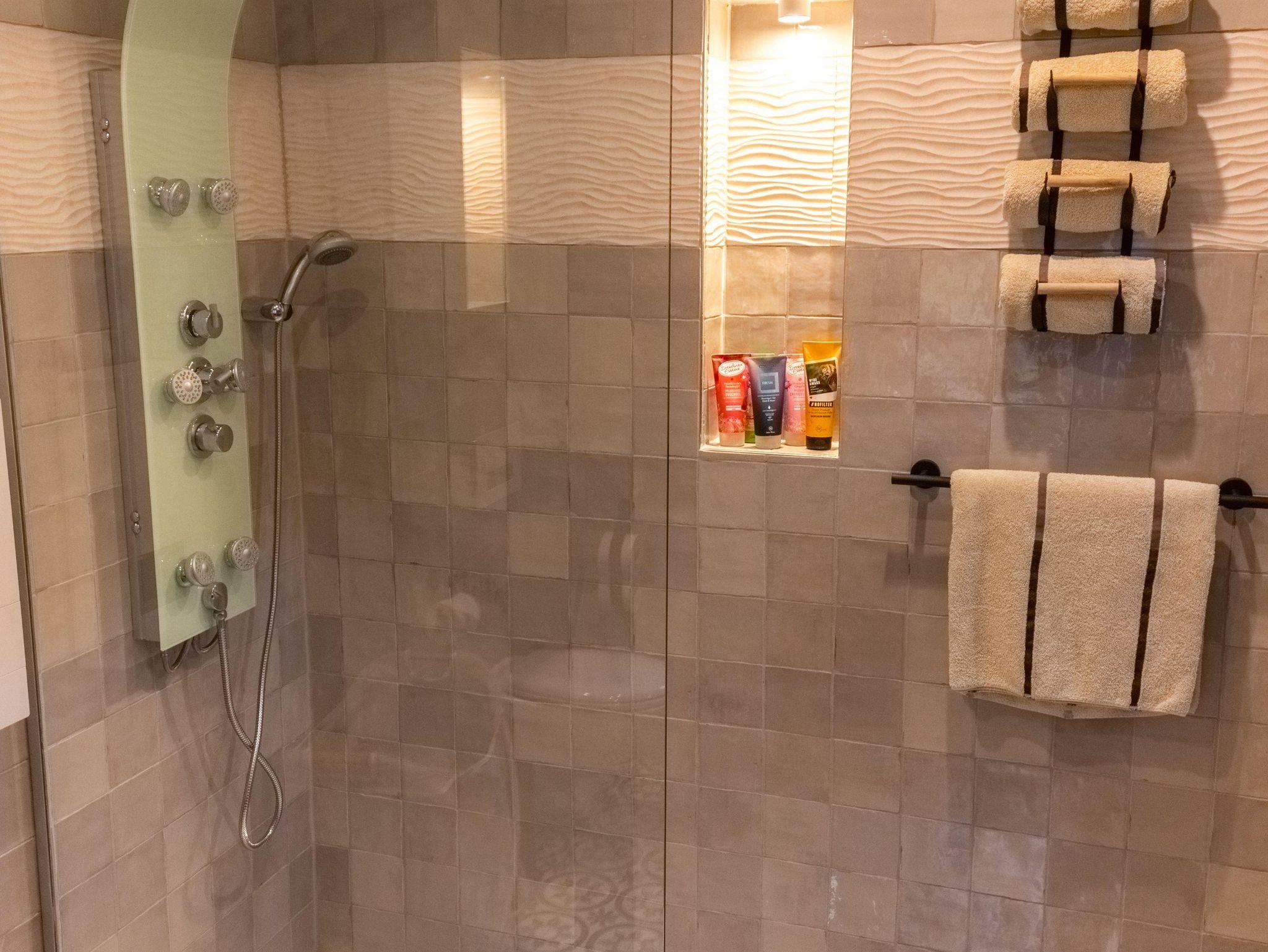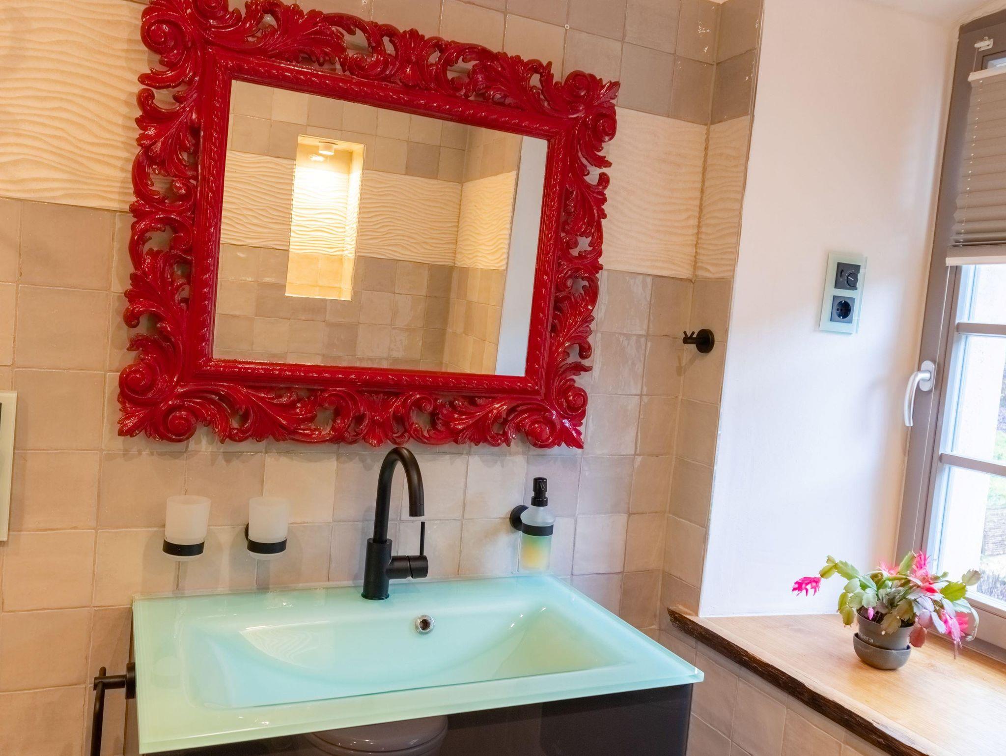 • modernes Bad mit Fenster und ebenerdiger Dusche, WC