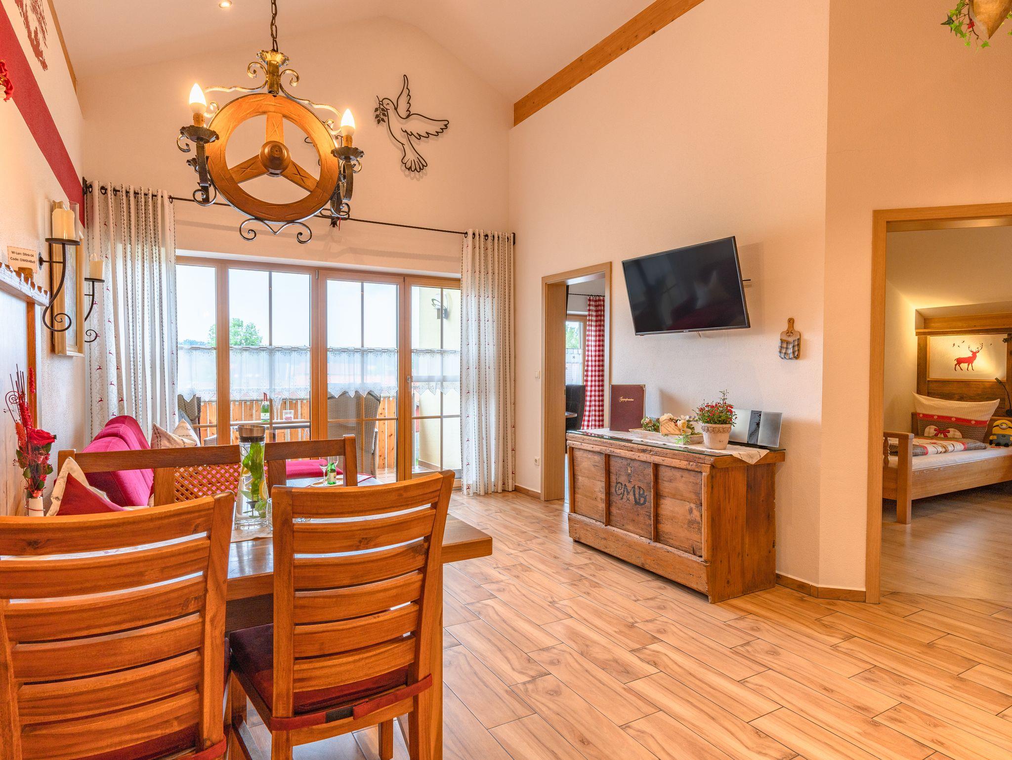 Unsere hochwertige 5 Sterne Ferienwohnung Hüttenzauber befindet sich im 2. Stock und bietet mit Ihren ca. 65 m² genügend Platz für 2-5 Personen. Die liebevoll eingerichtete Ferienwohnung verfügt über zwei getrennte Schlafzimmer, einer Empore im Wohnraum sowie einem großen Balkon mit Blick auf die Bayerischen Alpen. Die hochwertig ausgestattete Wohnung ist in einem alpenländischen Stil eingerichtet, die keine Wünsche offenlässt.