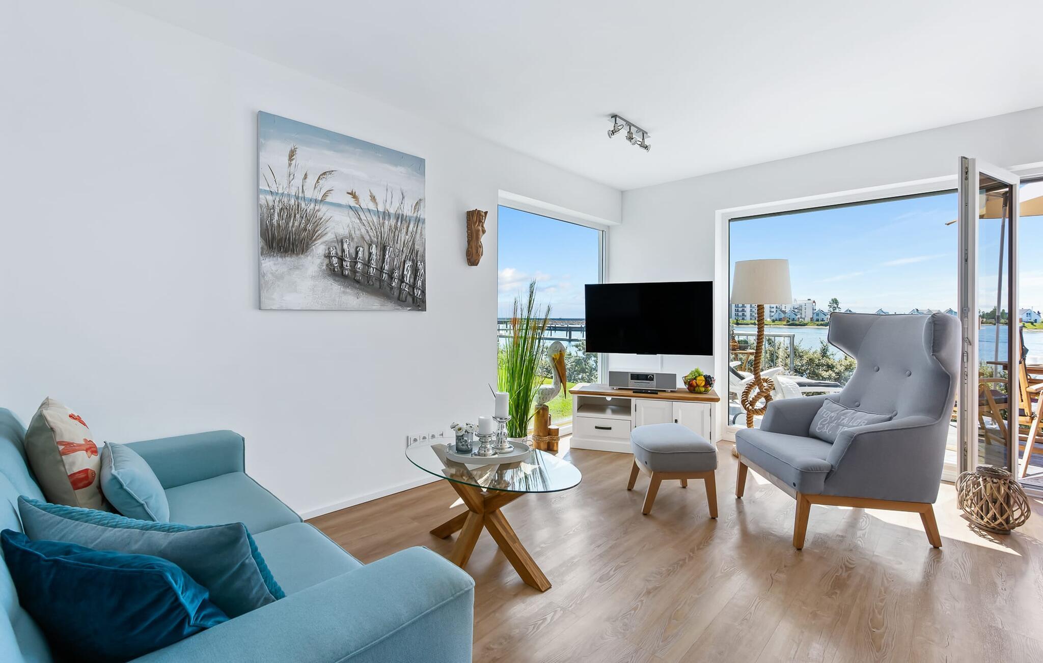 Fantastisk udsigt åbner op fra opholdsstuen og på den tilstødende terrasse med udsigt over lystbådehavnen. Havnebiografen sørger for underholdning under en hyggelig grillaften eller en romantisk middag i levende lys.