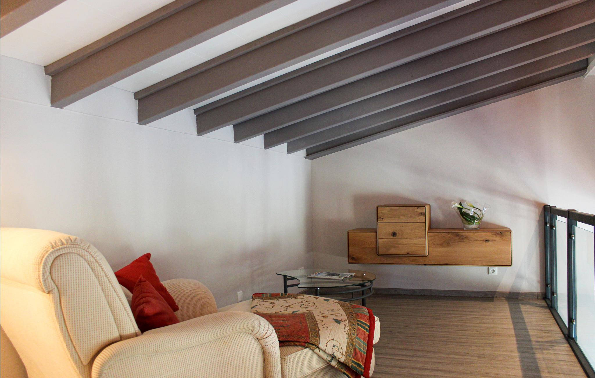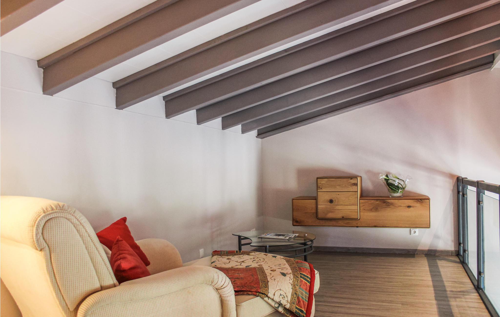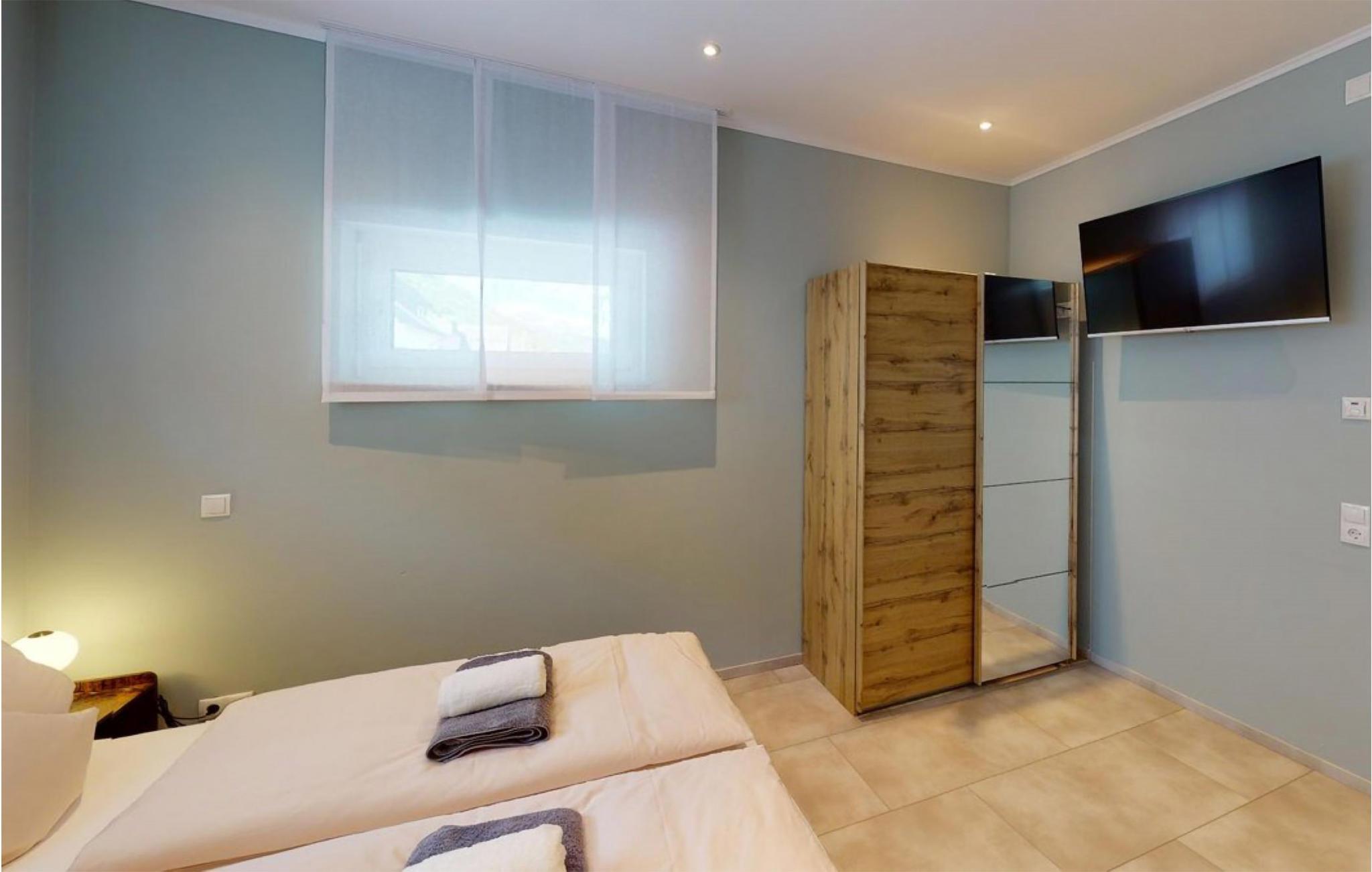 Fra stuen kan I nyde den fantastiske udsigt eller tilbringe hyggelige aftener foran den elektriske pejs med varmefunktion. En gang fører til soveafdelingen med to soveværelser, hver udstyret med dobbeltseng og smart-tv. Det ene soveværelse har et tilhørende badeværelse, det andet er tilgængeligt via gangen. Der er et tredje smart-tv i stuen og gratis WiFi.