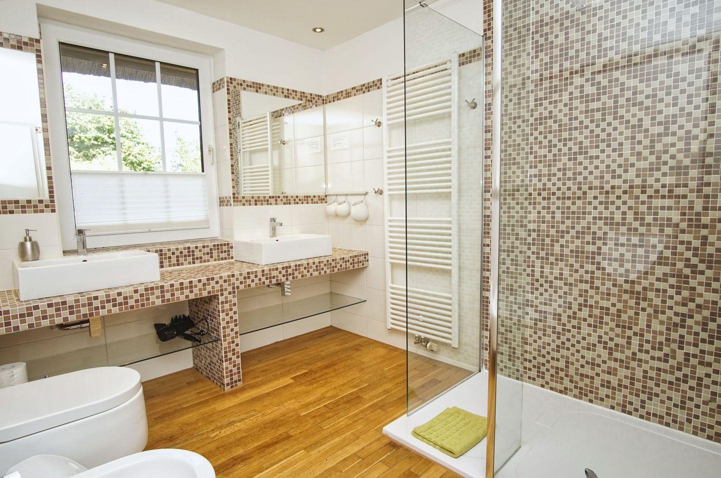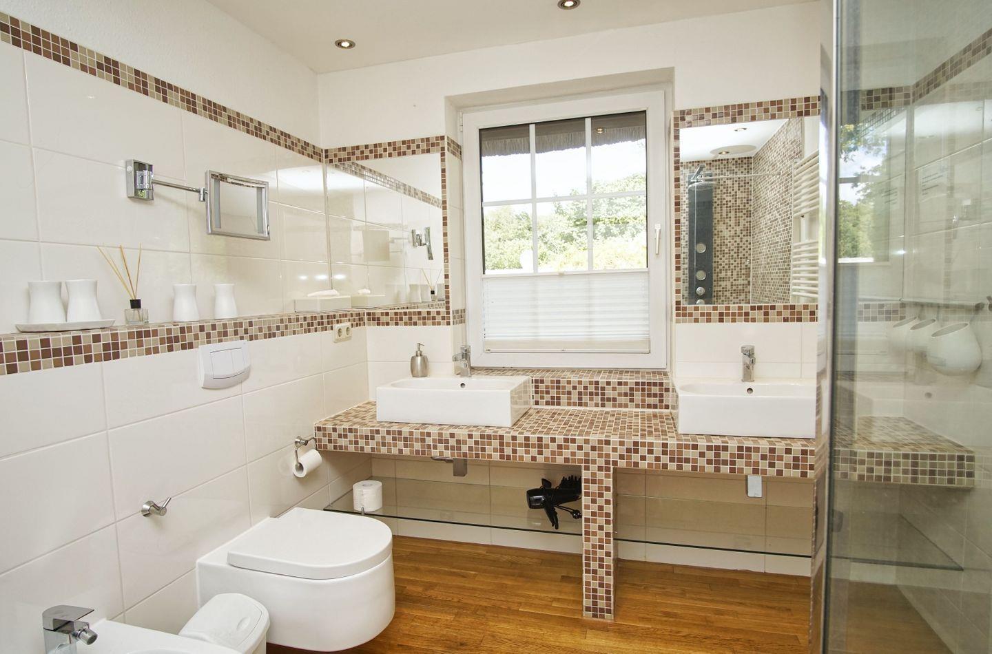 BAD // ein Tageslicht-Badezimmer mit Dusche, WC und Waschtisch, ein Tageslicht-Badezimmer mit Dusche, WC, Bidet, Steh-WC und Waschtisch ++
