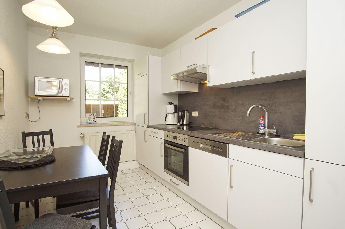 KÜCHE // offene Küche mit Esstisch, Ceranfeld, Kühlschrank mit Gefrierfach, Backofen, Toaster, Wasserkocher, Kaffeemaschine, reichlich Besteck, Geschirr und Küchenutensilien ++