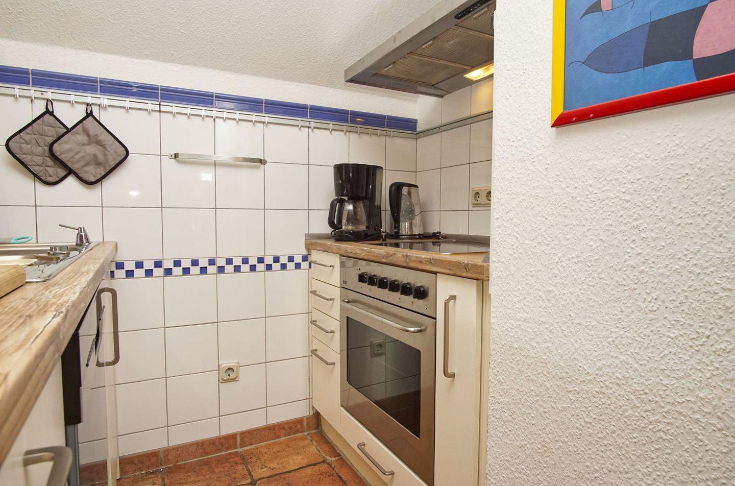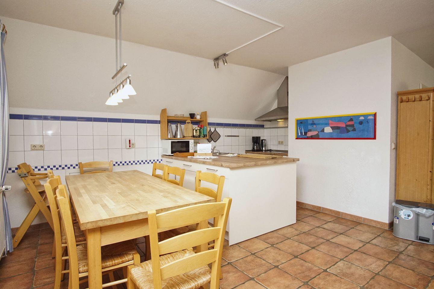 KÜCHE // offene Küche mit Esstisch, Ceranfeld, Kühlschrank mit Gefrierfach, Backofen, Toaster, Wasserkocher, Kaffeemaschine, reichlich Besteck, Geschirr und Küchenutensilien ++
