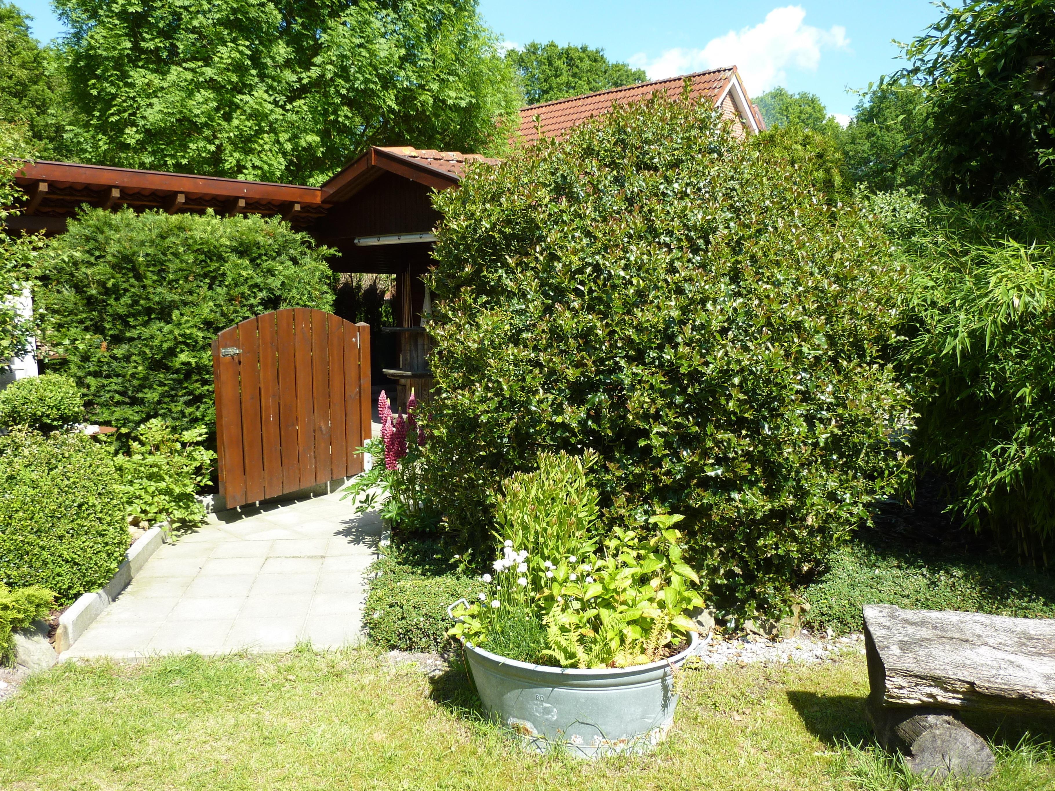 Im Garten vergessen Sie schnell den Alltag. Das große Grundstück ist Bestandteil eines Ferienparks und grenzt unmittelbar an ein Naturschutzgebiet.