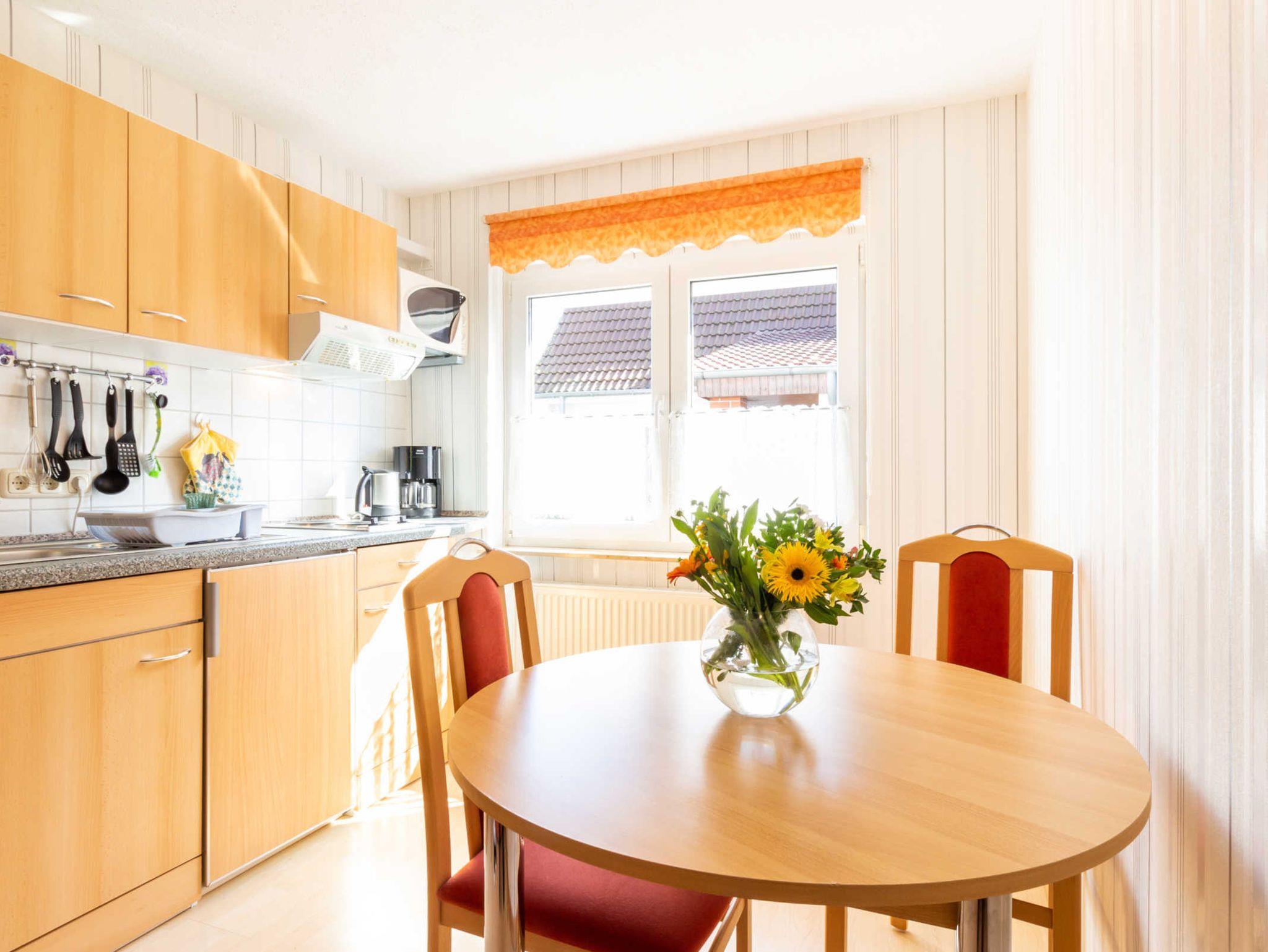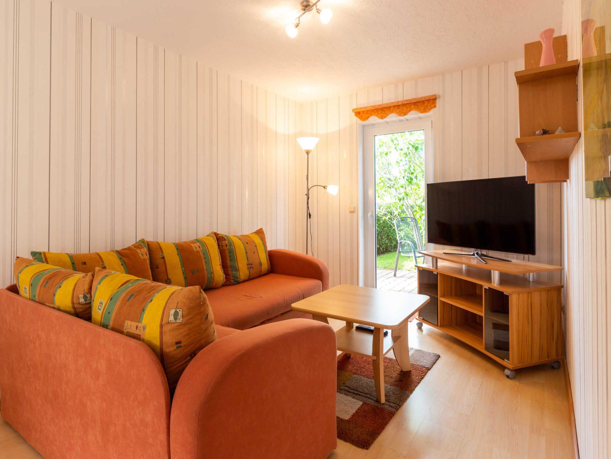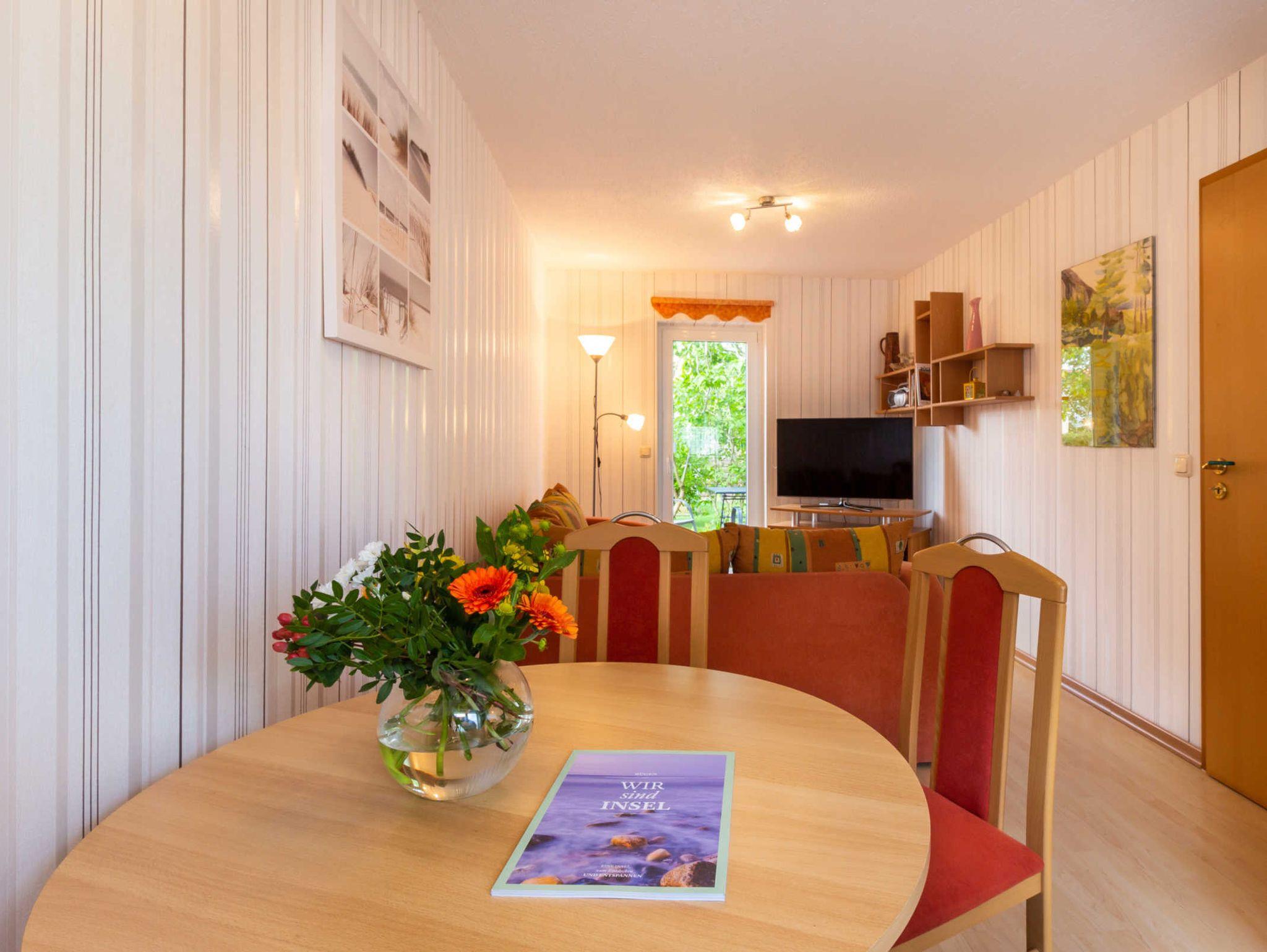 Die Unterkunft hat einen separaten Eingang. Vom Flur gelangen Sie in den offenen Wohn- und Essbereich mit Zugang zur Terrasse, in das Tageslichtbad sowie in das Schlafzimmer. Im Wohnbereich finden Sie eine gemütliche Sitzecke (Aufbettung auf der Couch für die 3. Person) und einen LCD-TV. Die Küchenzeile ist ausgestattet mit einem Kühlschrank, 2 Platten-Herd, einer Dunstabzugshaube, einer Mikrowelle, einer Kaffeemaschine und einem Wasserkocher. Ein separater Esstisch lädt zum Frühstücken ein. Das Schlafzimmer besitzt ein bequemes Doppelbett (durchgehende Matratze) sowie einen Kleiderschrank. Das Tageslichtbad mit Dusche und WC runden das geschmackvoll eingerichtete Ferienhaus ab. Die sonnige Terrasse mit Blick in den Garten befindet sich auf der Rückseite des Ferienhauses (Zugang vom Wohnraum). Ihr Auto können Sie auf der Zufahrt parken und Ihre Fahrräder finden unter dem Carport Ihren Platz.