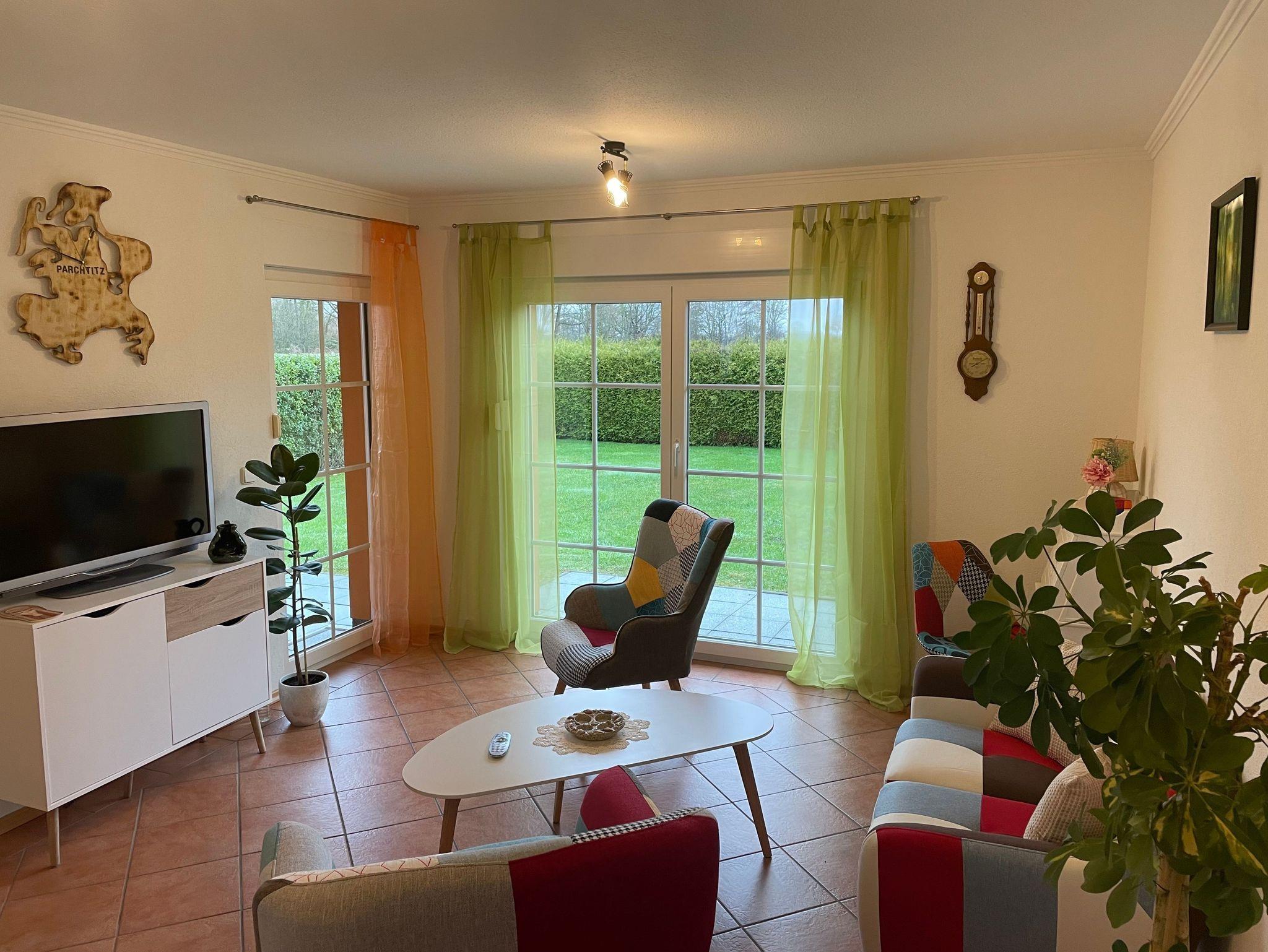 Die modern und hell eingerichtete Ferienwohnung verfügt über einen Flur, von diesem abgehend befindet sich die komplett ausgestattete Einbauküche mit Esstisch. Ein großes Wohnzimmer mit gemütlicher Couch sowie eine Schlafgelegenheit für die 3 Person auf einer Schlafcouch erwartet Sie. Vom Wohnzimmer glangen Sie auf die Terrasse mit Gartenwiese. Ein separates Schlafzimmer mit einem Doppelbett läßt Sie im Urlaub zur Ruhe finden. Das Bad ist mit Dusche, WC und Waschbecken ausgestattet. Die Ferienwohnung wurde 2024 komplett neu renoviert und eingerichtet.