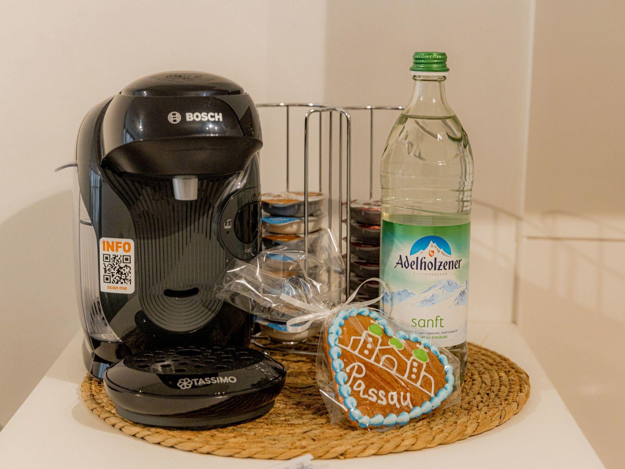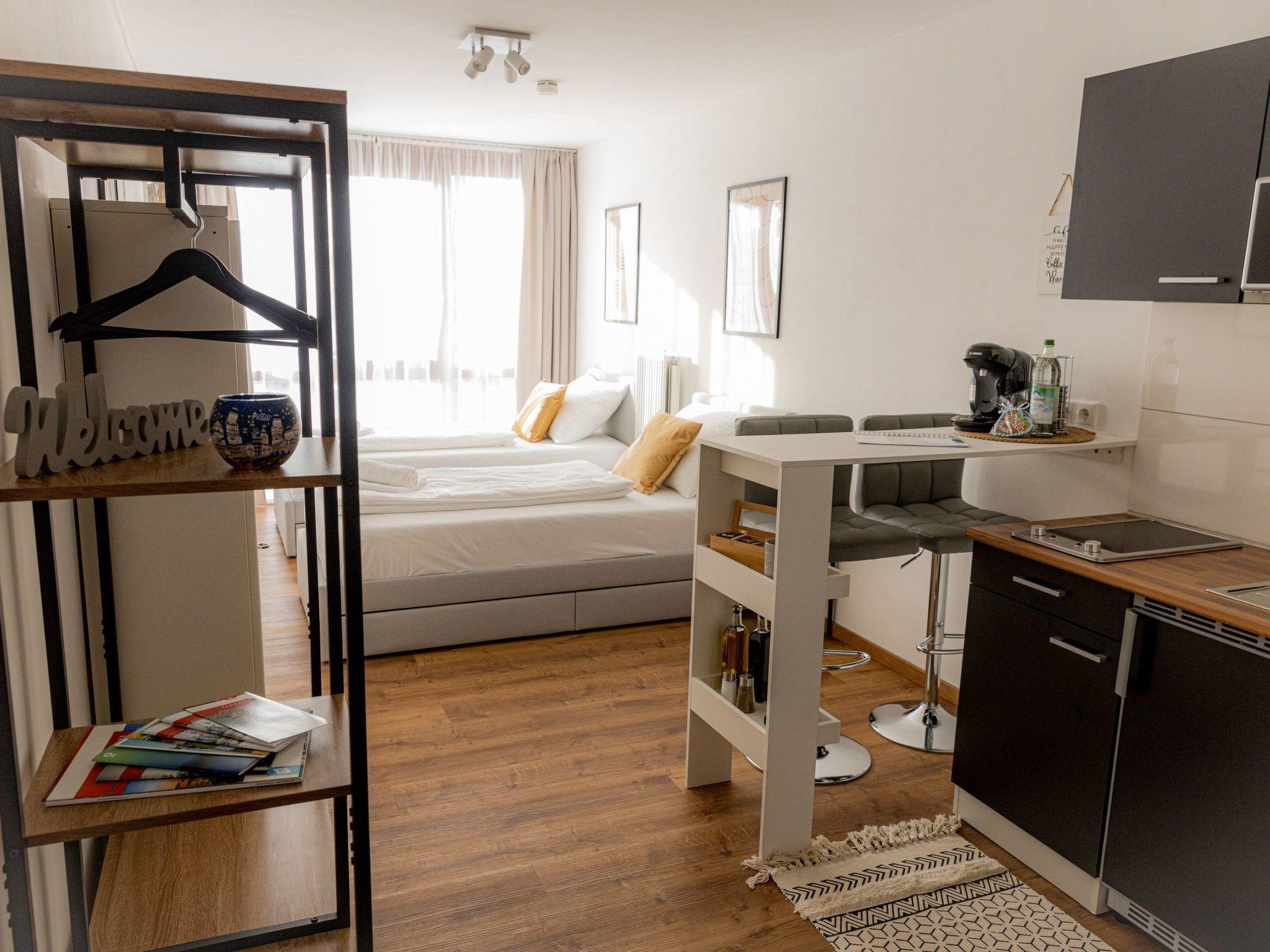 Welcome to your short-term home from COME4STAY Your apartment is centrally located in Passau, within walking distance of the city centre and the train station. The numerous charming shops with handmade specialities, branches of popular and exclusive brands, small designer studios and large shopping centres are also in the immediate vicinity. You will be staying in a stylish and modernly furnished 1-room flat with two single beds, bathroom with shower/WC, private car park, free WiFi, flat-screen SmartTV with NETFLIX and fully equipped kitchen including ceramic hob, fridge and bar counter with bar stools. The ideal flat for a private or business stay in Passau. The bright flat is just 1.6 km from the city centre. Fresh towels and bed linen, as well as shampoo and shower gel are provided. The modern open-plan kitchen is equipped with a coffee machine, kettle, microwave and toaster.