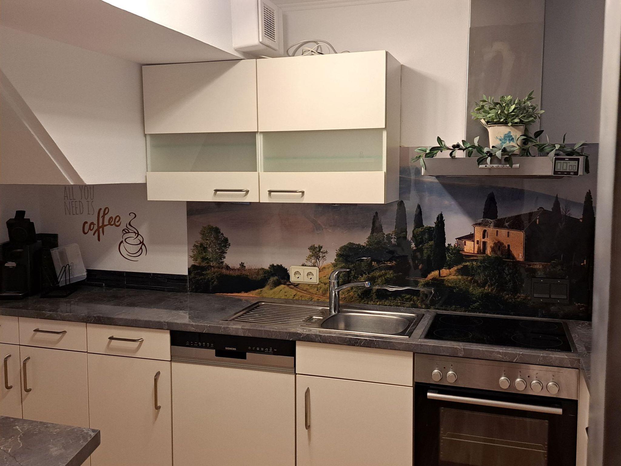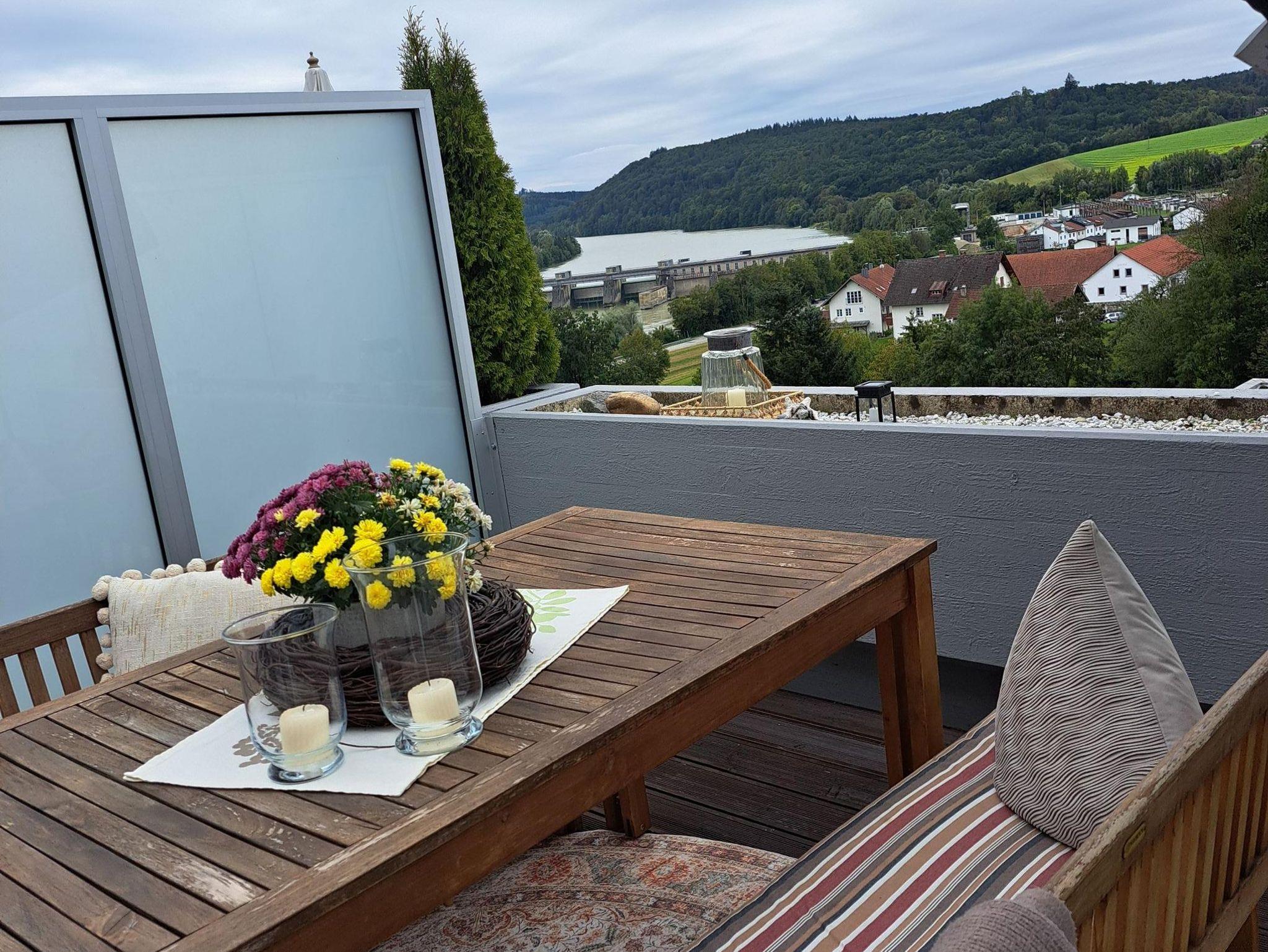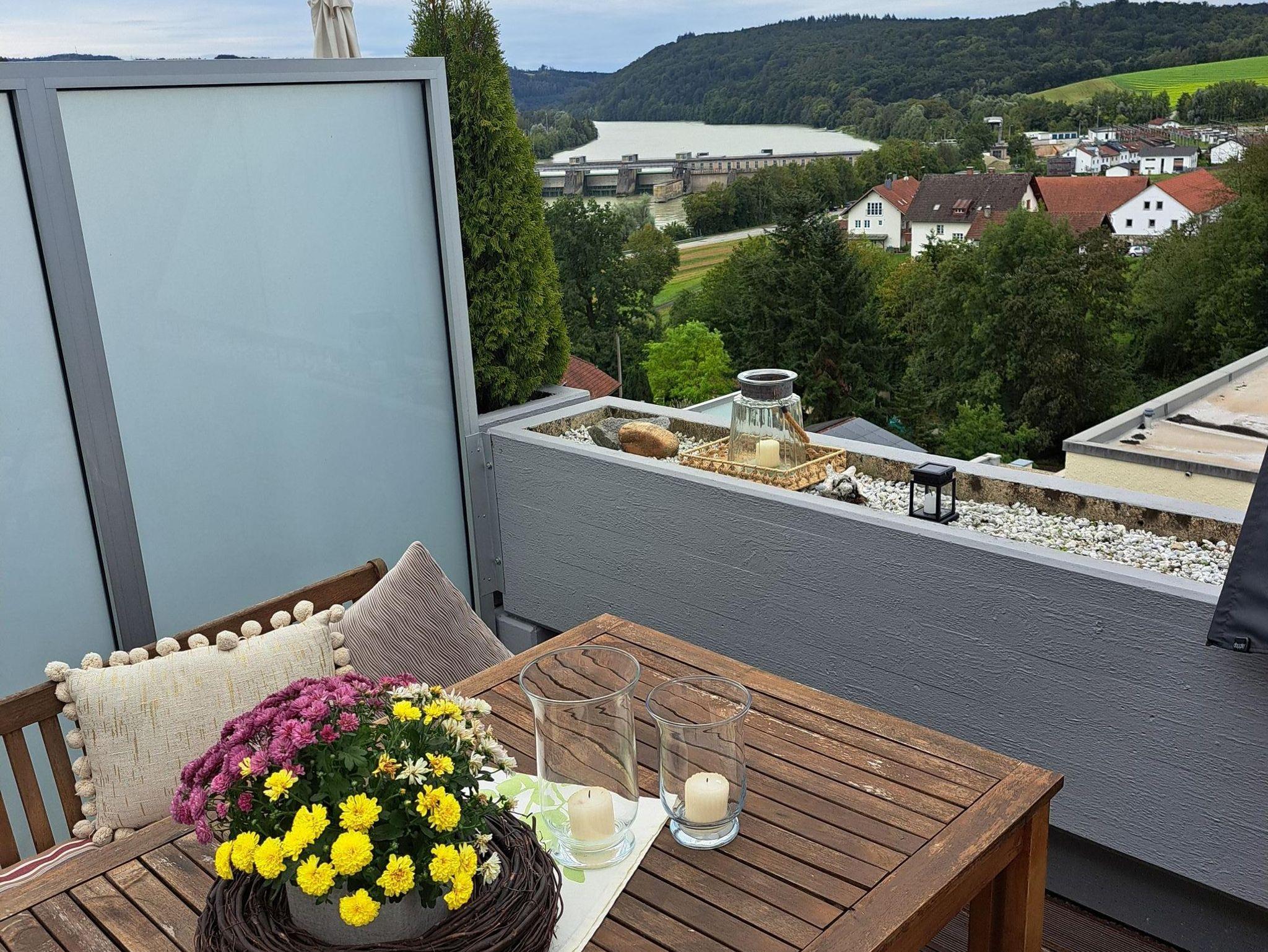 Die Wohnung ist bequem vom Hauseingang mit dem Aufzug oder einer Treppe erreichbar. Im ersten Stock der Maisonette Wohnung befindet sich die geräumige Küche mit Spülmaschine, Kühlschrank und E-Herd, sowie das Wohnzimmer mit großem Ecksofa und Fernseher sowie einer Musikanlage (ALEXA). Ein Esstisch für 4 Personen ergänzt den offen gestalteten Wohnraum. Die großzügige Terrasse, mit einem herrlichen Blick, über den Inn ist über eine Balkontüre bequem erreichbar. Auf Terrasse befindet sich ein großer Esstisch, sowie zusätzliche Stühle. Über eine Treppe in Innenbereich gelangt man in den oberen Stock der Maisonette Wohnung. Im oberen Stock befindet sich eine kleine Arbeitsecke mit Schreibtisch und Bürostuhl sowie das Bad mit Toilette, Waschbecken, Badewanne/Dusche und Waschmaschine. Das Schlafzimmer ist über eine separate Tür erreichbar. Im Schlafzimmer befindet sich das Doppelbett (180cm x200cm) und ein großer Wandschrank. Eine weitere kleine Terrasse lädt zum Verweilen ein. Zur Wohnung gehört ein PKW-Stellplatz der ca. 200m vom Wohnungseingang entfernt liegt. Der Weg vom PKW-Stellplatz zum Hauseingang ist durch eine Treppe und teilweise durch einen Aufzug möglich.