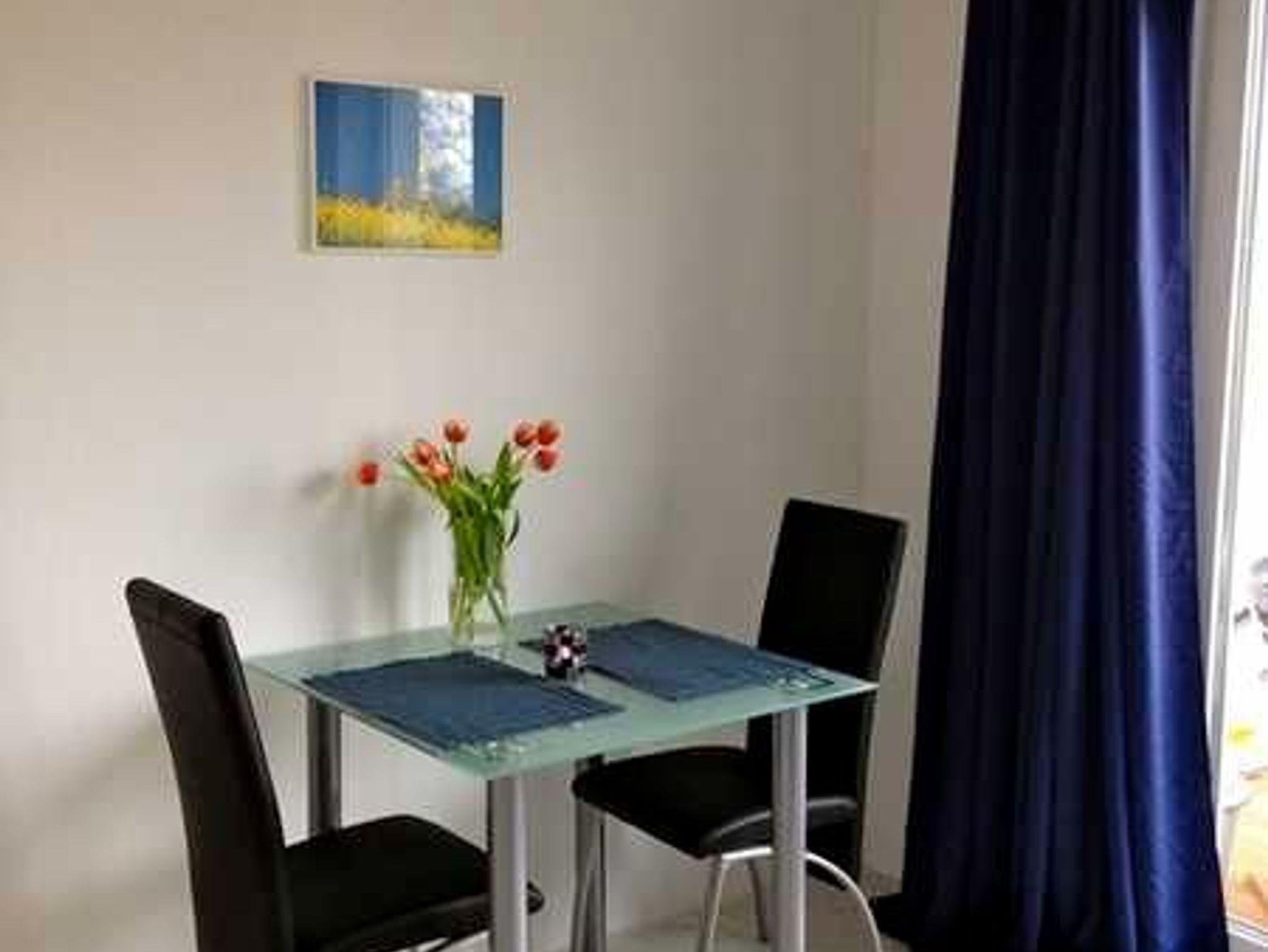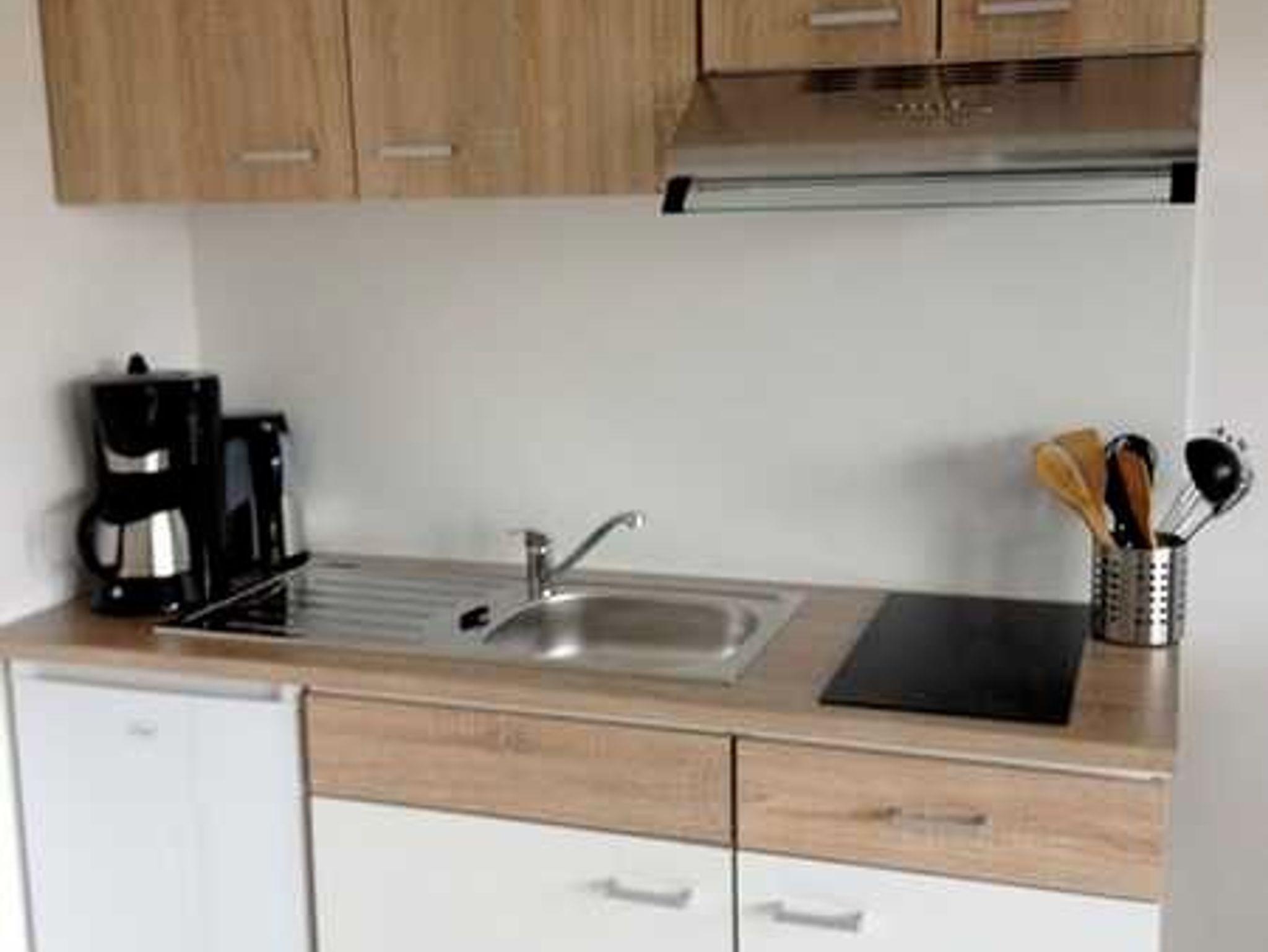 Das Appartement besitzt eine Küchenzeile mit einem 2er-Cerankochfeld, Kühlschrank mit Eisfach, Kaffeemaschine, Wasserkocher und Toaster. Auf der Terrasse steht ein Grill zu Ihrer Verfügung.