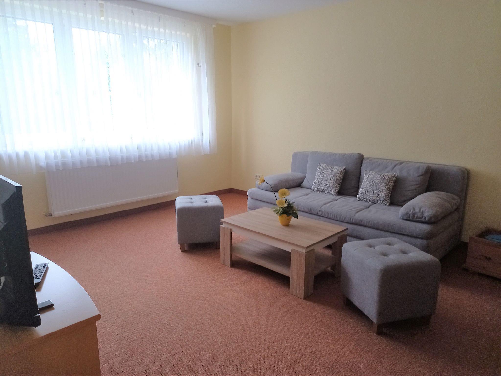 Die Ferienwohnung besteht aus einem Wohnraum mit Sitzgruppe (Schlafcouch) einem Schlafzimmmer mit Doppelbett, einer Küche mit Esstisch und einem Duschbad. Zu jeder Ferienwohnung gehört eine Terrasse. Auf dem großen Grundstück haben Sie Gelegenheit sich aktiv zu erhohlen.